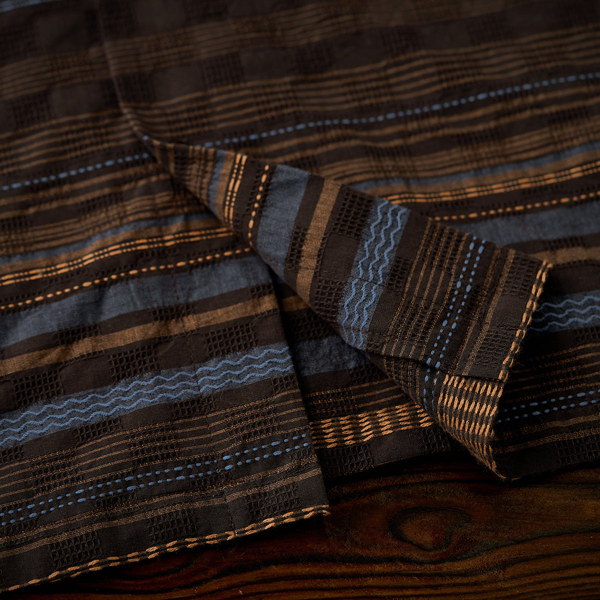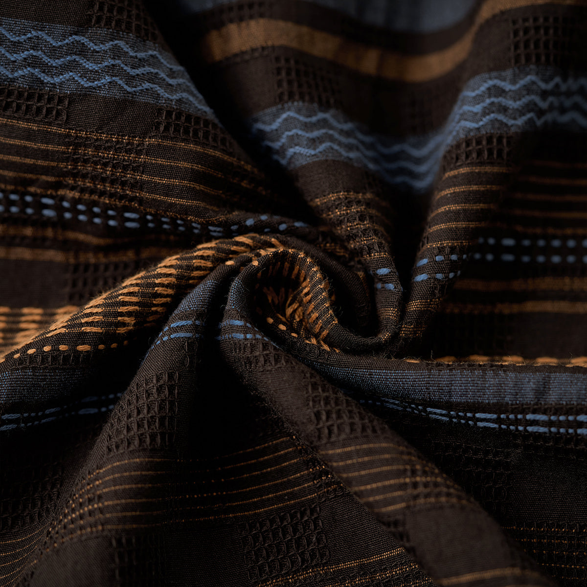 다양한 폭과 질감의 스트라이프와 세밀한 기하학·물결 패턴이 조화를 이루어 리듬감 있는 디자인을 만들고, 다크 커피 컬러에 블루와 오렌지 포인트를 더해 차분하면서도 감각적인 분위기를 연출합니다.