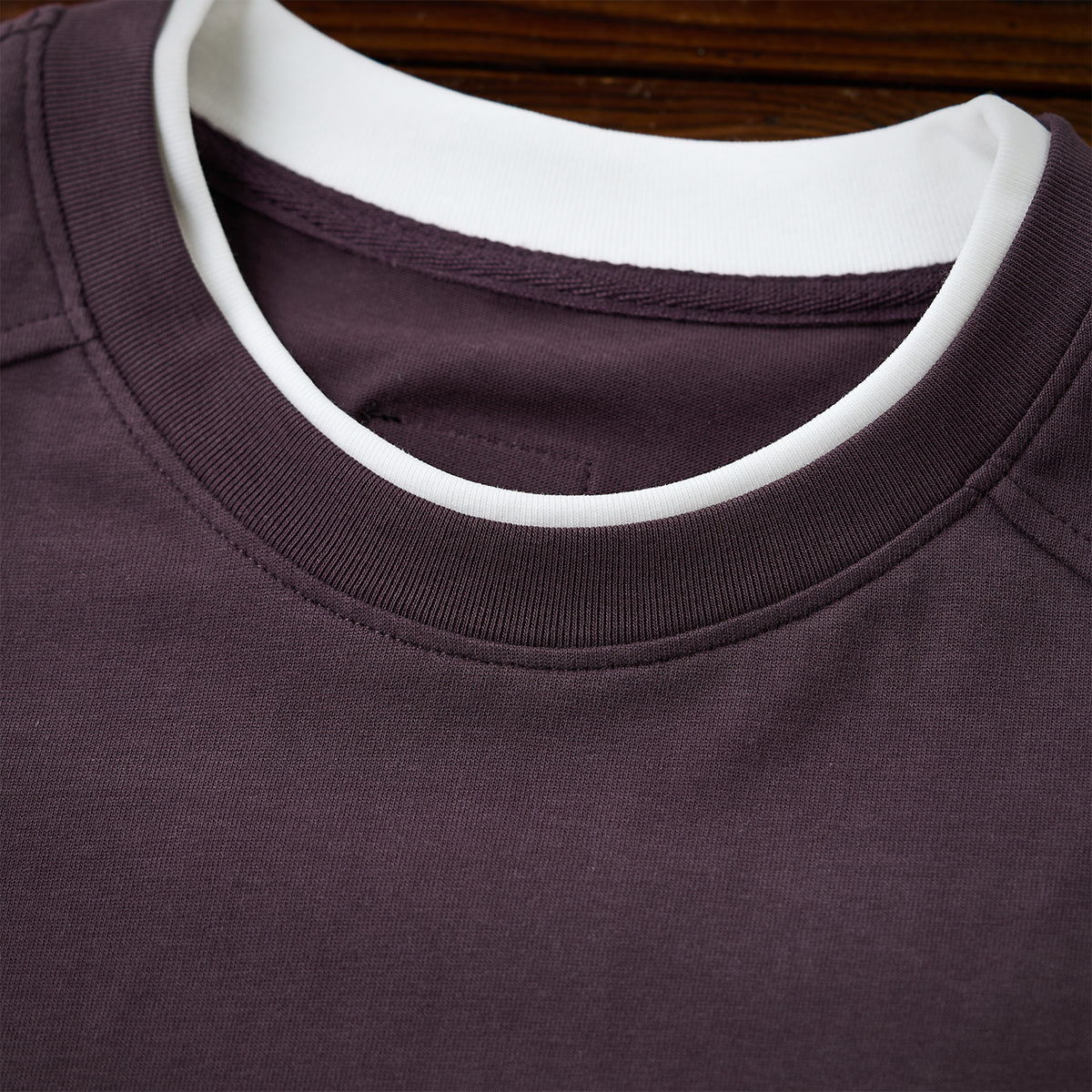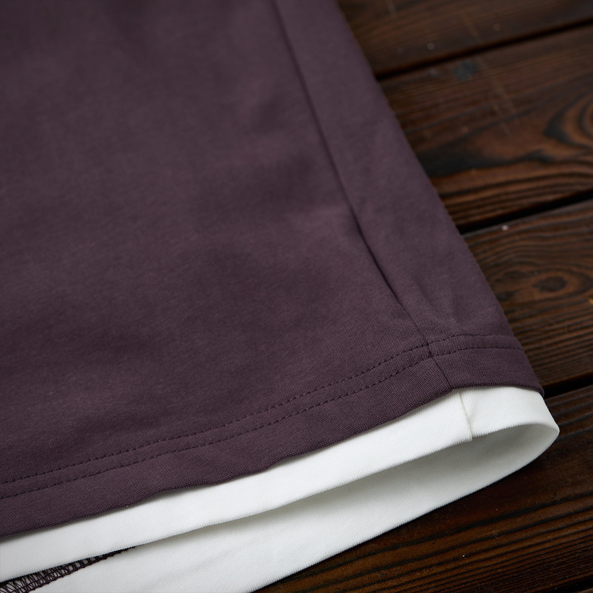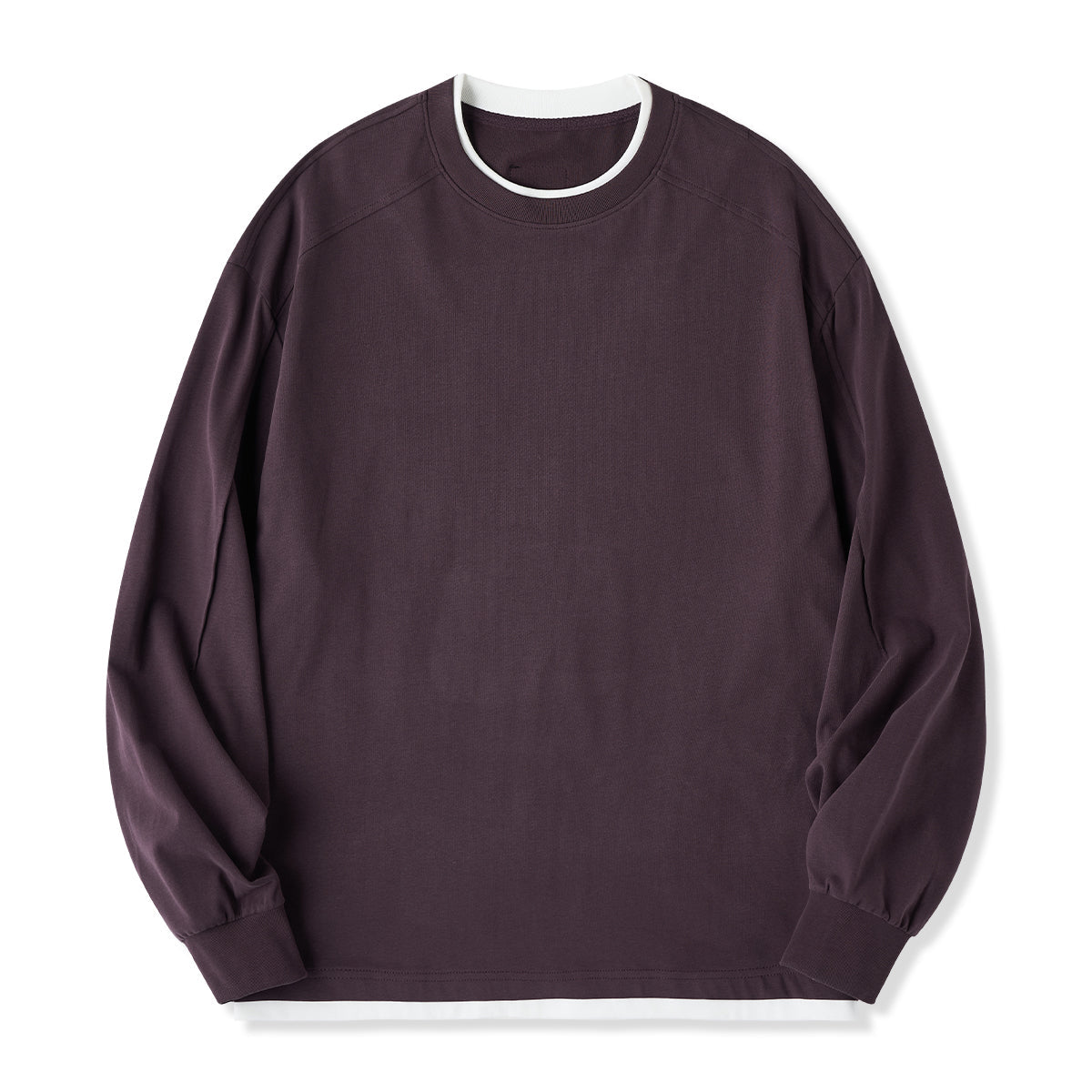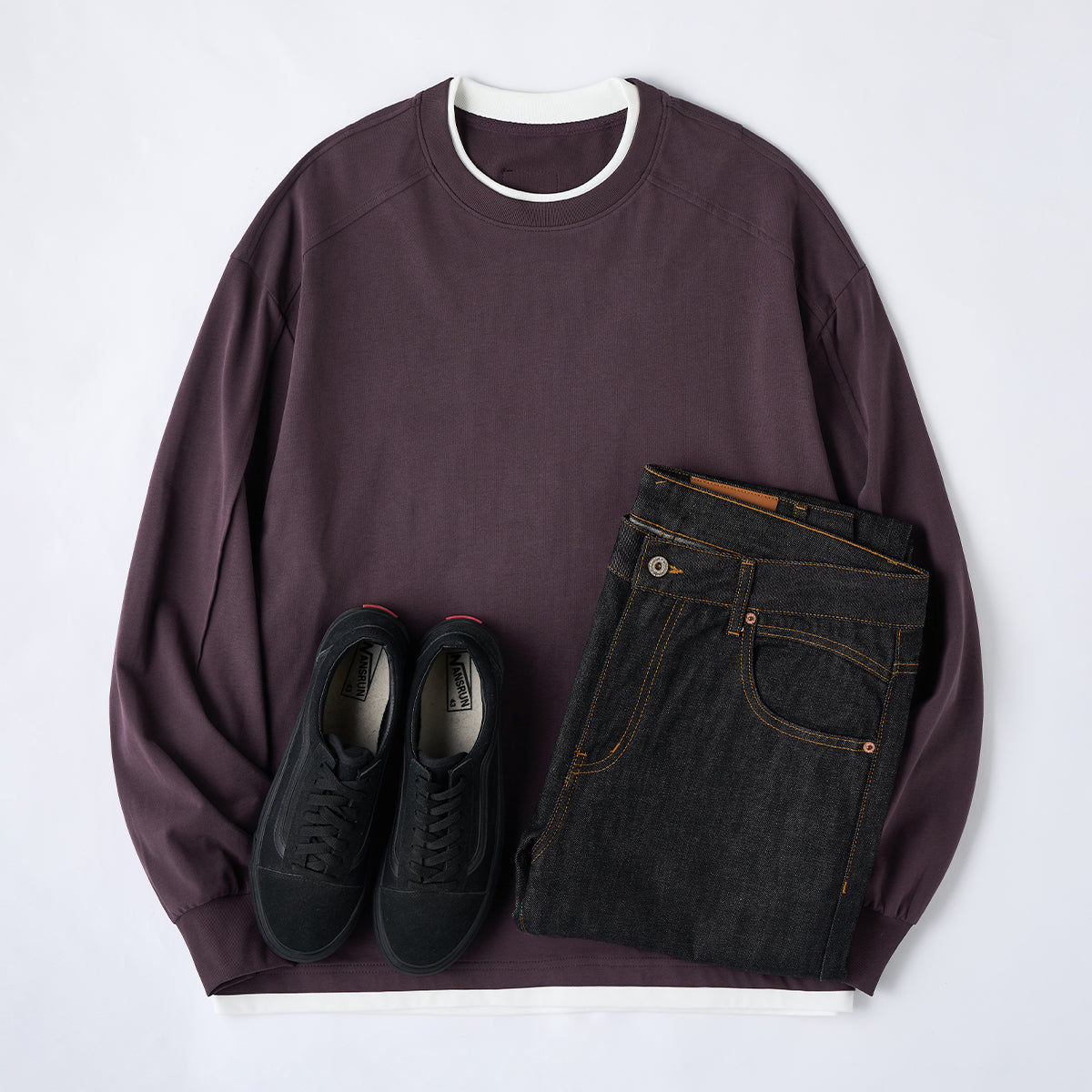 목과 밑단의 레이어드 디자인으로 깊이 있는 스타일을 완성한 롱티입니다. 라글란 슬리브로 편안함과 활동성을 더했습니다.