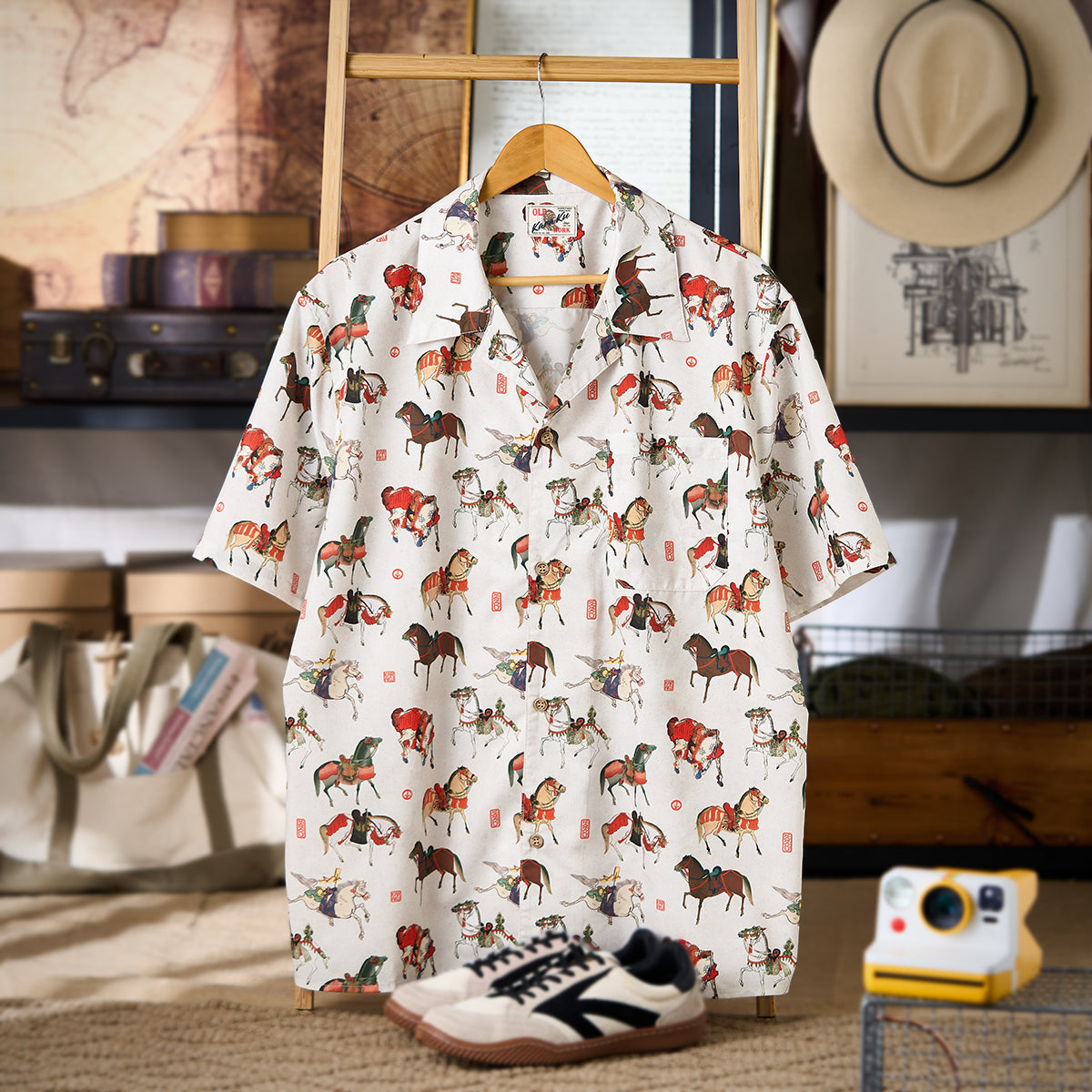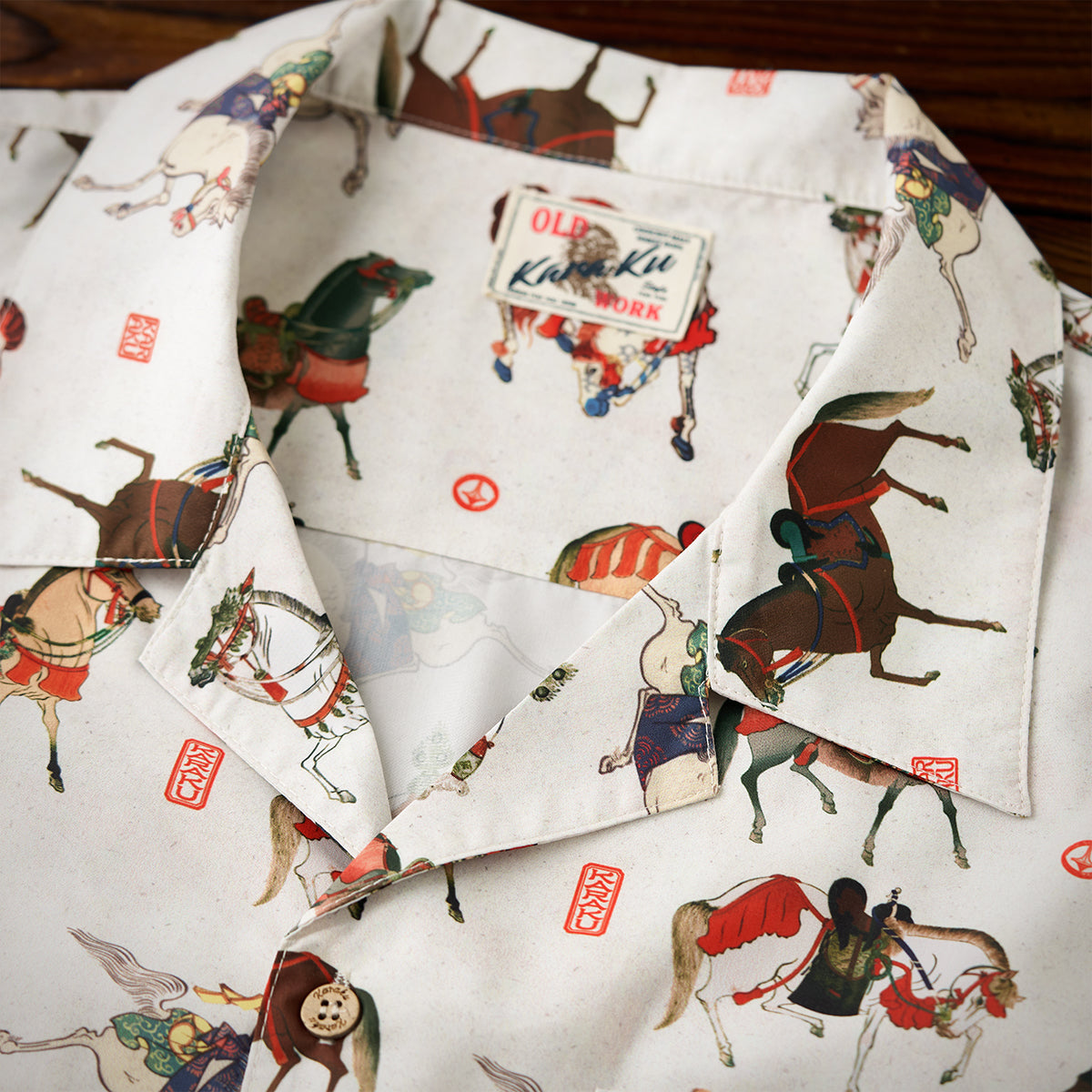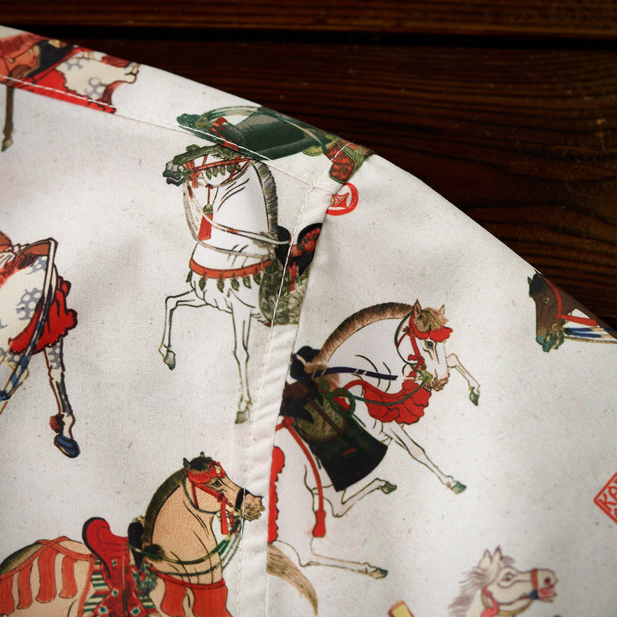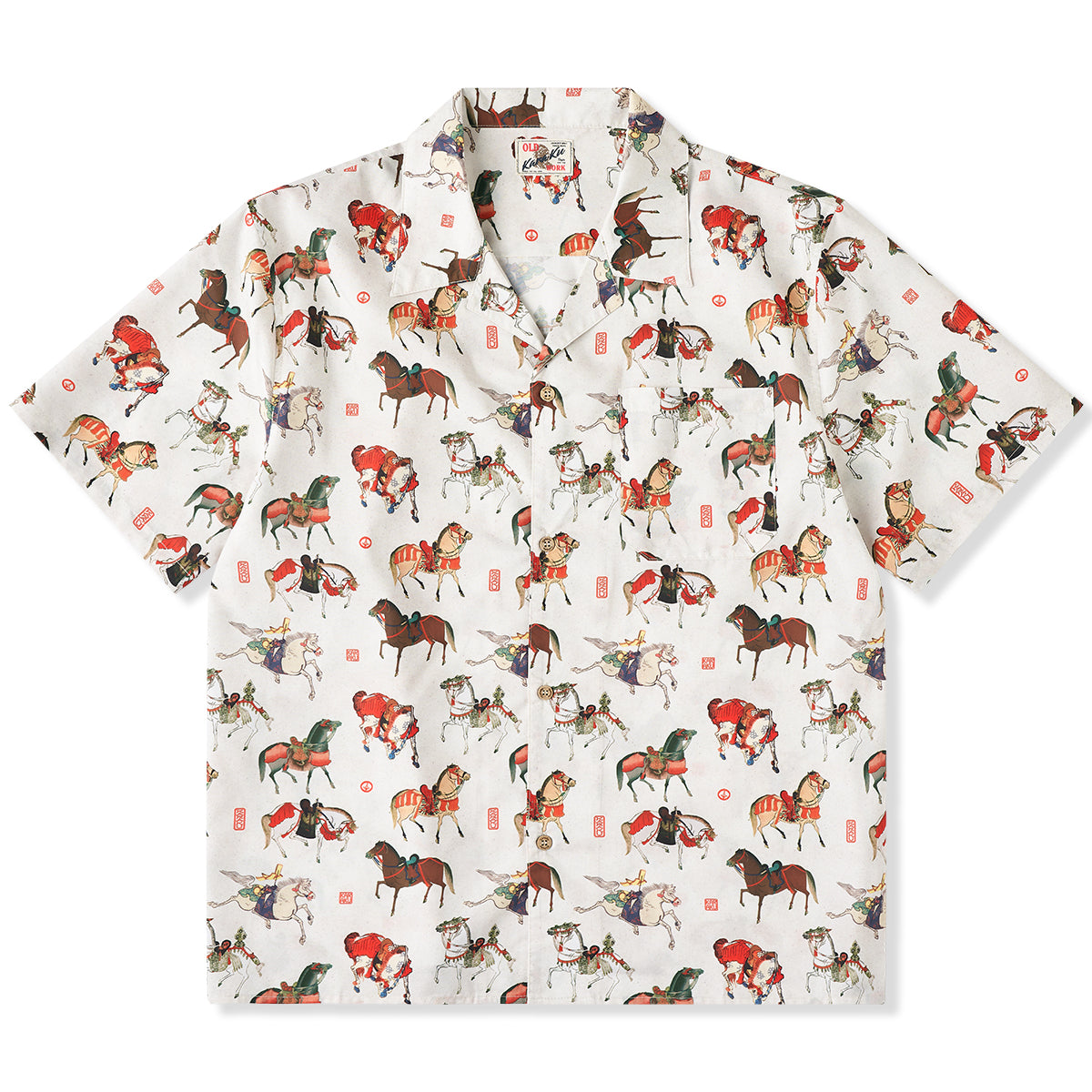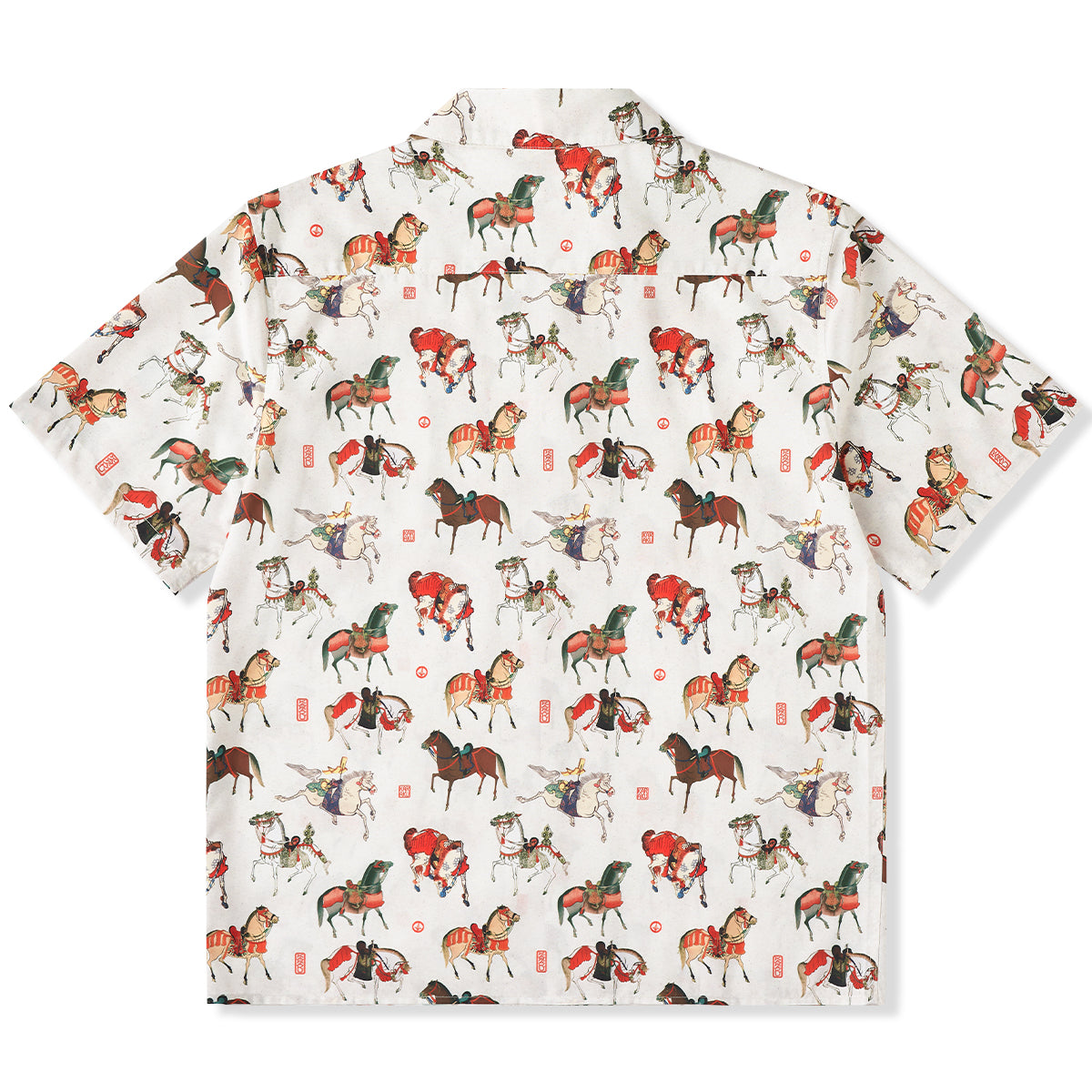 말의 역동적 움직임과 세밀한 디테일이 돋보이는 우키요에 패턴으로, 전통미를 살리면서도 흰 배경으로 색감과 디테일이 돋보이는 셔츠입니다.