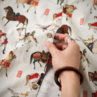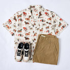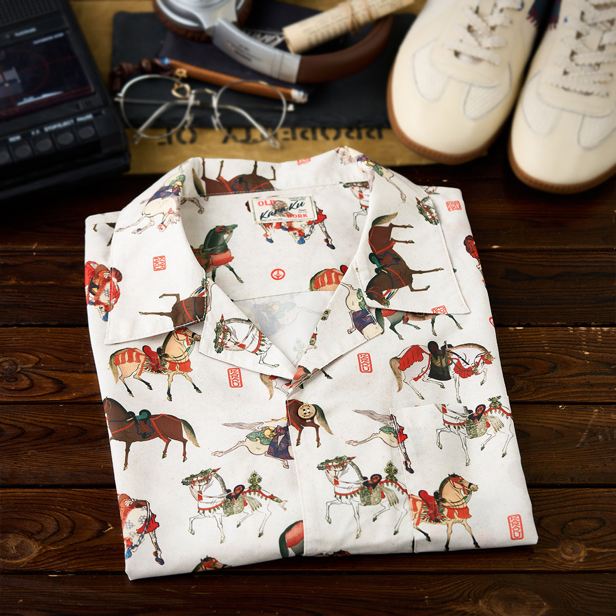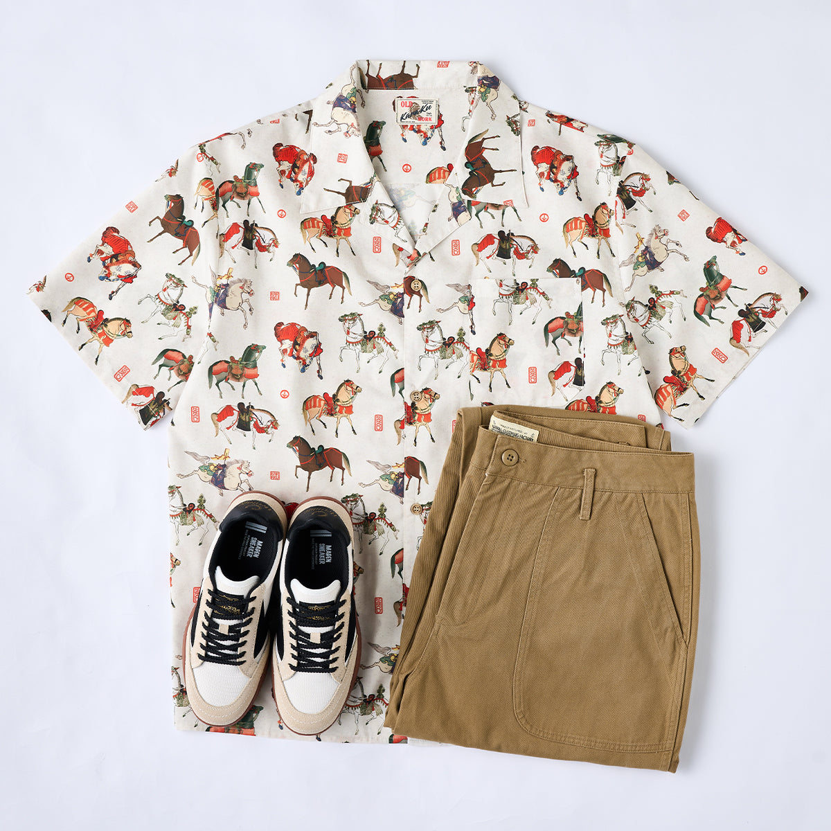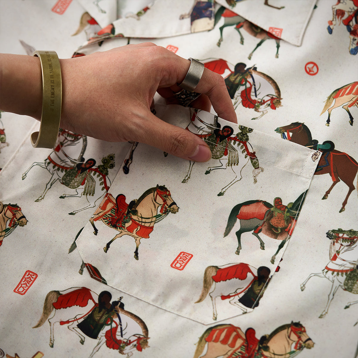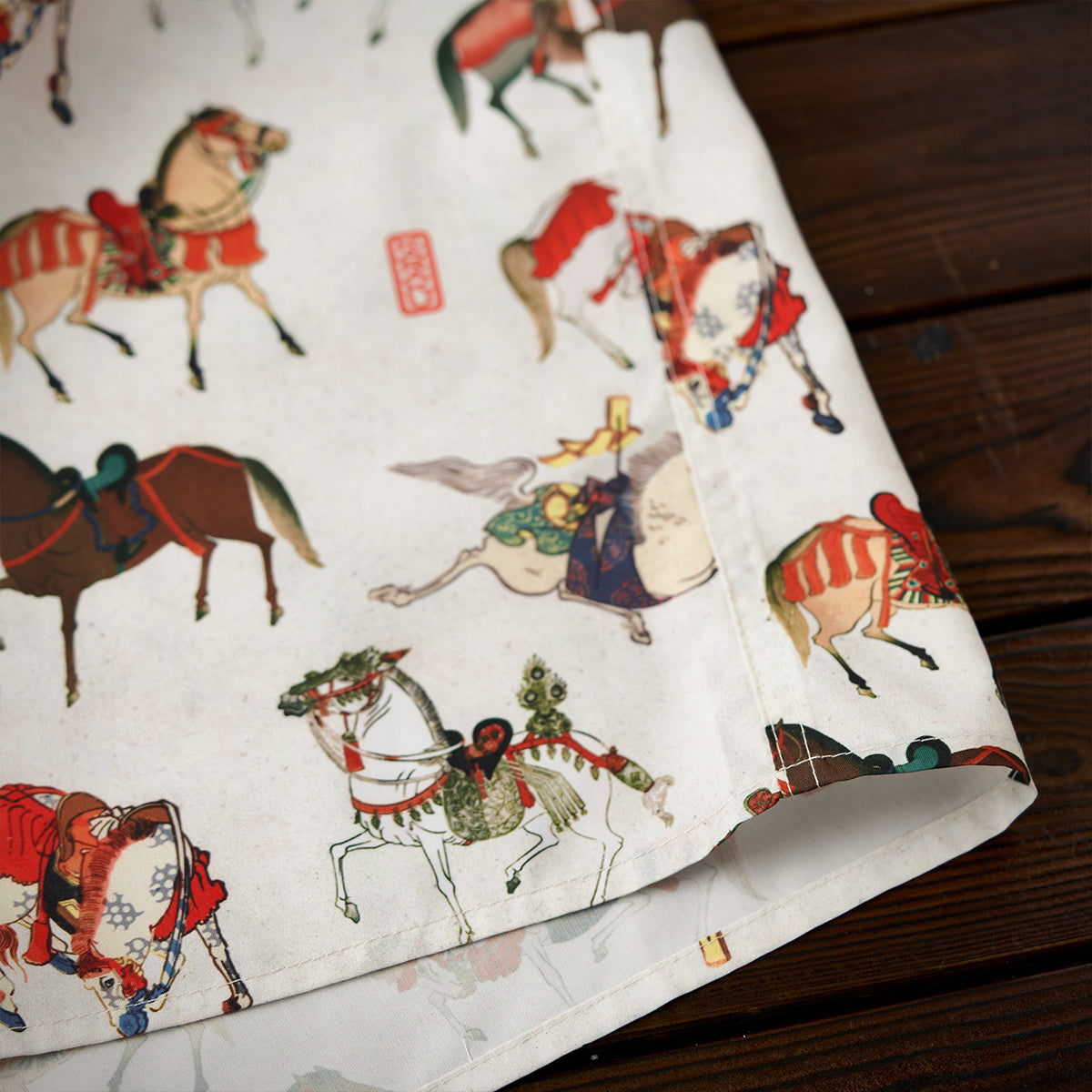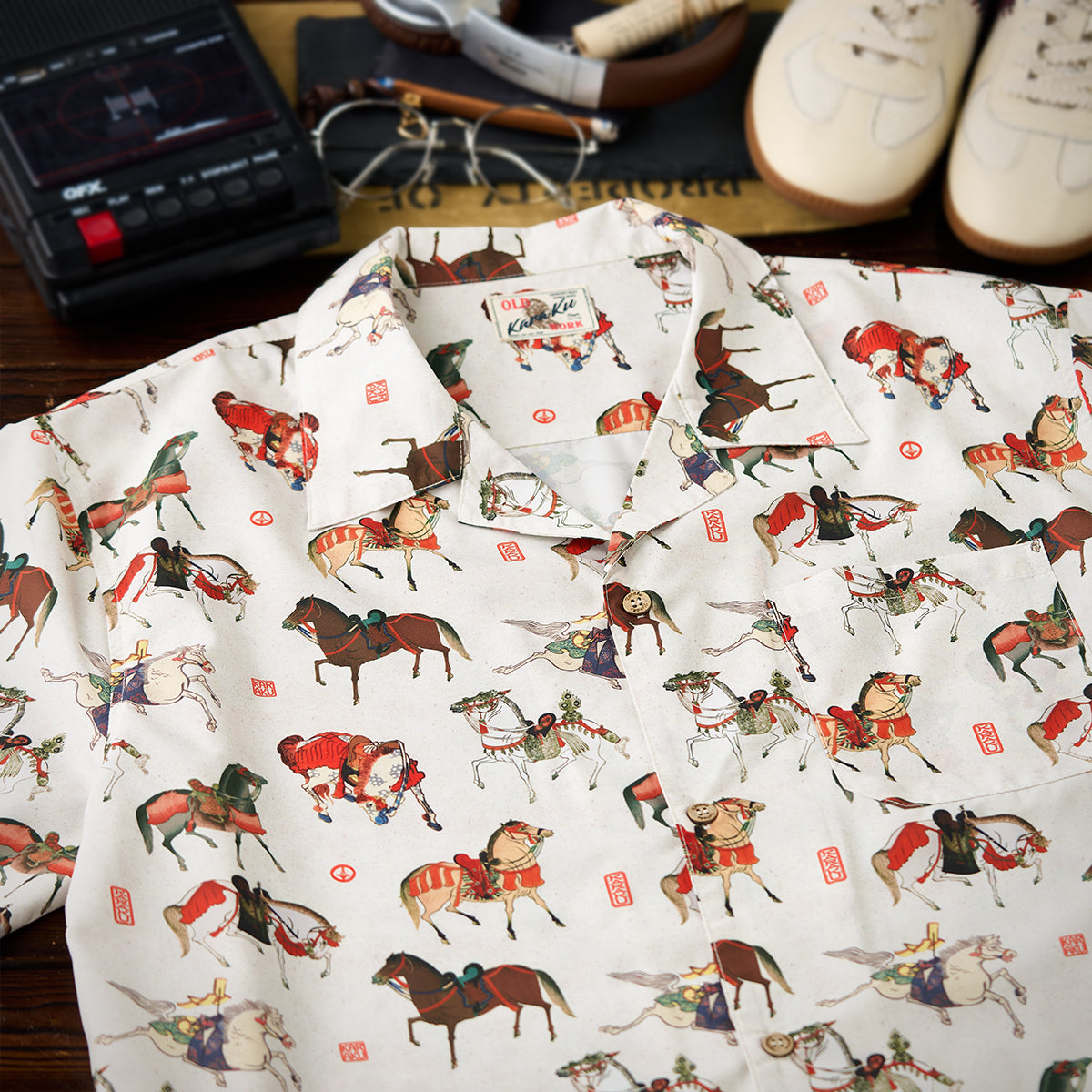 말의 역동적 움직임과 세밀한 디테일이 돋보이는 우키요에 패턴으로, 전통미를 살리면서도 흰 배경으로 색감과 디테일이 돋보이는 셔츠입니다.