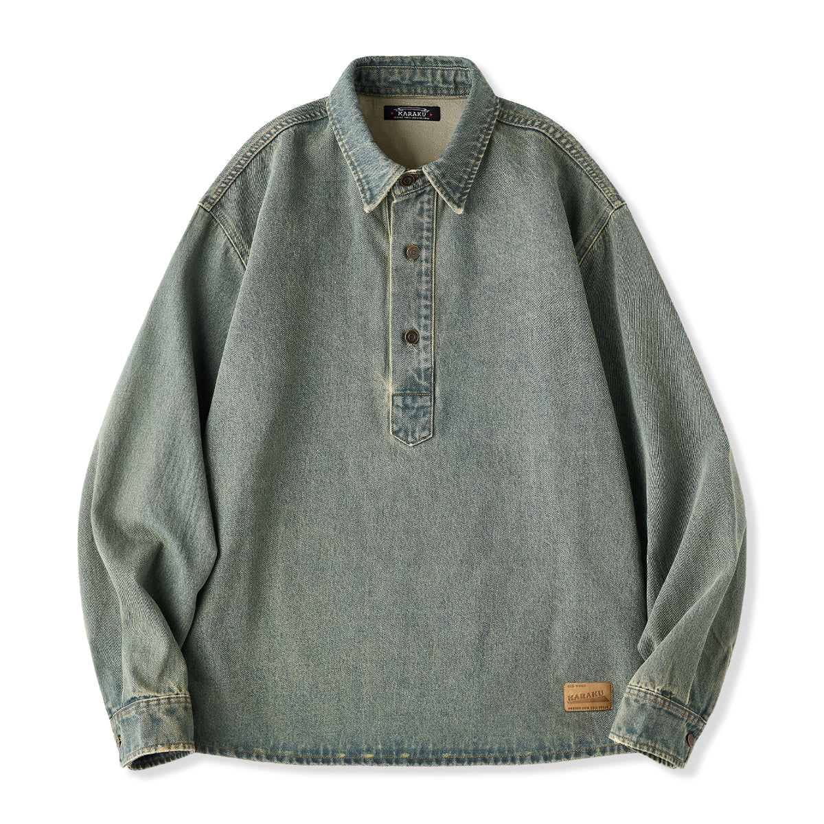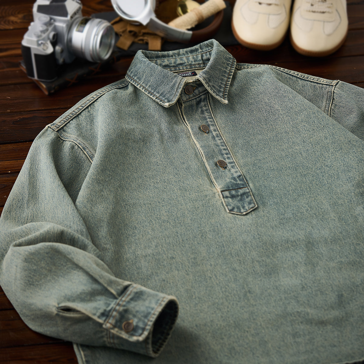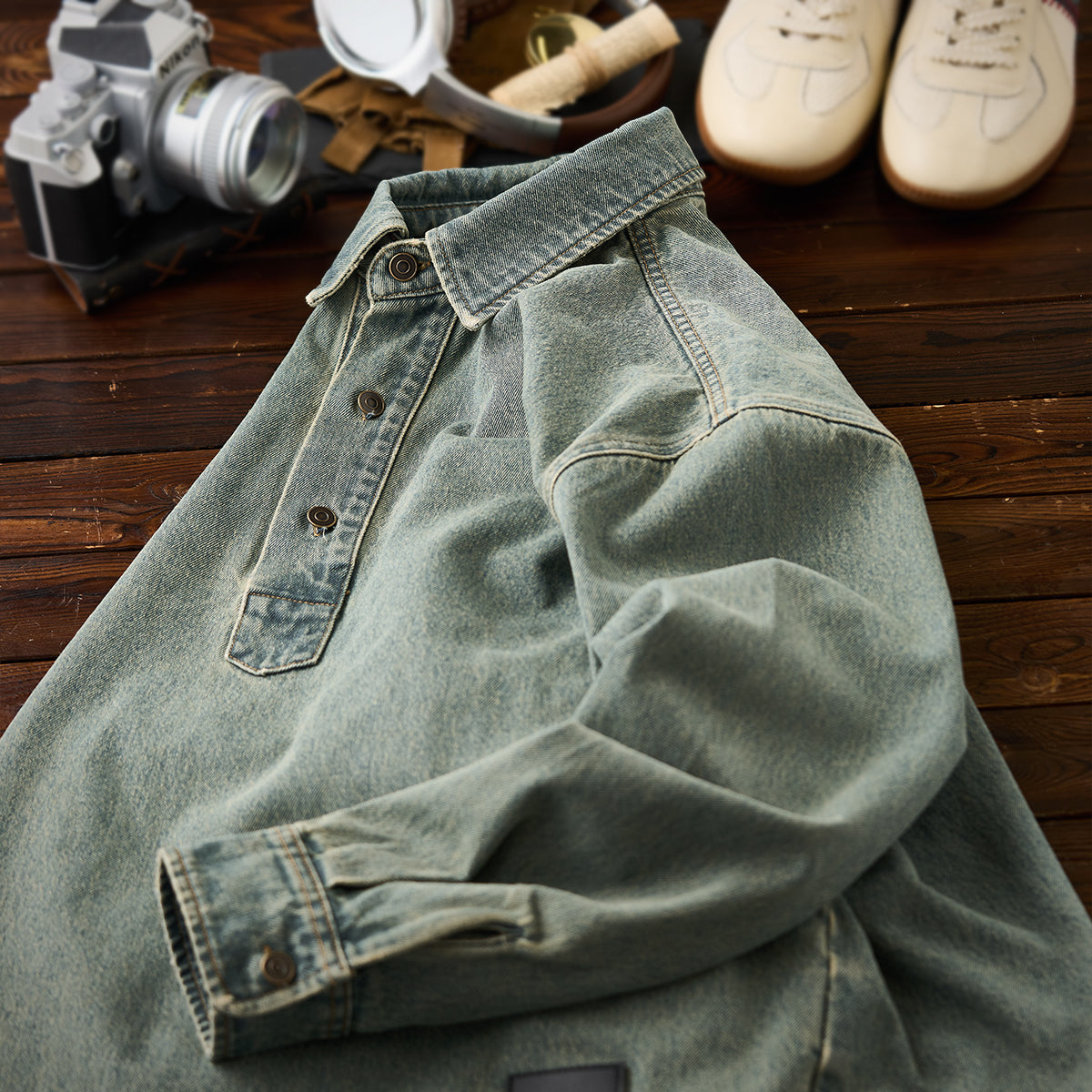 유즈드 & 워시드 가공 하프 버튼 긴팔 데님 셔츠