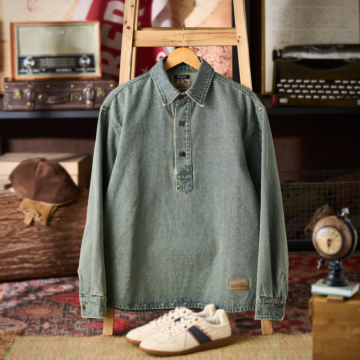 하프 버튼과 소매 끝에 조절 가능한 커프스로 편안한 착용감을 제공하며, 밑단 가죽 패치로 고급스러운 포인트를 더한 심플한 데님 셔츠.
