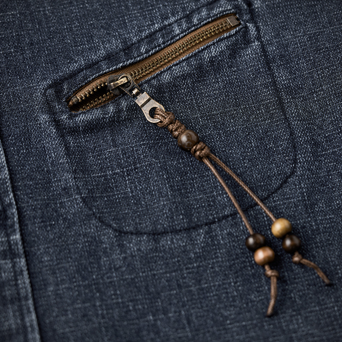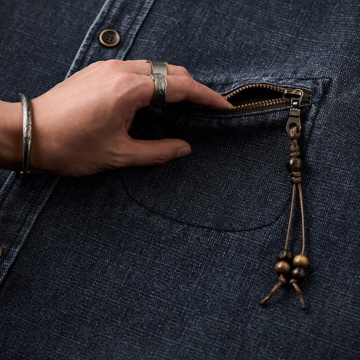 가슴 포켓에 우드 비즈 장식을 더해 은은한 포인트와 개성을 살렸습니다.