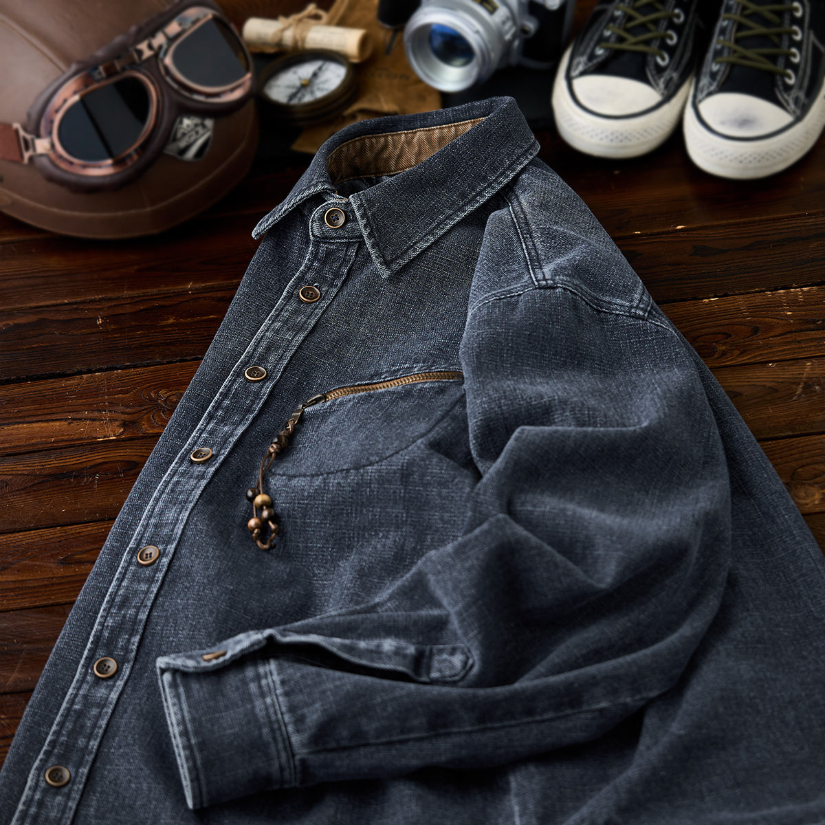 【사전예약】우드 비즈 참 & 오더메이드 버튼 데님 셔츠