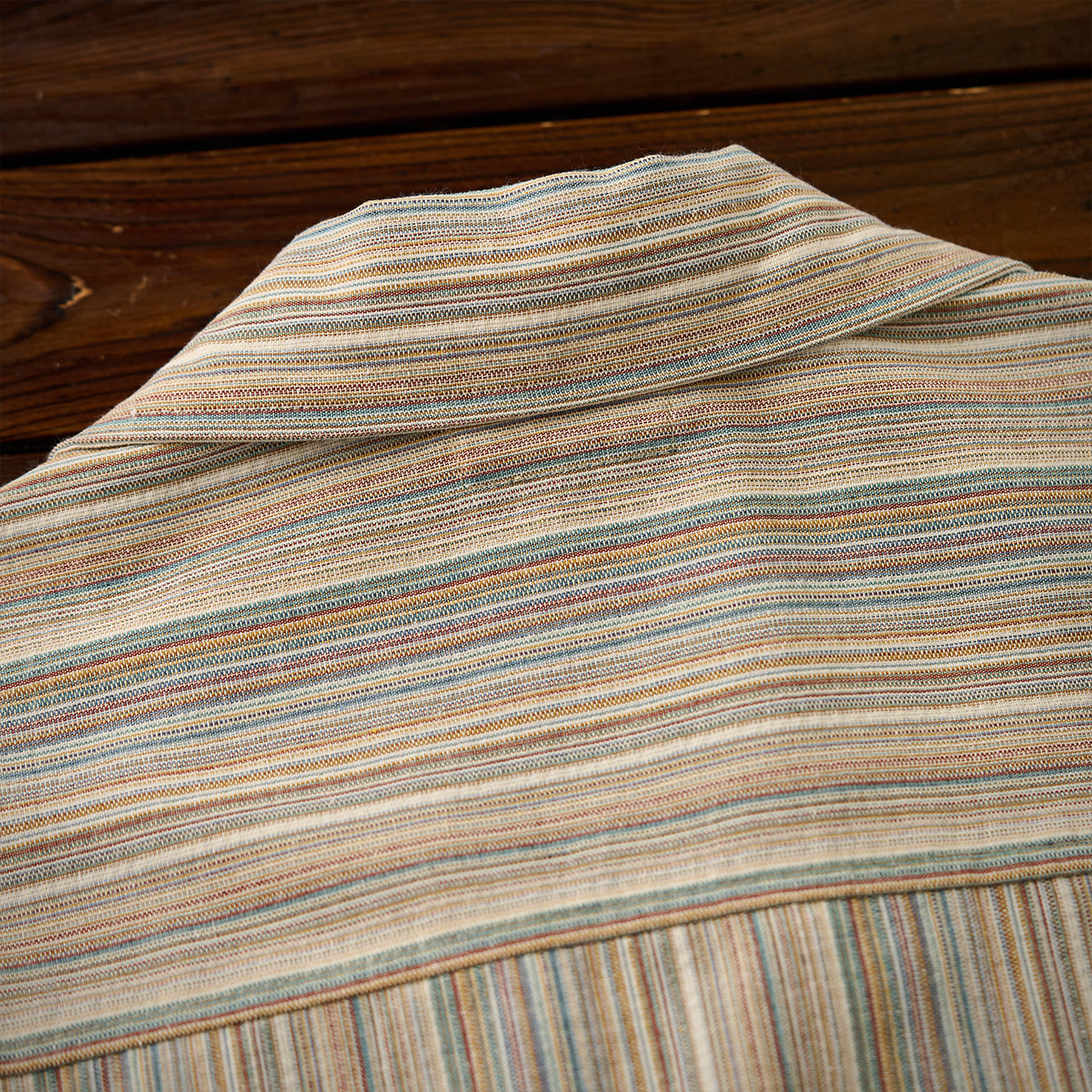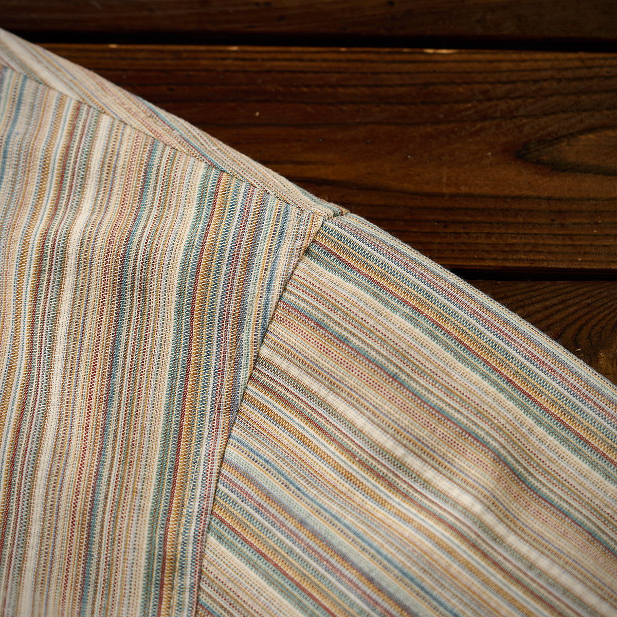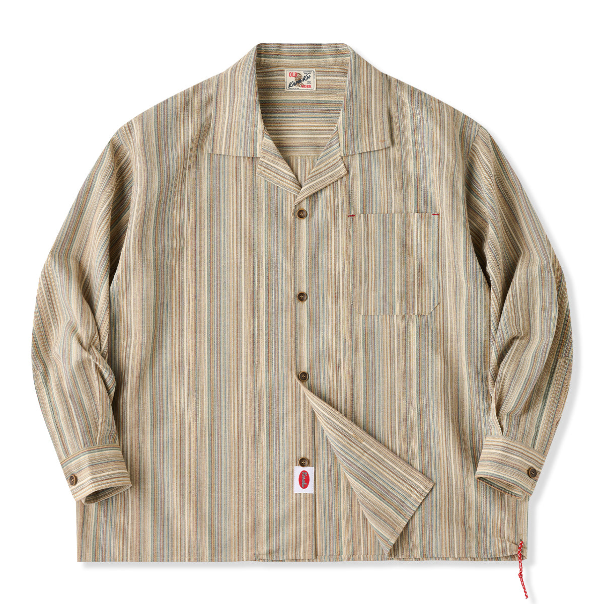 선염 멀티 스트라이프 패턴의 오픈 칼라 셔츠로, 통기성이 좋은 코튼 소재를 사용해 봄과 여름에 가벼운 아우터로 활용할 수 있으며, 다양한 스타일에 쉽게 매치할 수 있습니다.