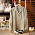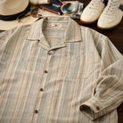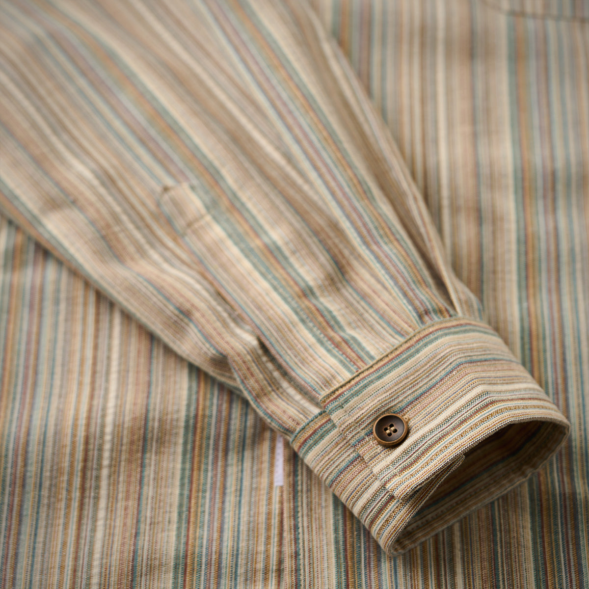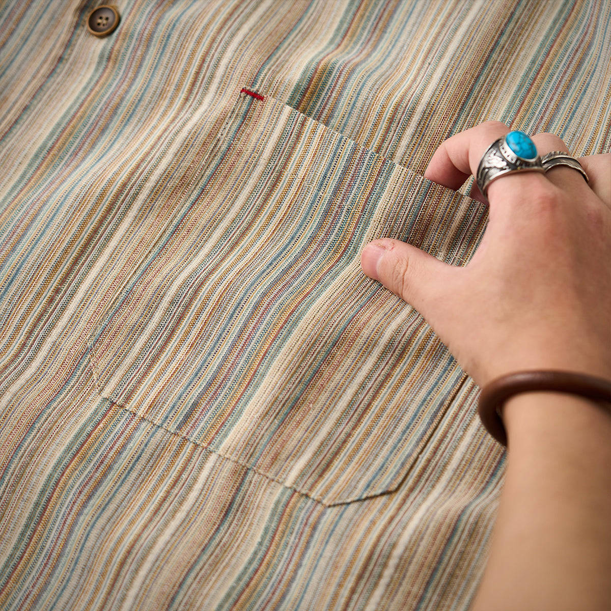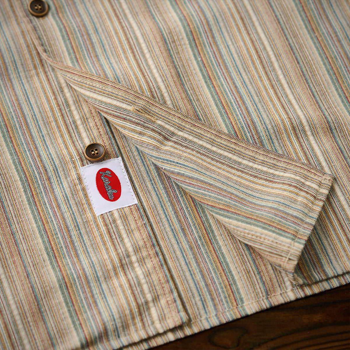 선염 멀티 스트라이프 패턴의 오픈 칼라 셔츠로, 통기성이 좋은 코튼 소재를 사용해 봄과 여름에 가벼운 아우터로 활용할 수 있으며, 다양한 스타일에 쉽게 매치할 수 있습니다.