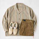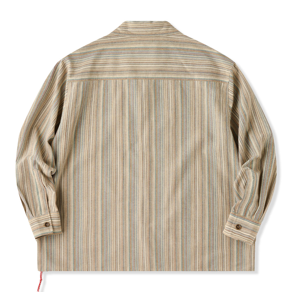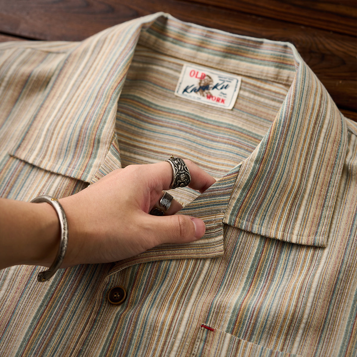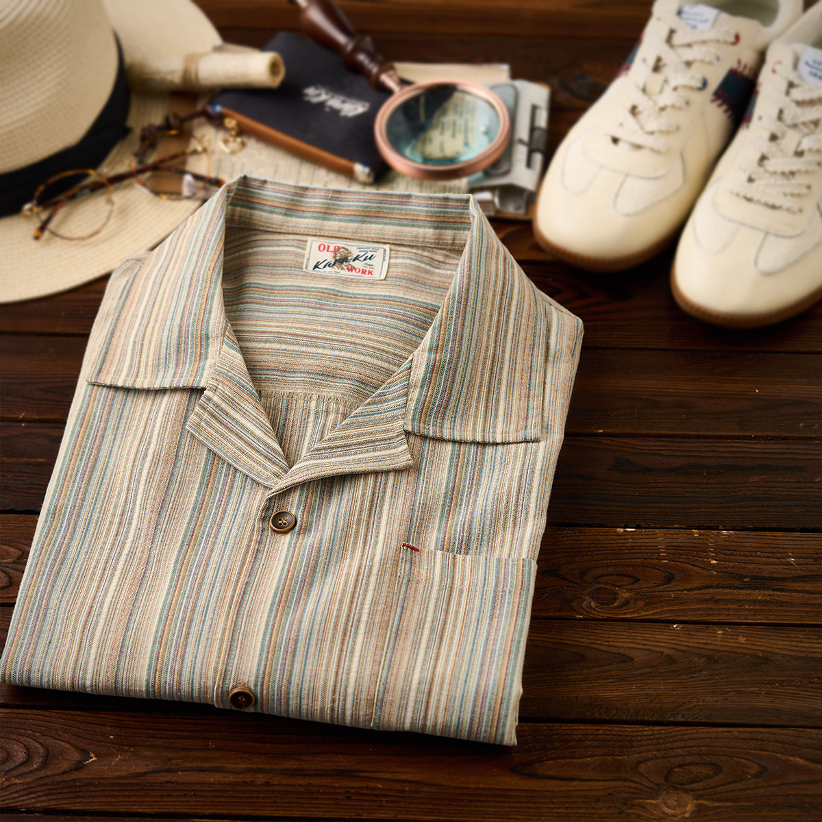 【사전예약】빨간 매듭 끈 선염 멀티 스트라이프 패턴 오픈 칼라 셔츠