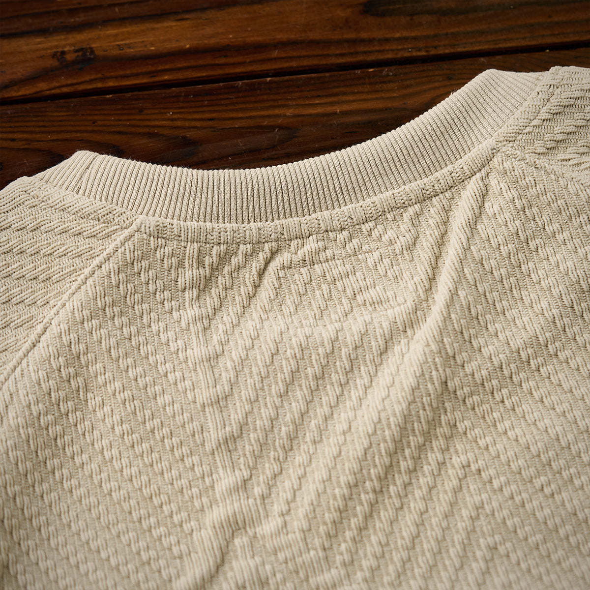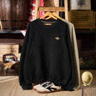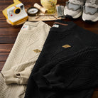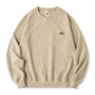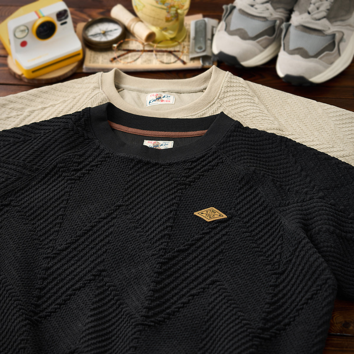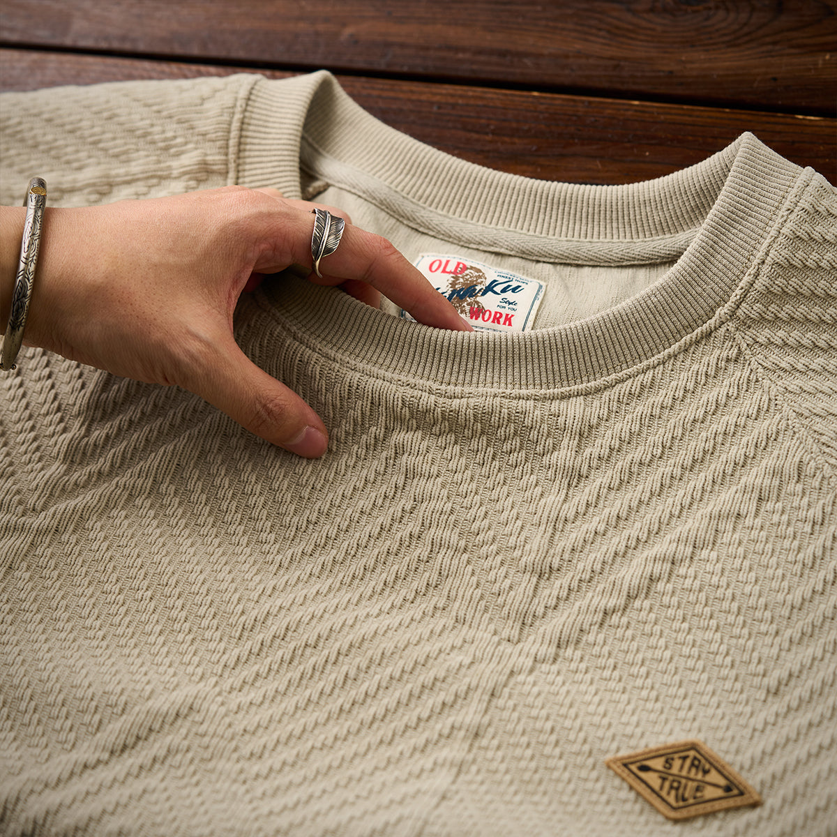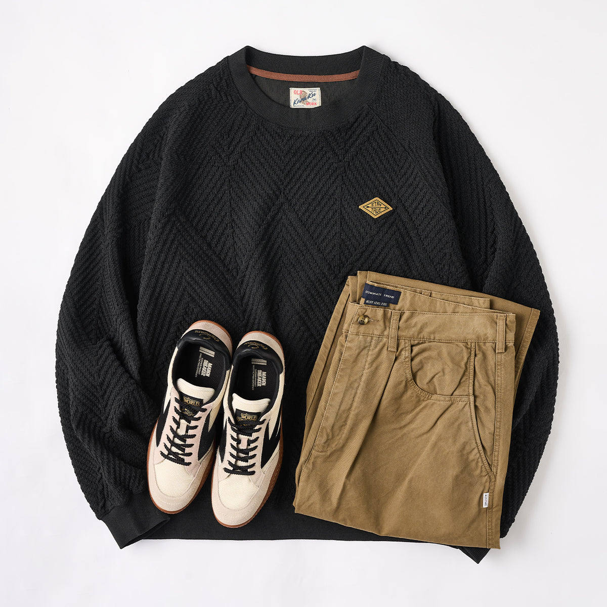 크루넥과 리브 마감으로 편안한 착용감과 보온성을 갖춘 니트 스웨트로, 왼쪽 가슴의 ‘STAY TRUE’ 옐로 자수 와펜과 전체의 지그재그 자카드 패턴이 포인트입니다.