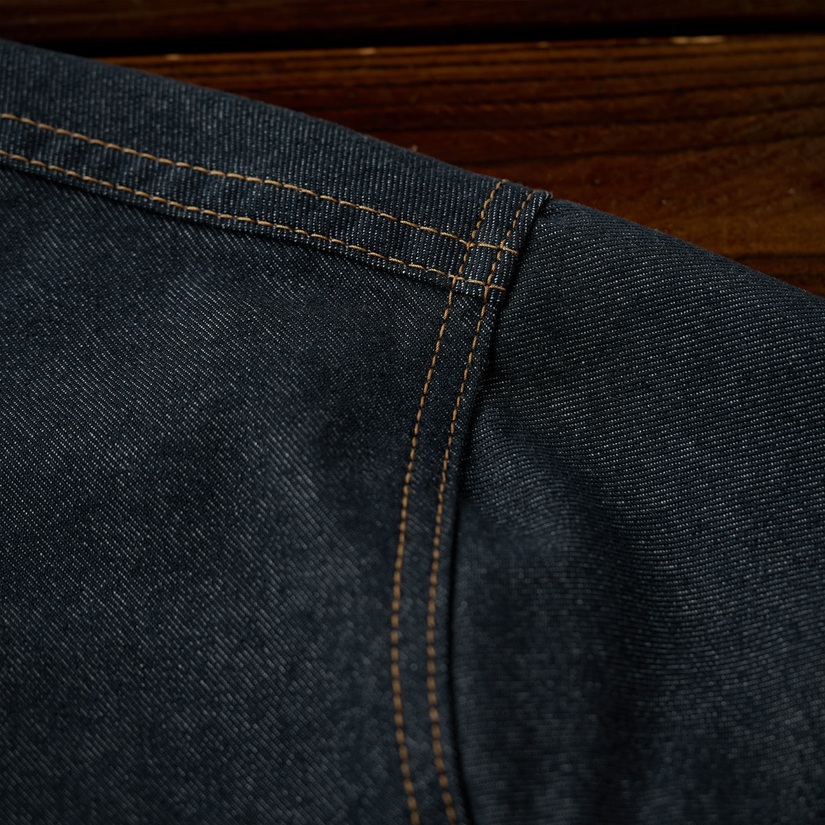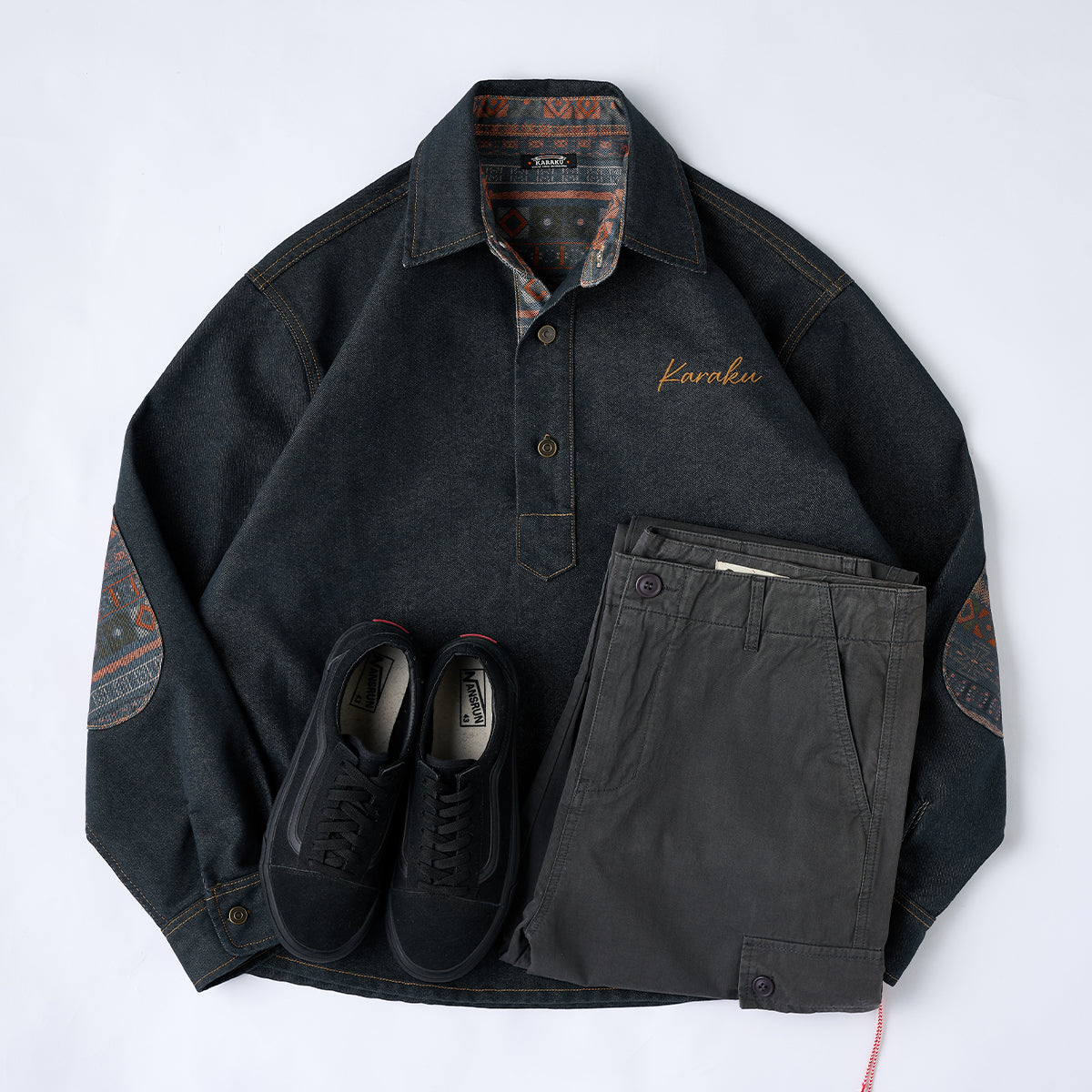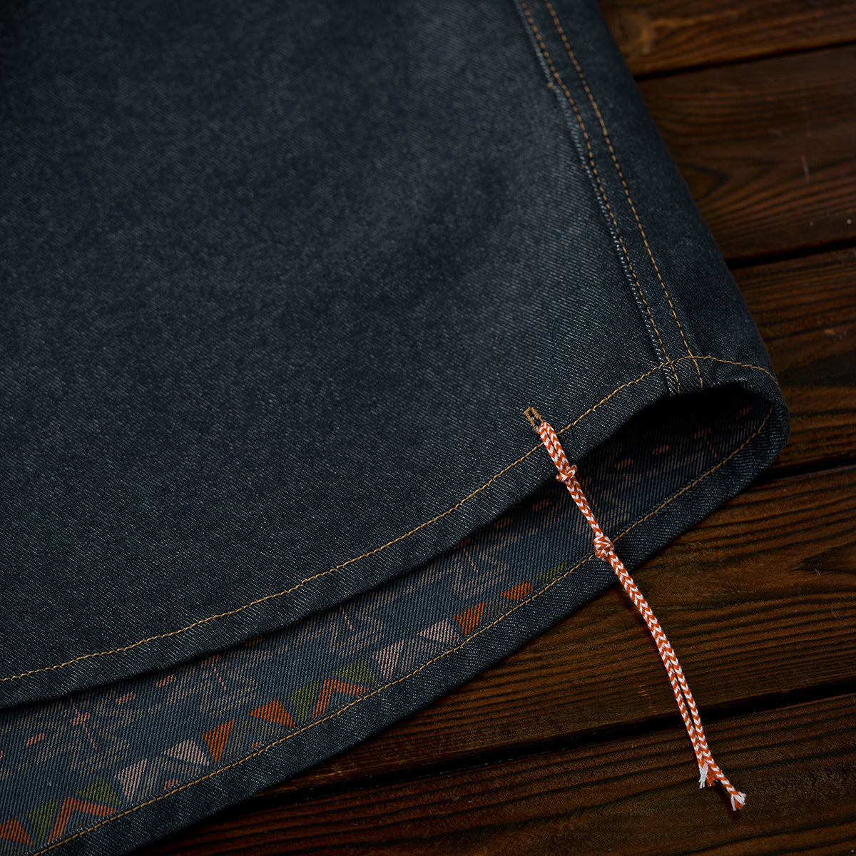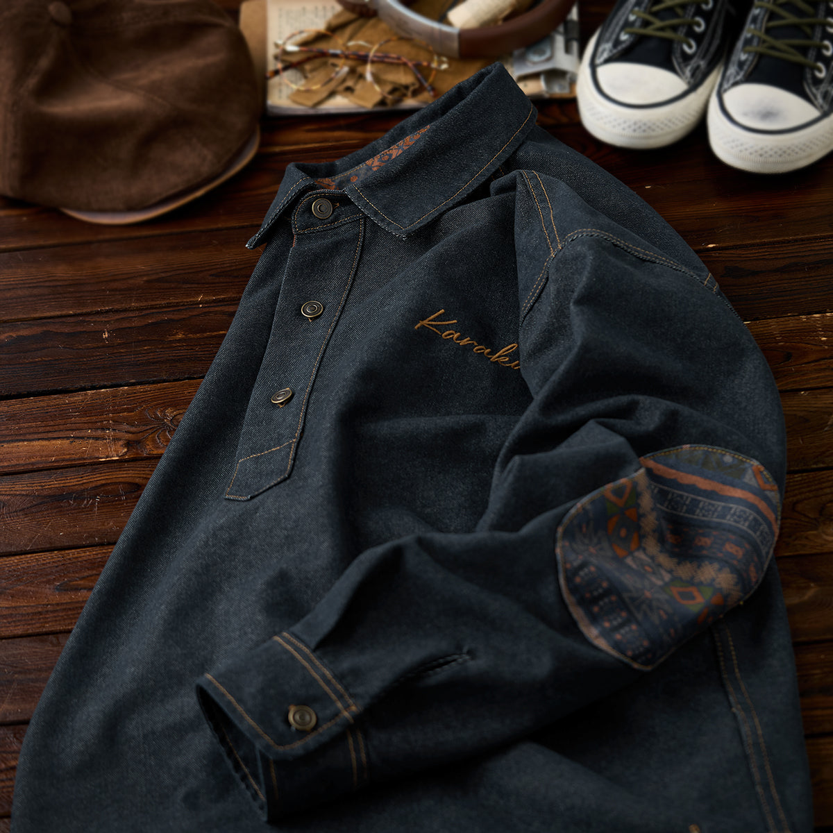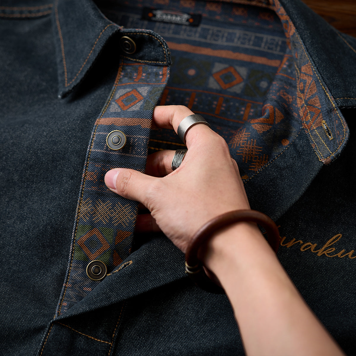 안감과 팔꿈치에 더한 에스닉 패턴이 워크웨어 데님에 이국적인 분위기를 더합니다.