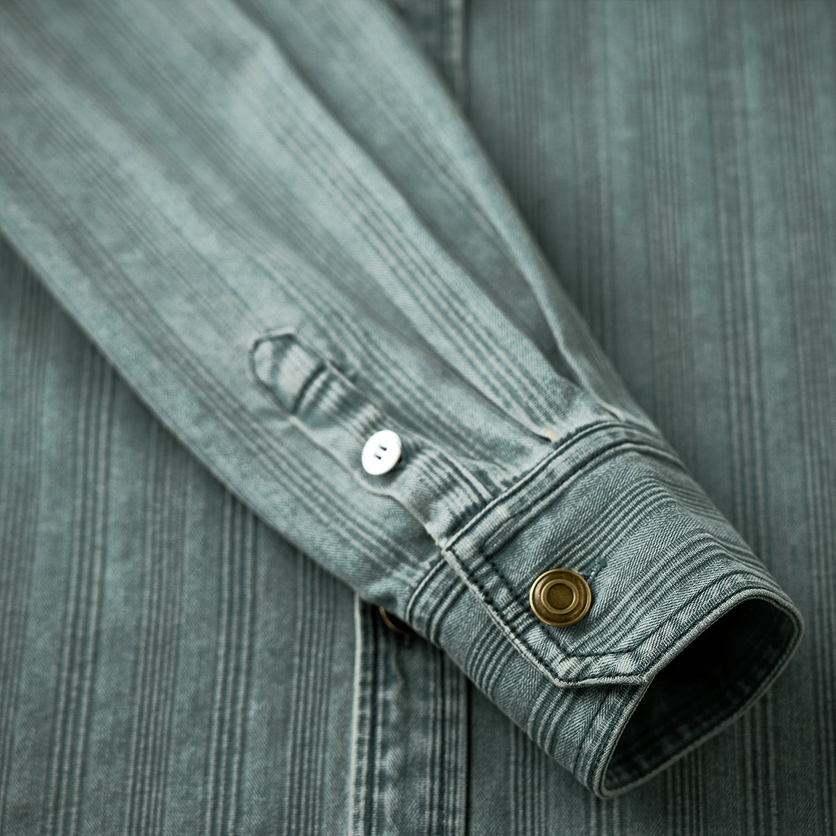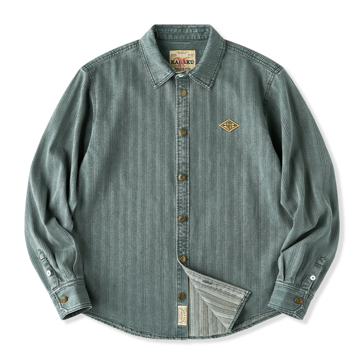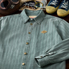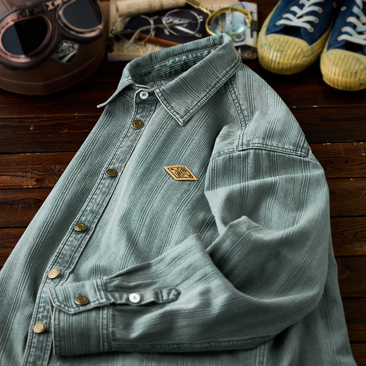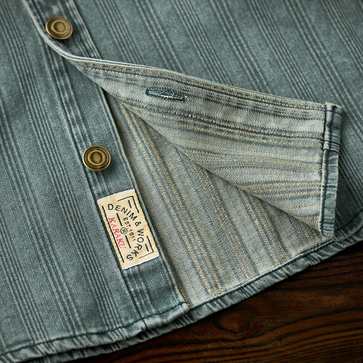 와펜과 브랜드 태그 포인트, 리랙스 핏과 조절 가능한 소매, 빈티지 데님 스트라이프 패턴이 돋보이는 셔츠.