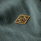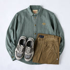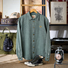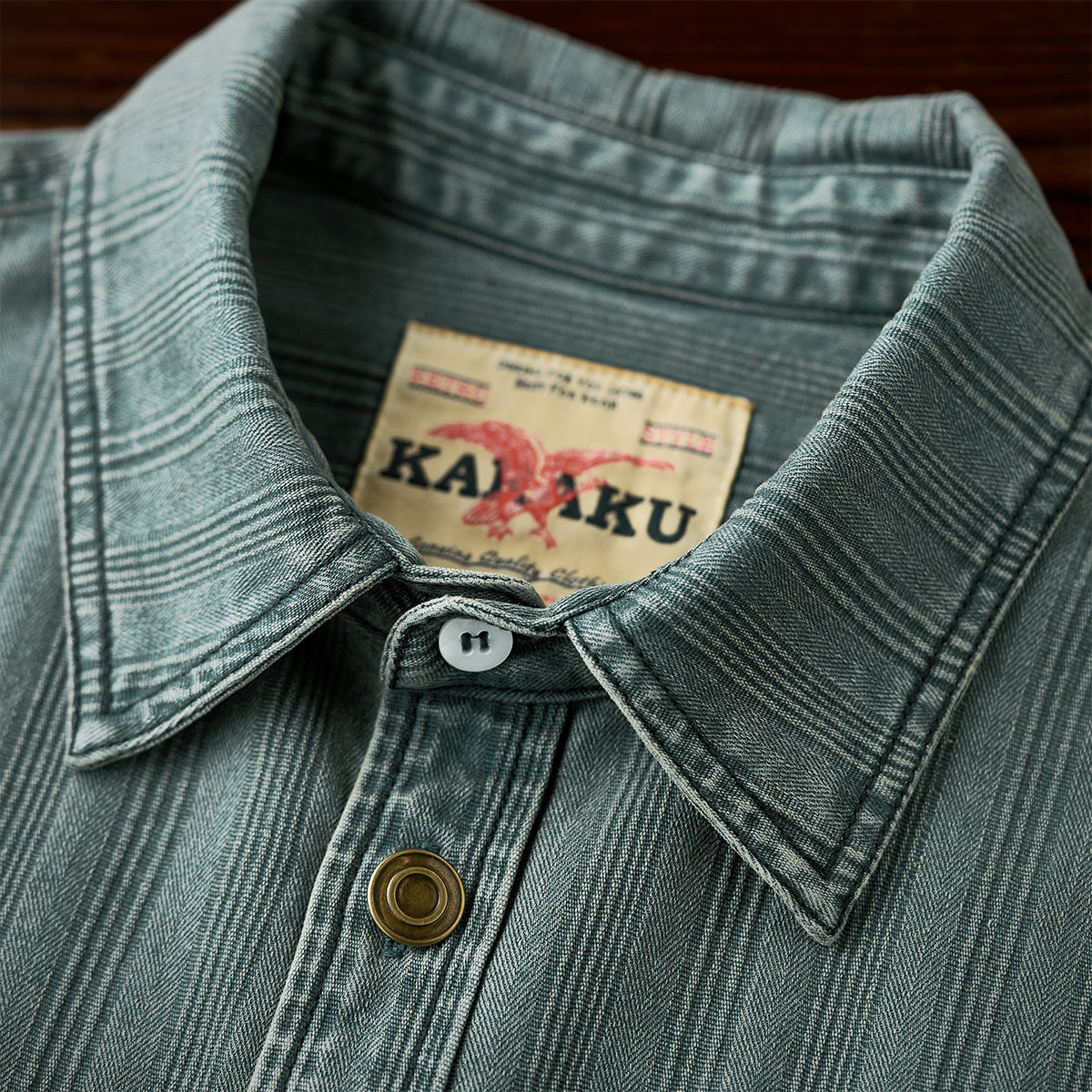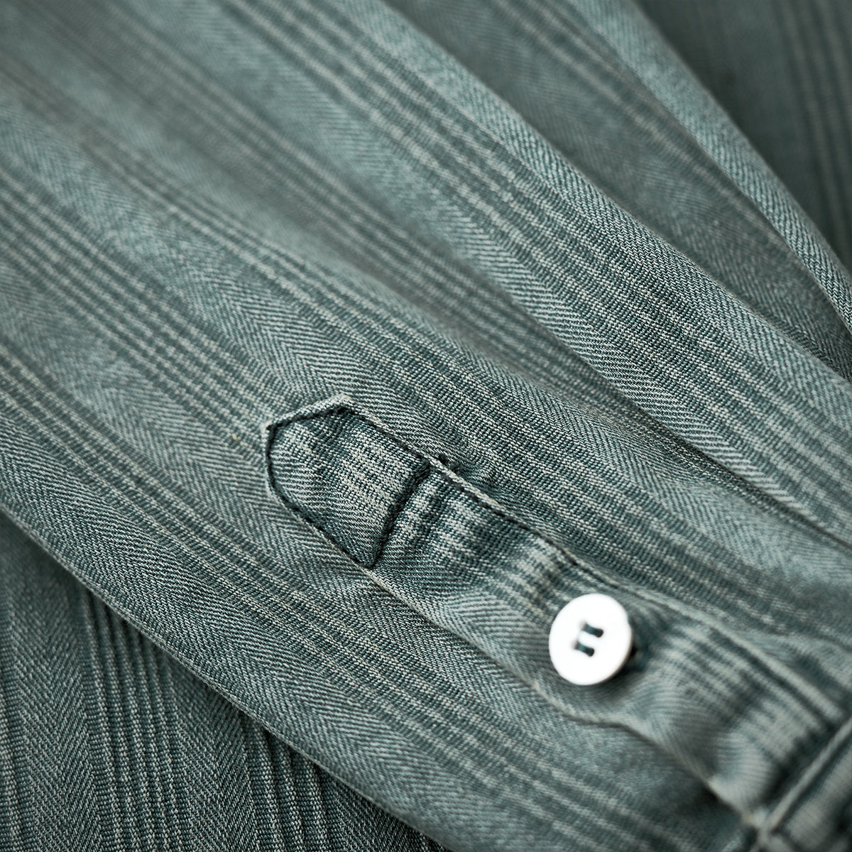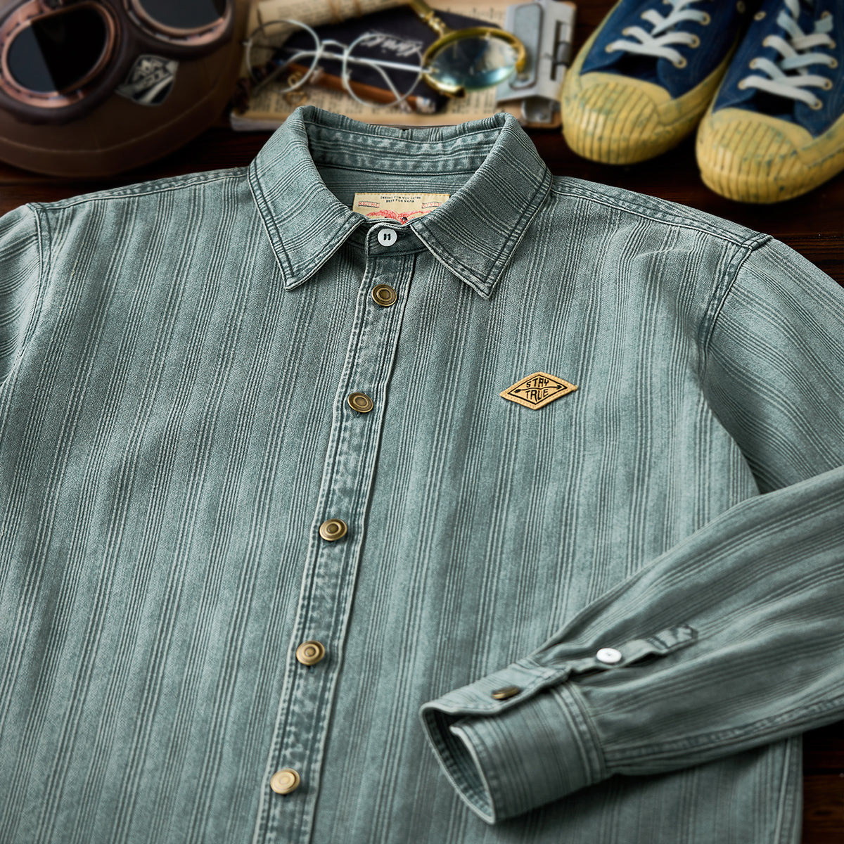 와펜과 브랜드 태그 포인트, 리랙스 핏과 조절 가능한 소매, 빈티지 데님 스트라이프 패턴이 돋보이는 셔츠.