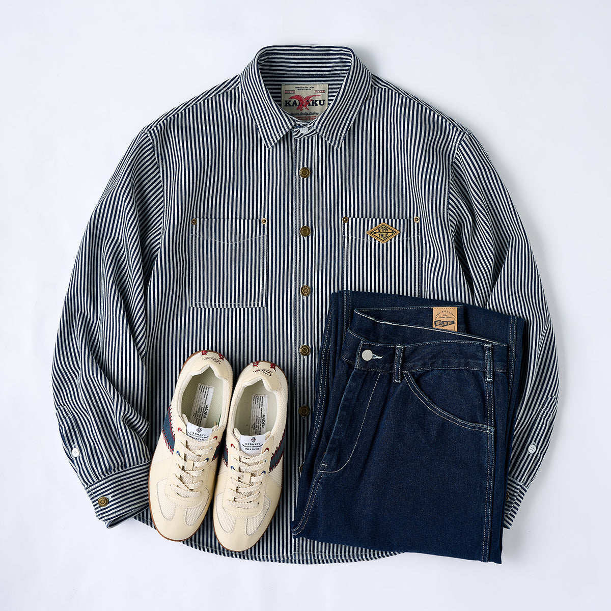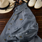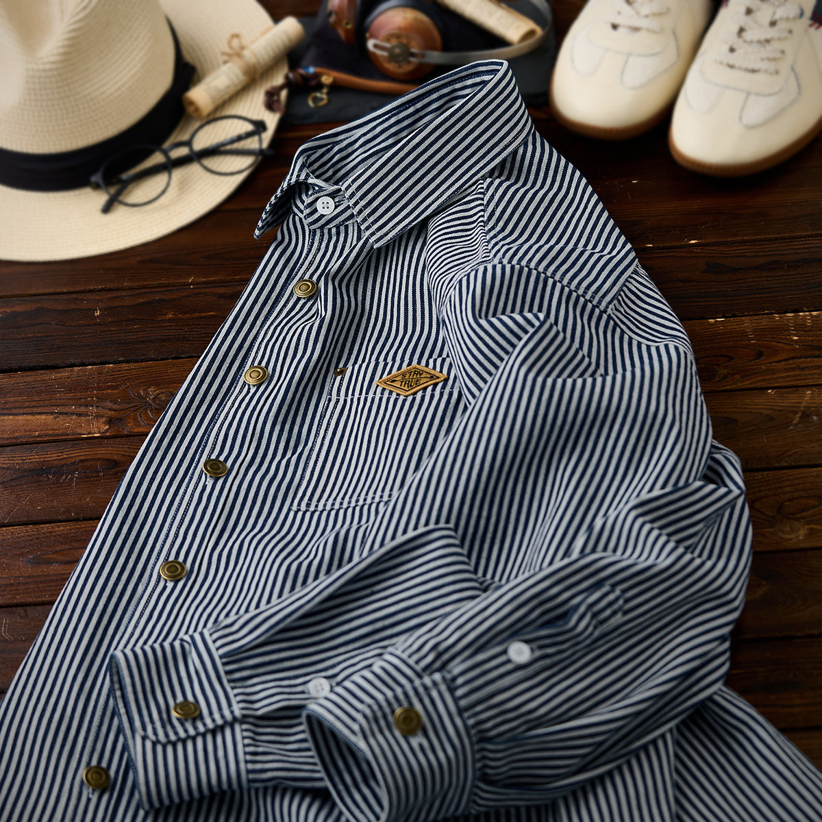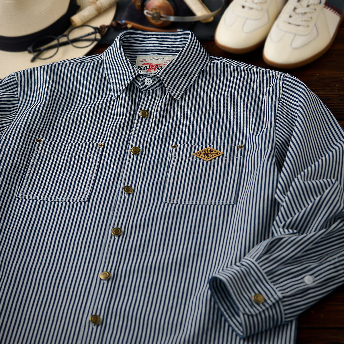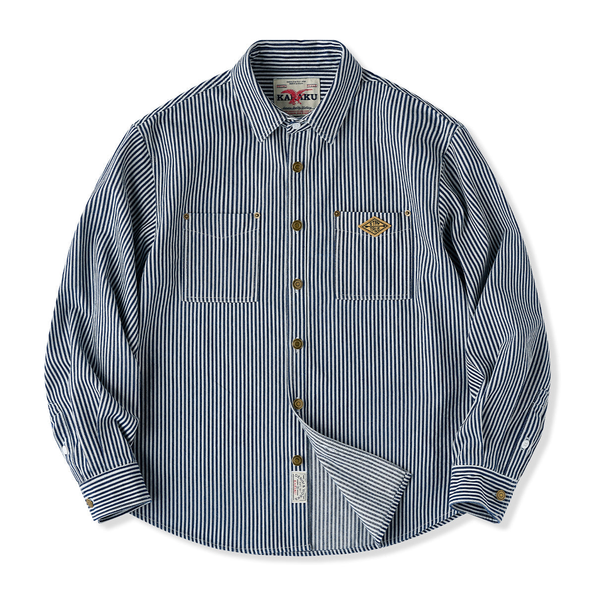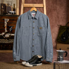 【사전예약】「STAY TRUE」자수 와펜 선염 스트라이프 워크 셔츠