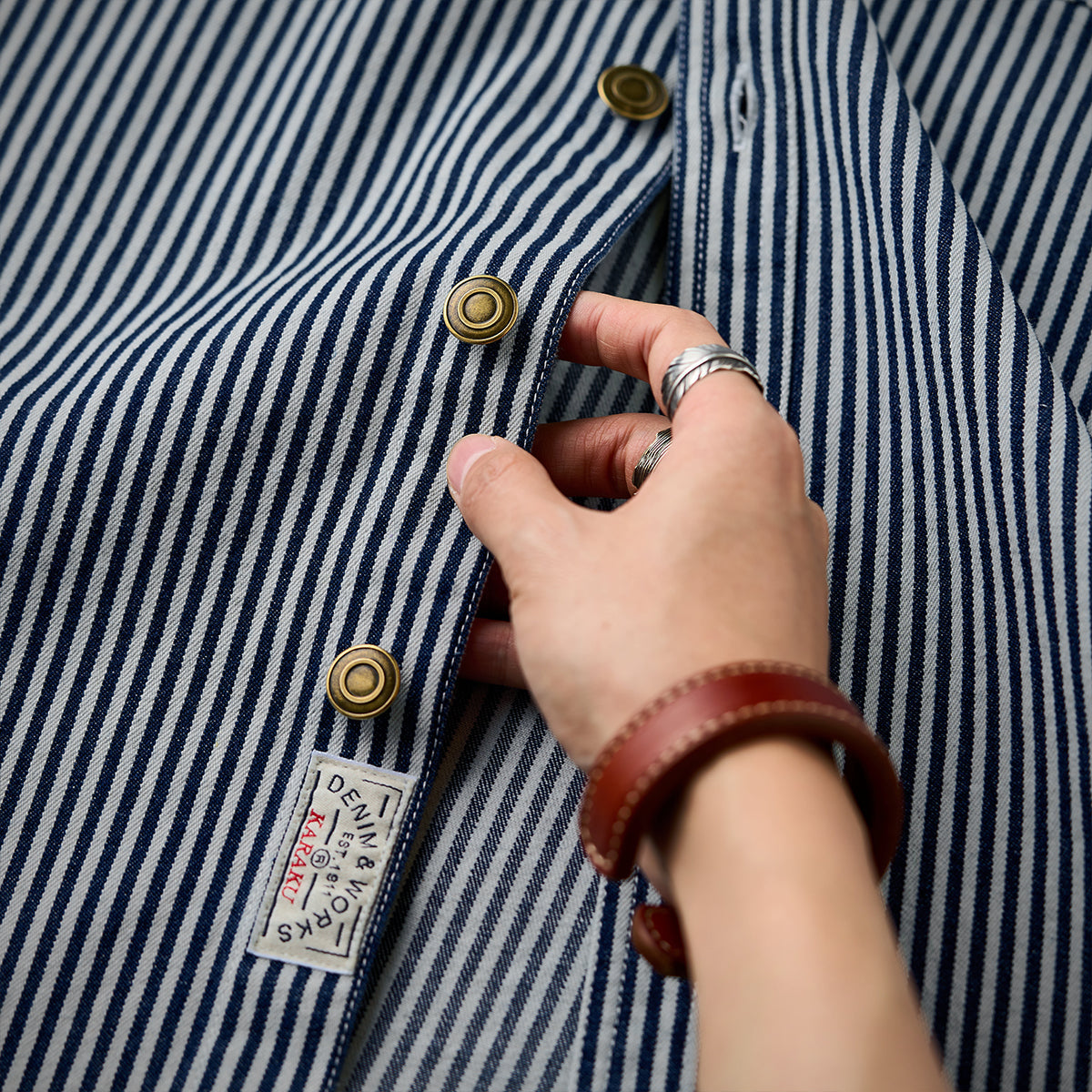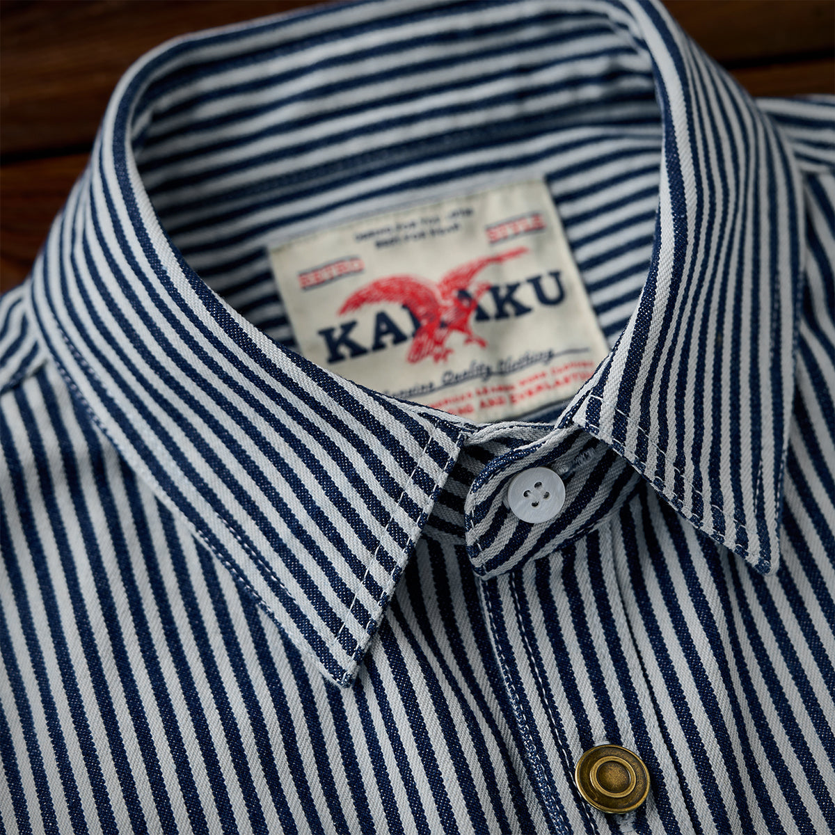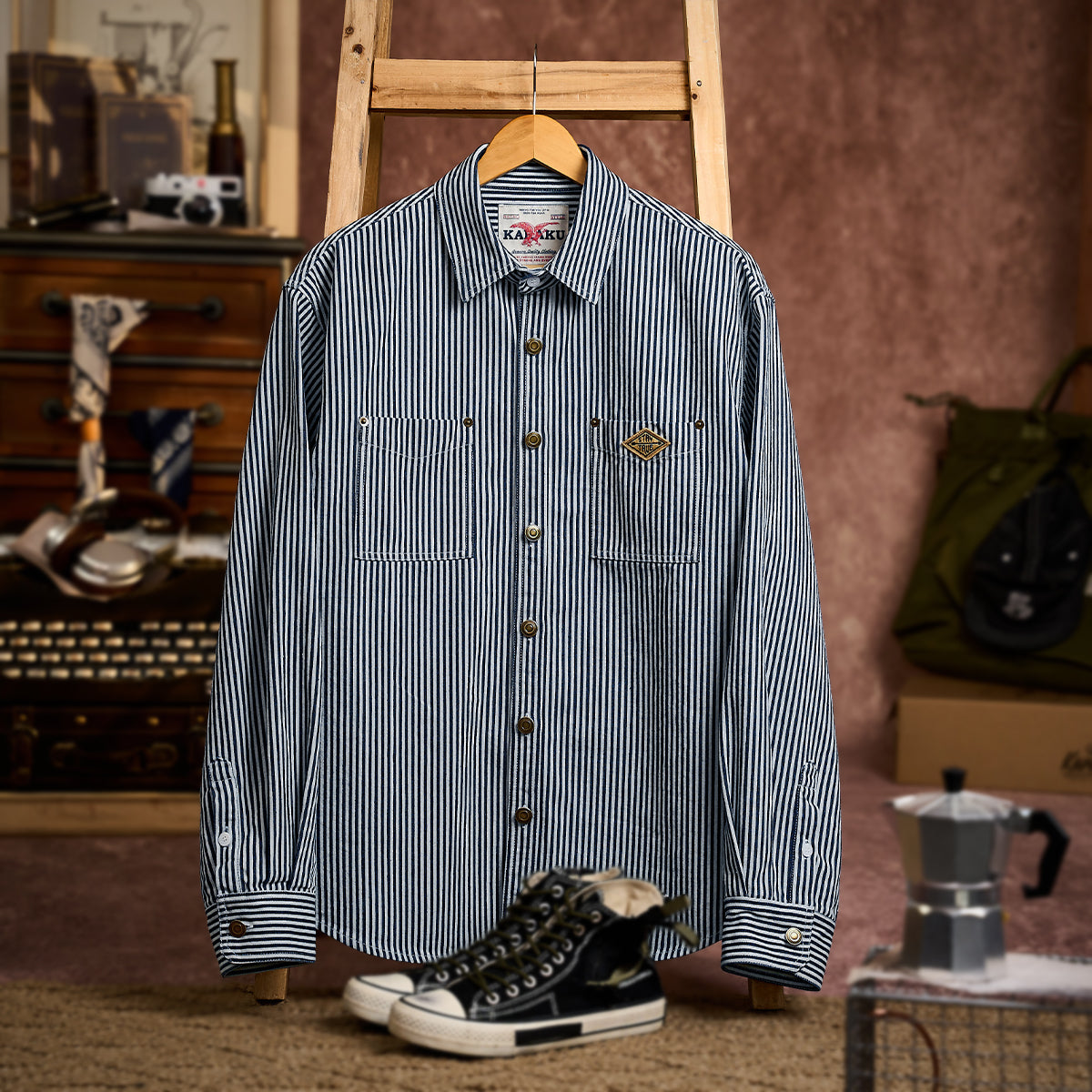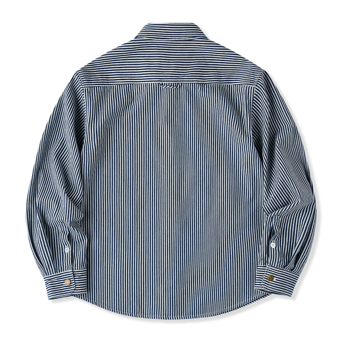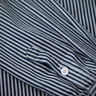 스트라이프 패턴과 선염 기법으로 클래식하면서도 자연스러운 멋을 살린 셔츠로, 대칭 포켓과 자수 와펜, 고동색 단추가 멋진 포인트를 더합니다.