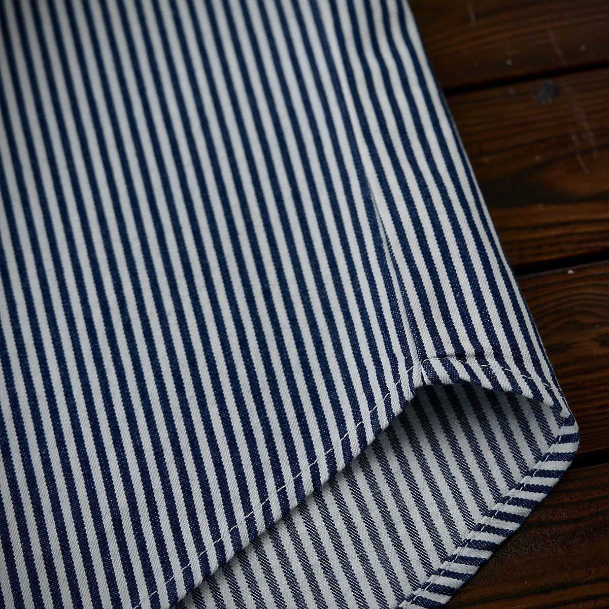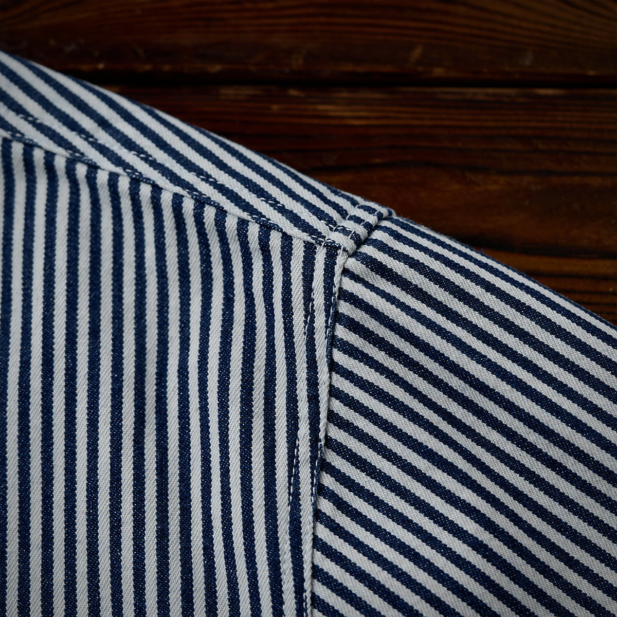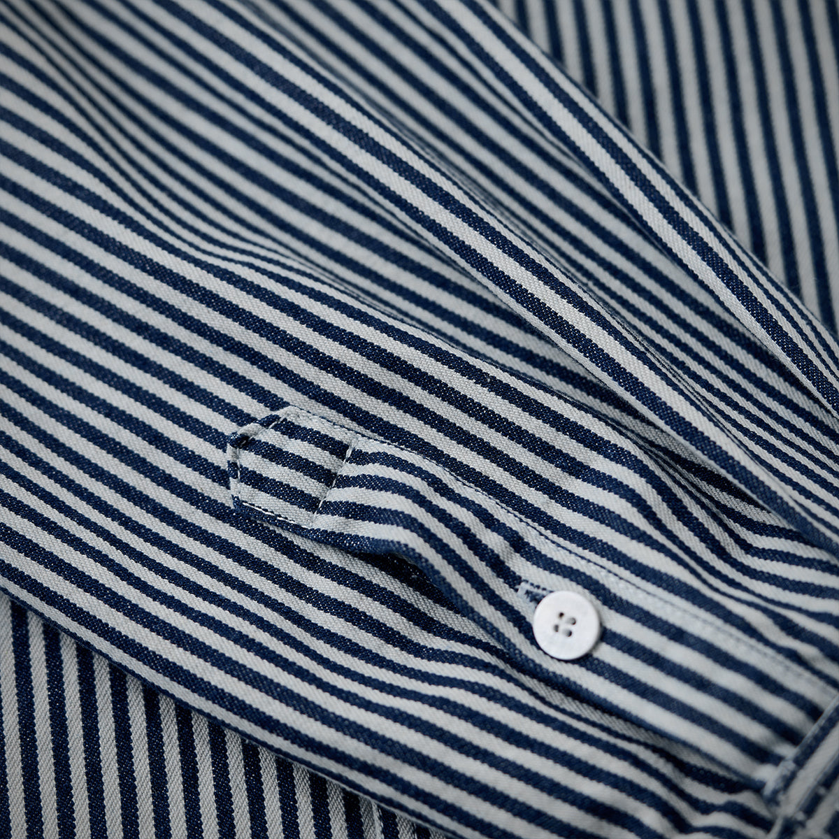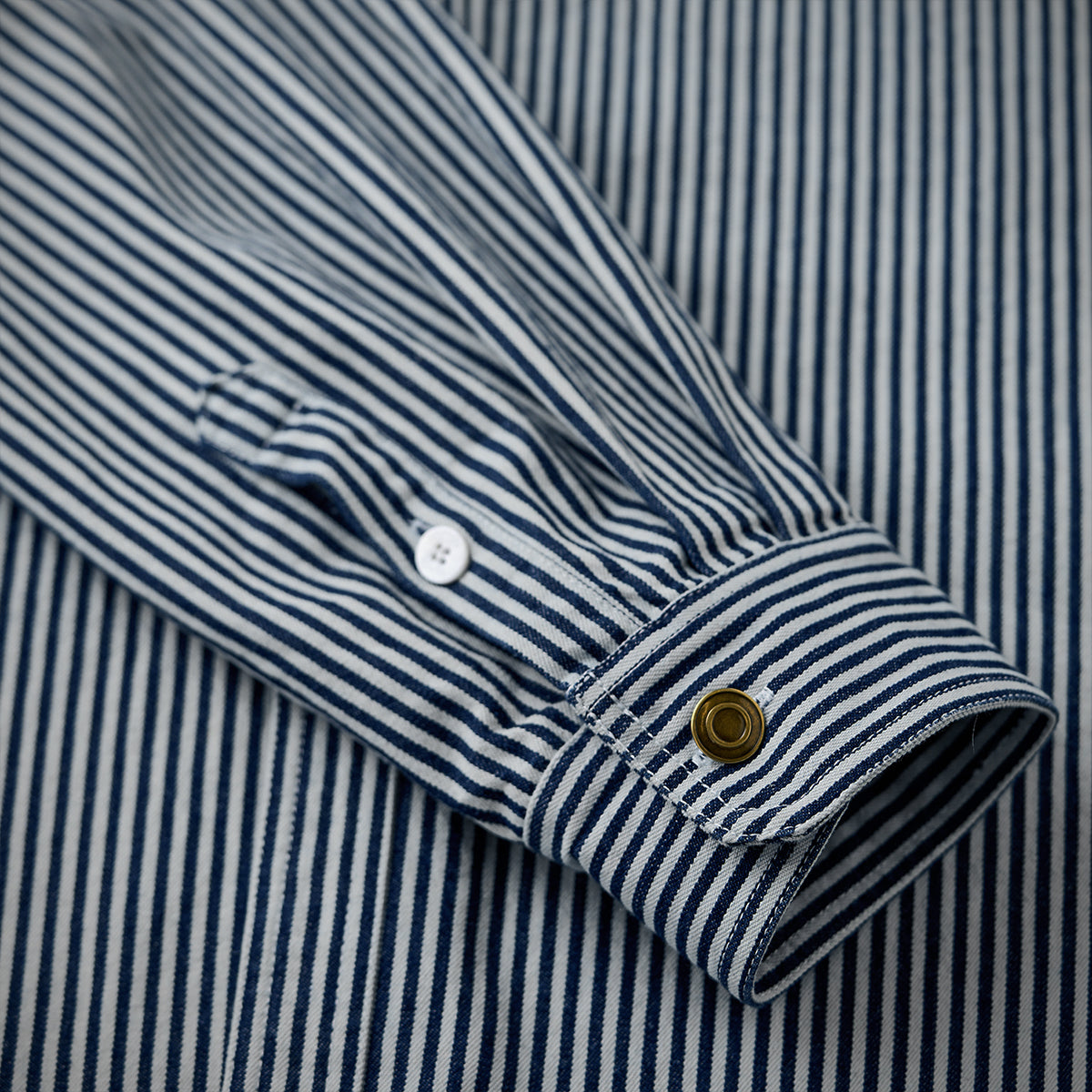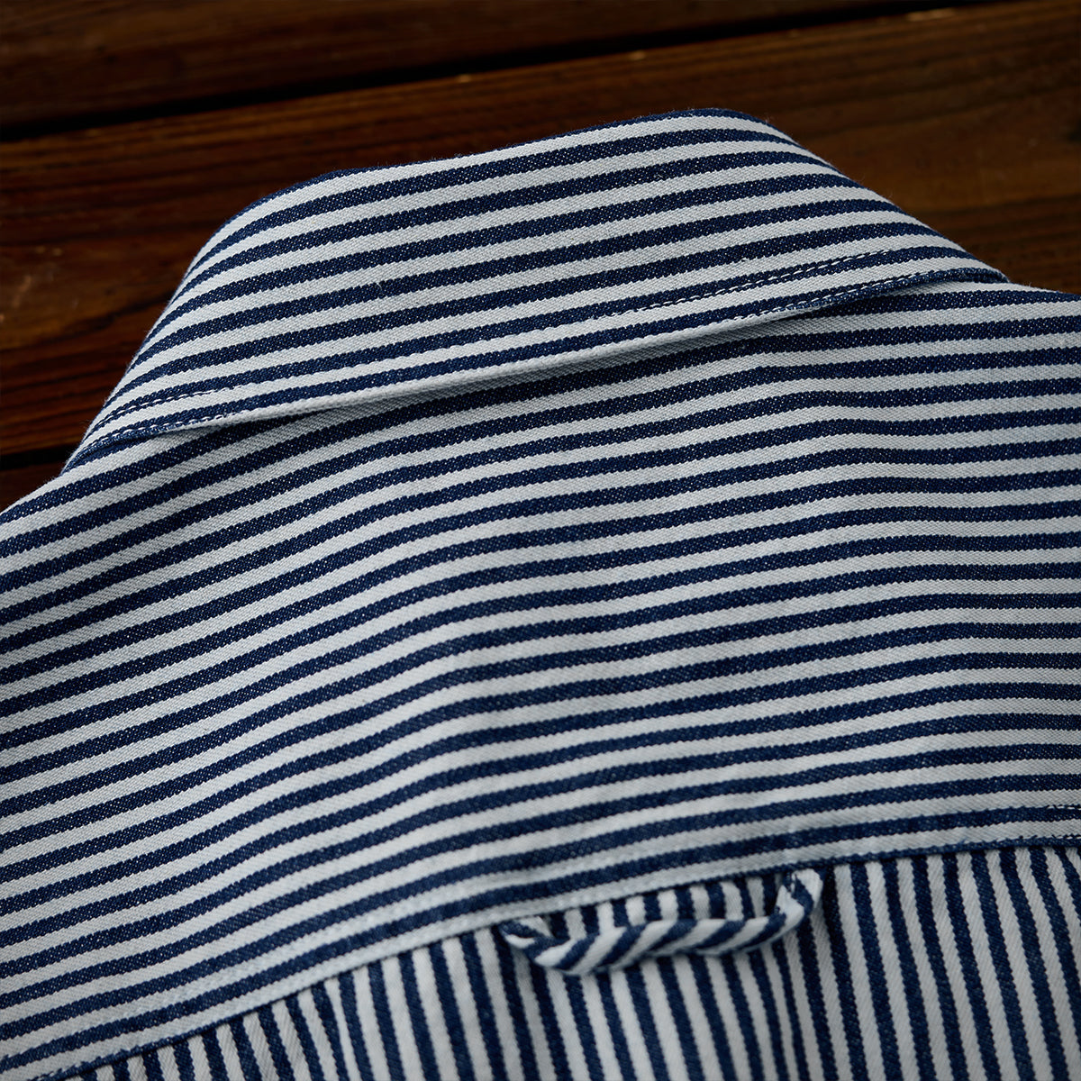 스트라이프 패턴과 선염 기법으로 클래식하면서도 자연스러운 멋을 살린 셔츠로, 대칭 포켓과 자수 와펜, 고동색 단추가 멋진 포인트를 더합니다.