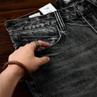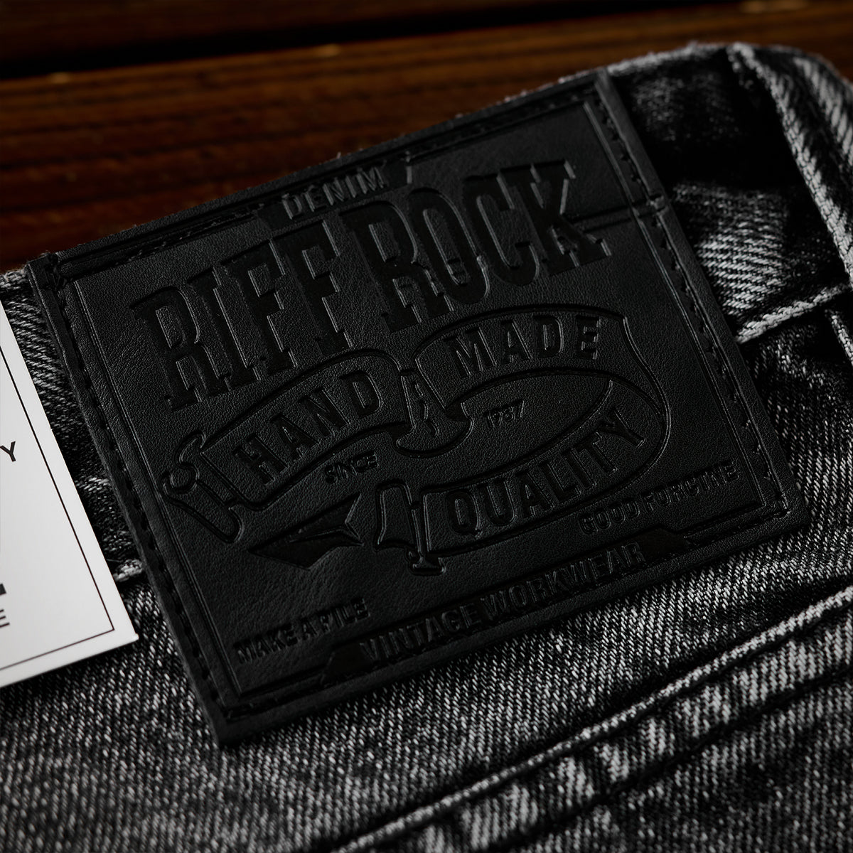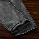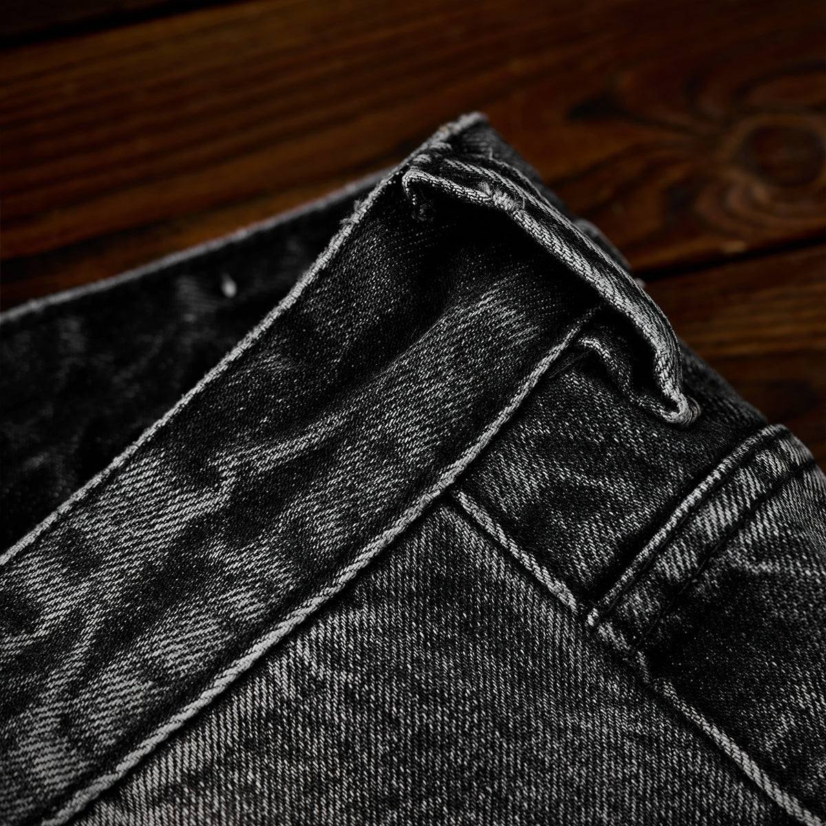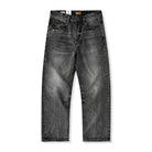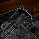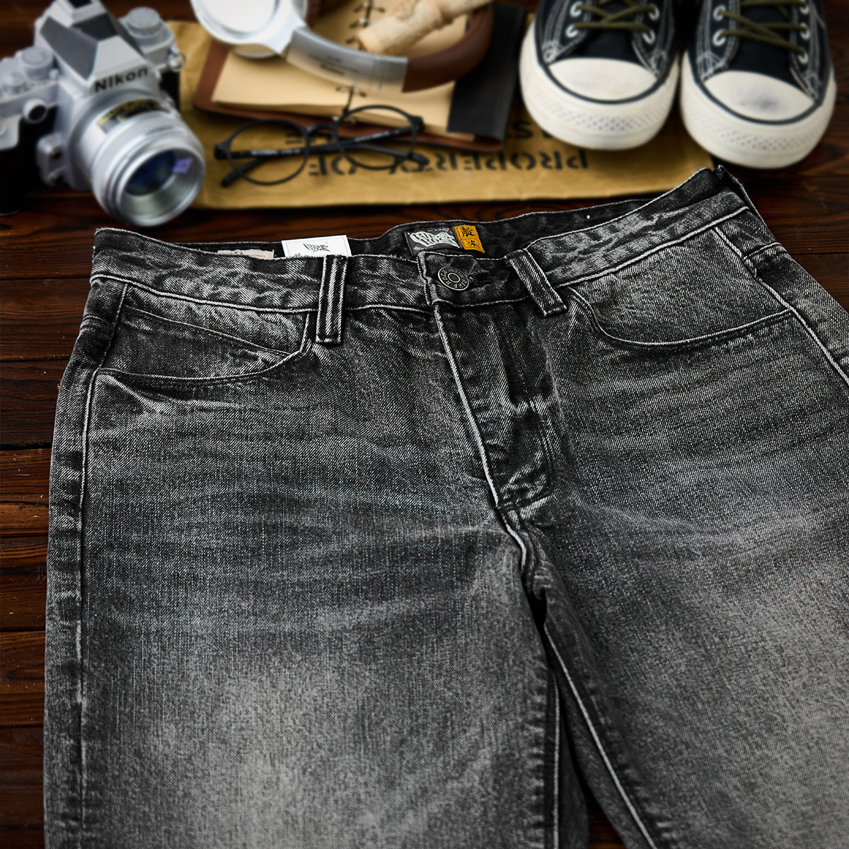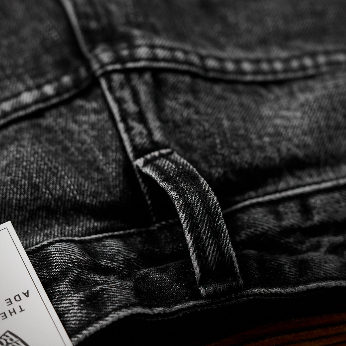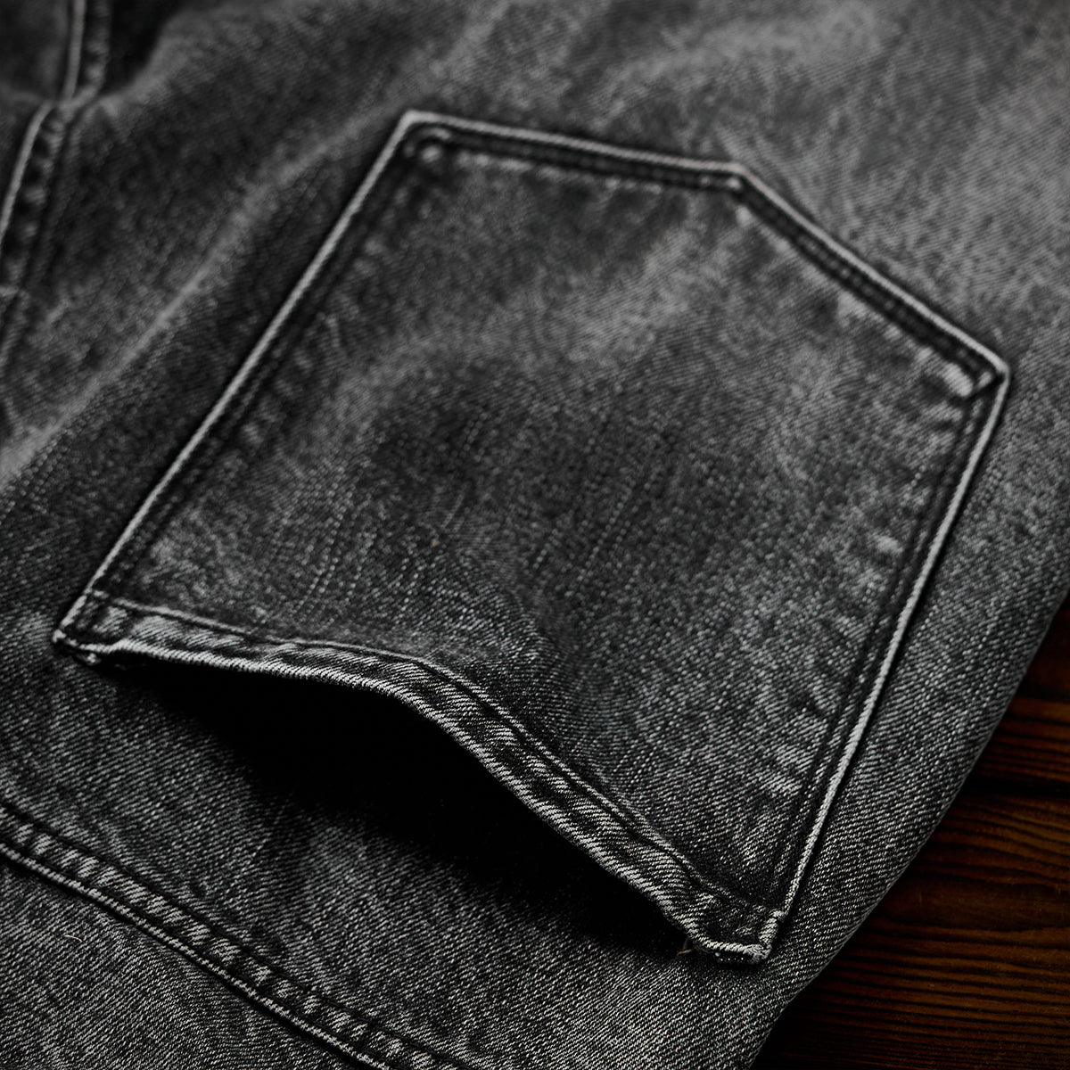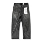 블랙 데님에 화이트 페이드 가공을 적용해 빈티지한 멋을 강조했습니다. 프론트와 허벅지 부분의 물빠짐 가공이 입체감을 더해줍니다.