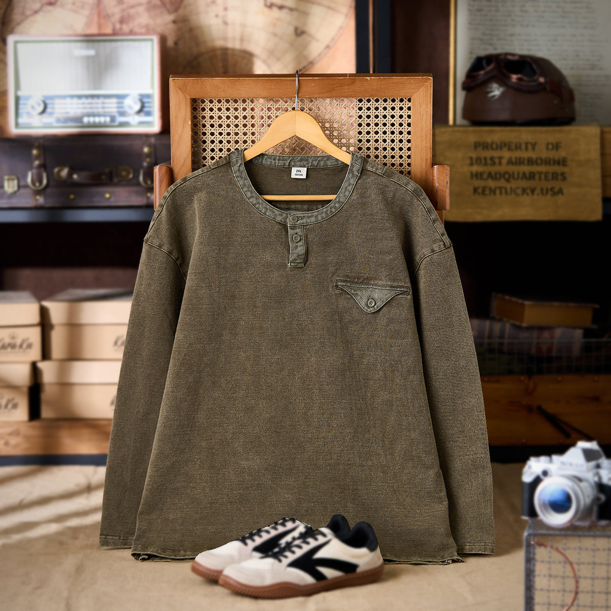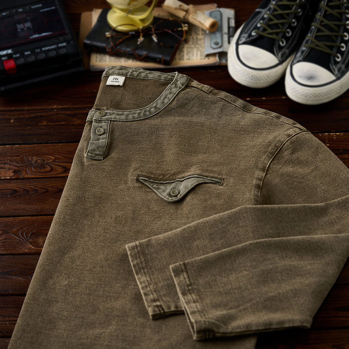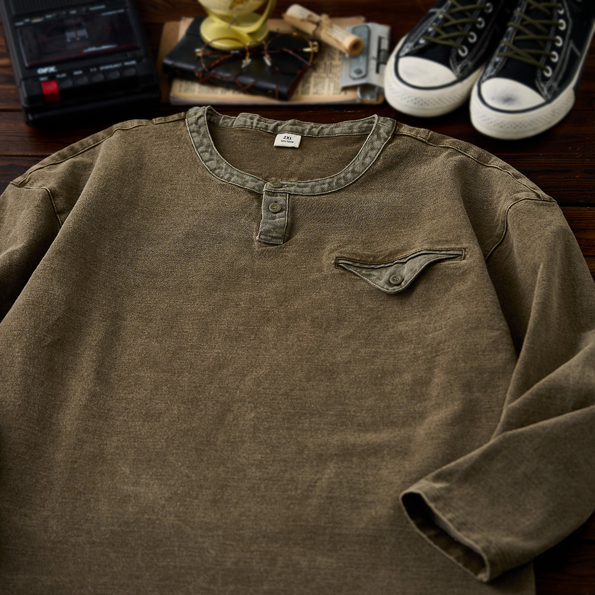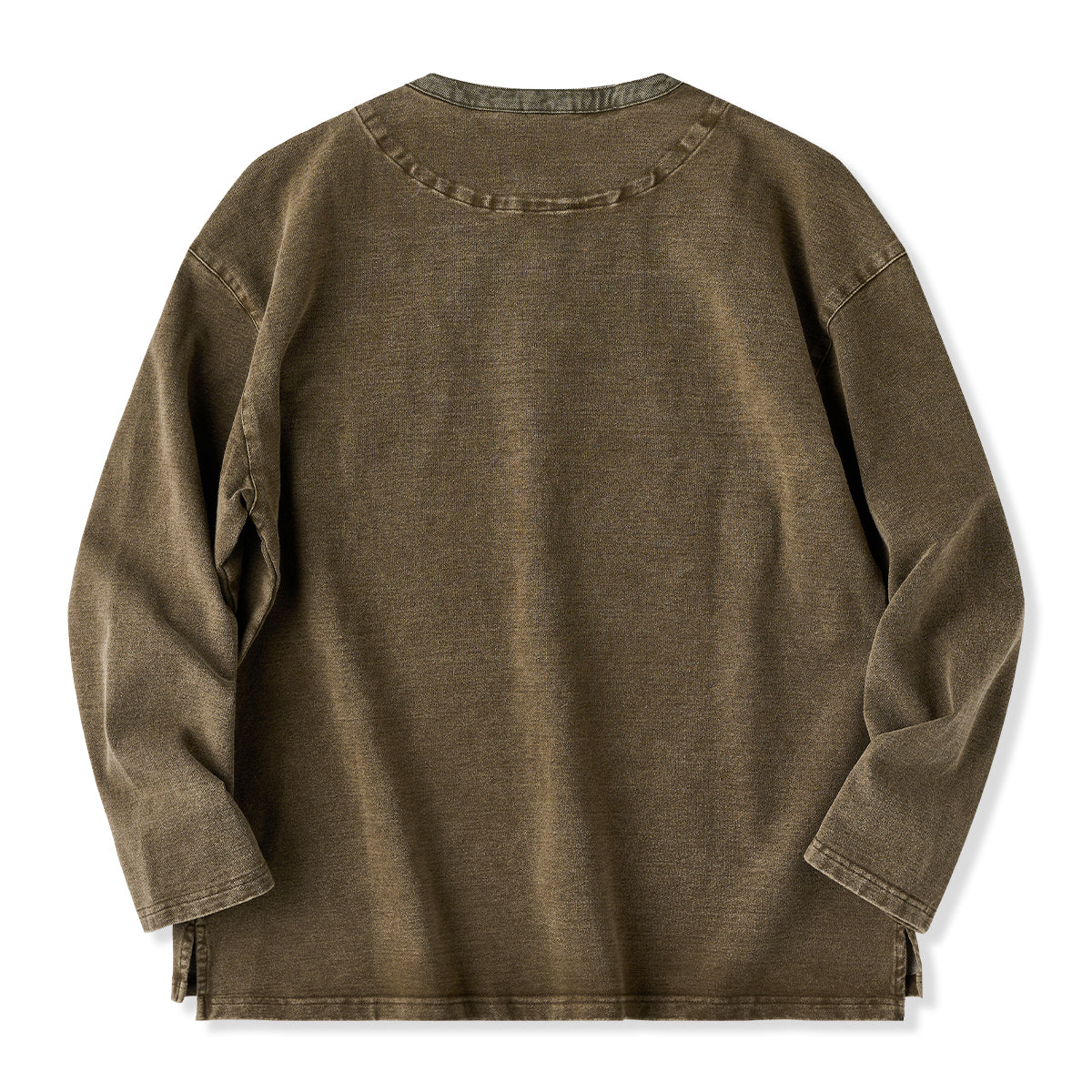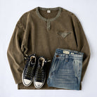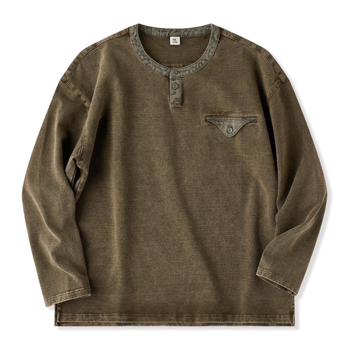 헨리넥 디자인과 페이크 포켓 디테일, 부드러운 면 소재로 제작되어 빈티지한 분위기를 연출하며, 단독 착용만으로도 편안하게 스타일링 가능한 티셔츠입니다.