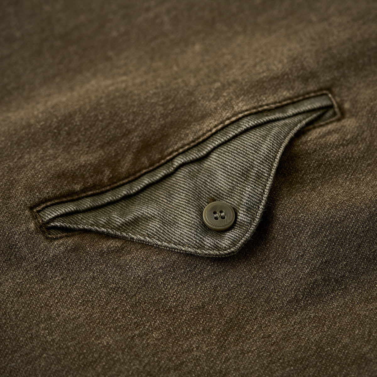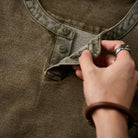 가슴쪽 페이크 포켓과 잔 스티치, 버튼 장식으로 포인트를 주었으며, 네크라인과 포켓 플랩에 트윌 원단을 사용해 소재 조합으로 세련된 디테일을 완성했습니다.