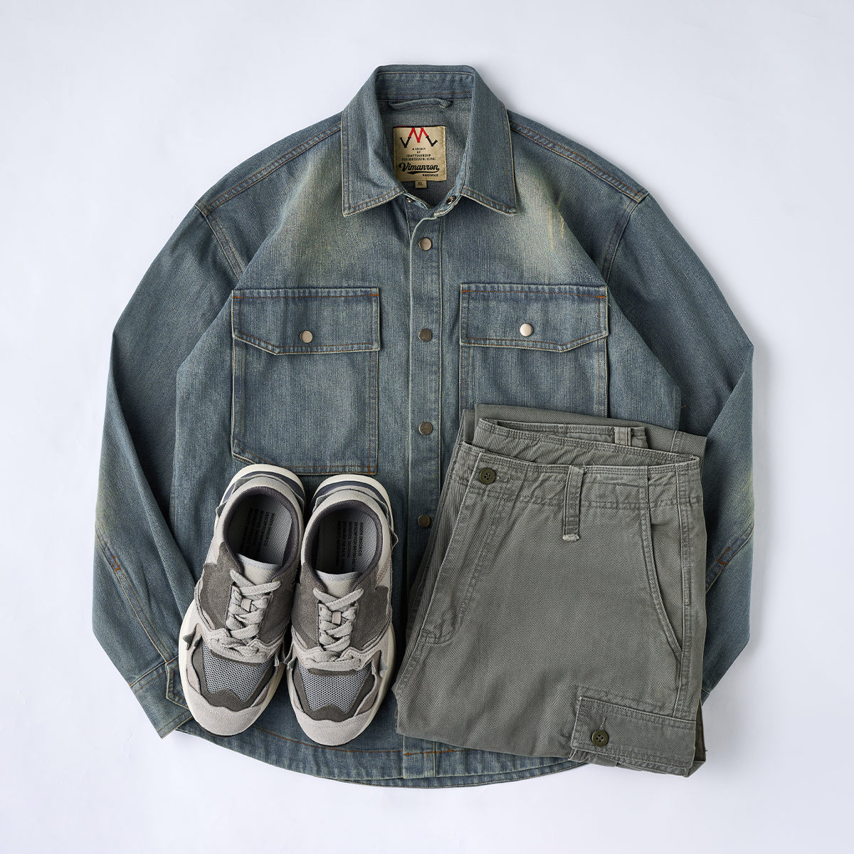 양쪽 가슴의 큰 플랩 포켓과 스냅 단추로 실용성을 살린 워크 셔츠. 라운드 테일과 릴렉스핏으로 편하게 입을 수 있으며, 전면·후면 워싱으로 자연스러운 페이드와 입체감이 돋보입니다.