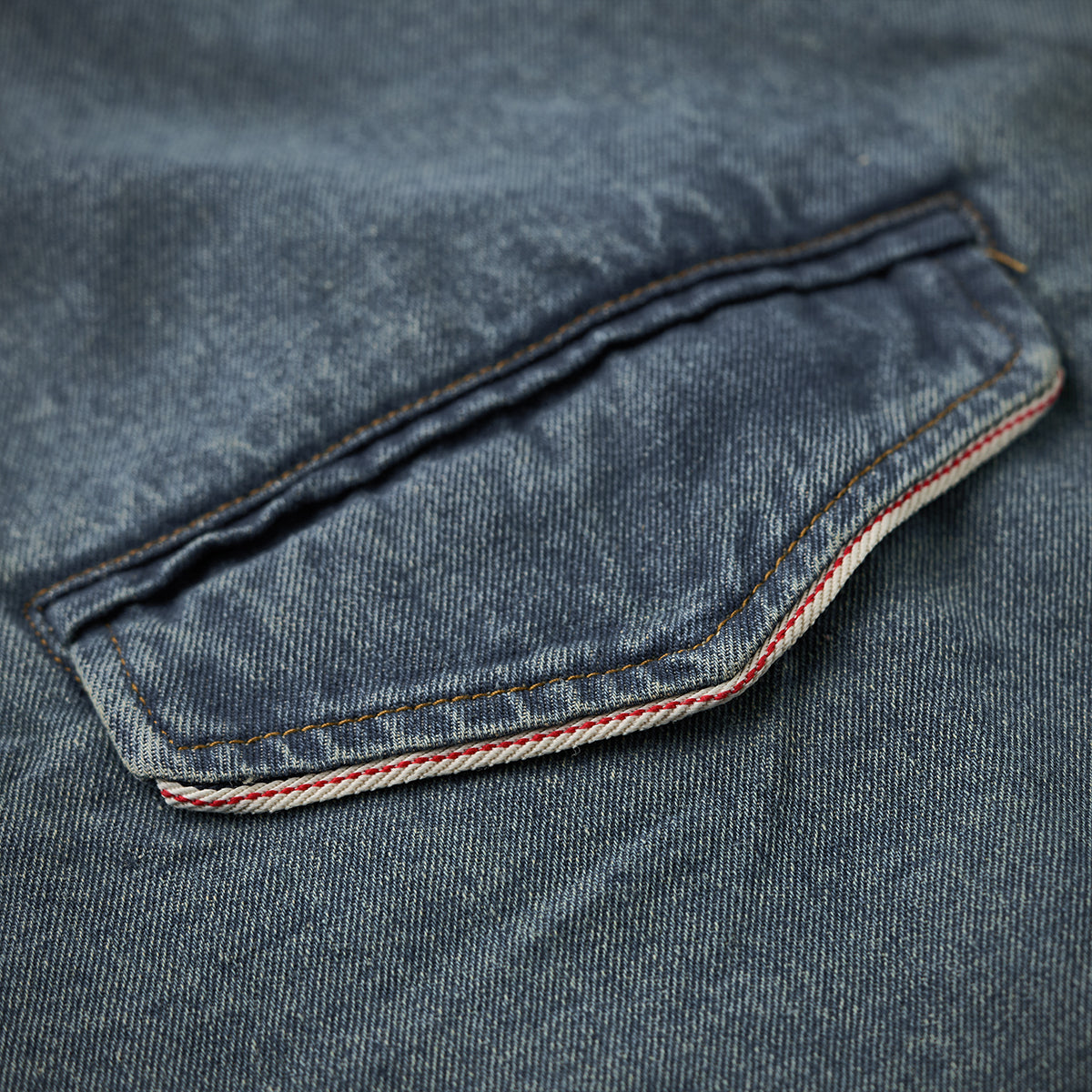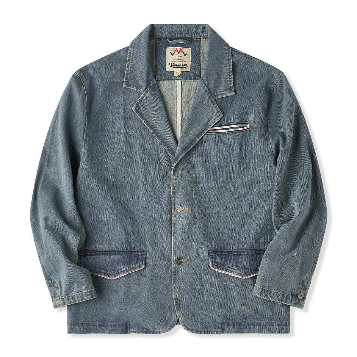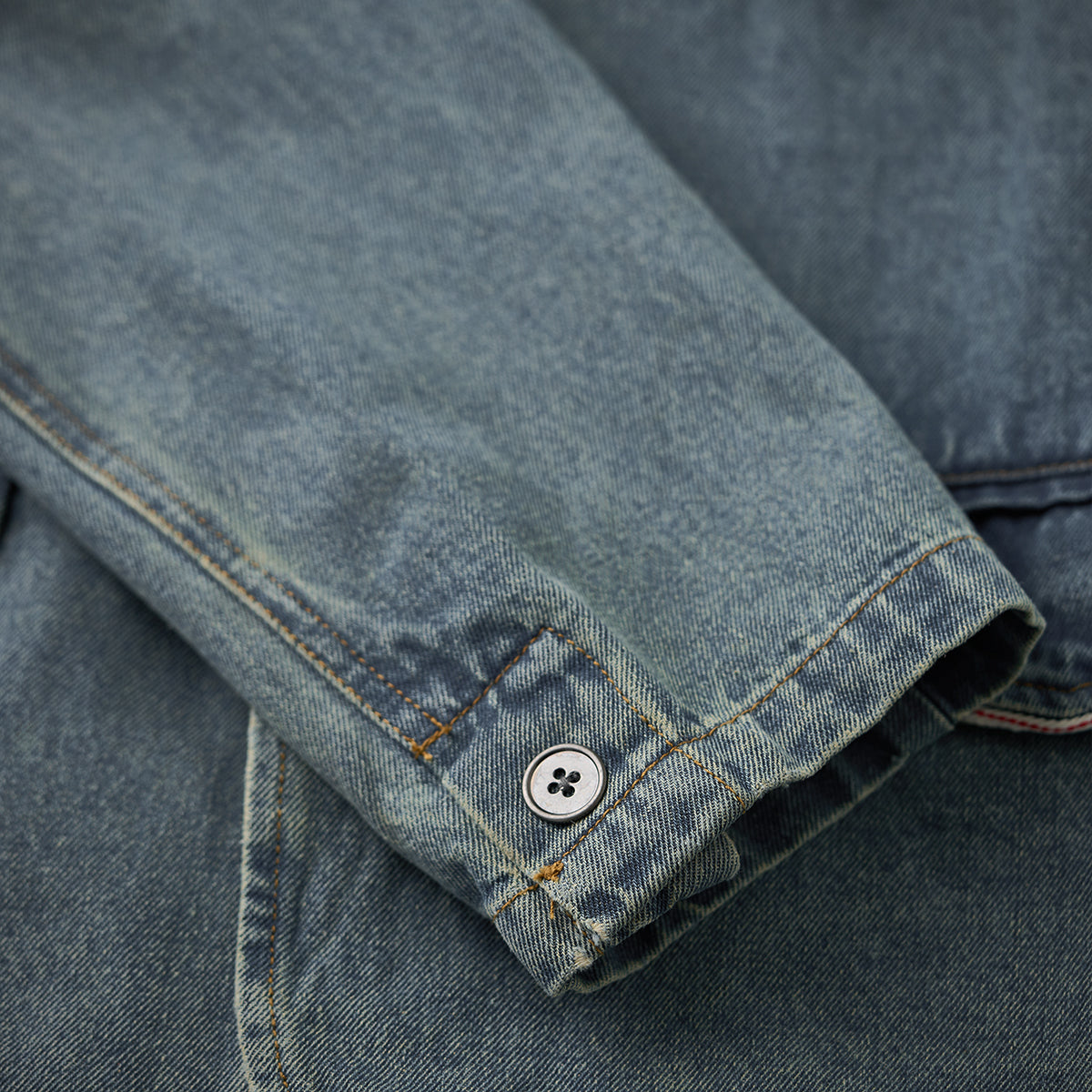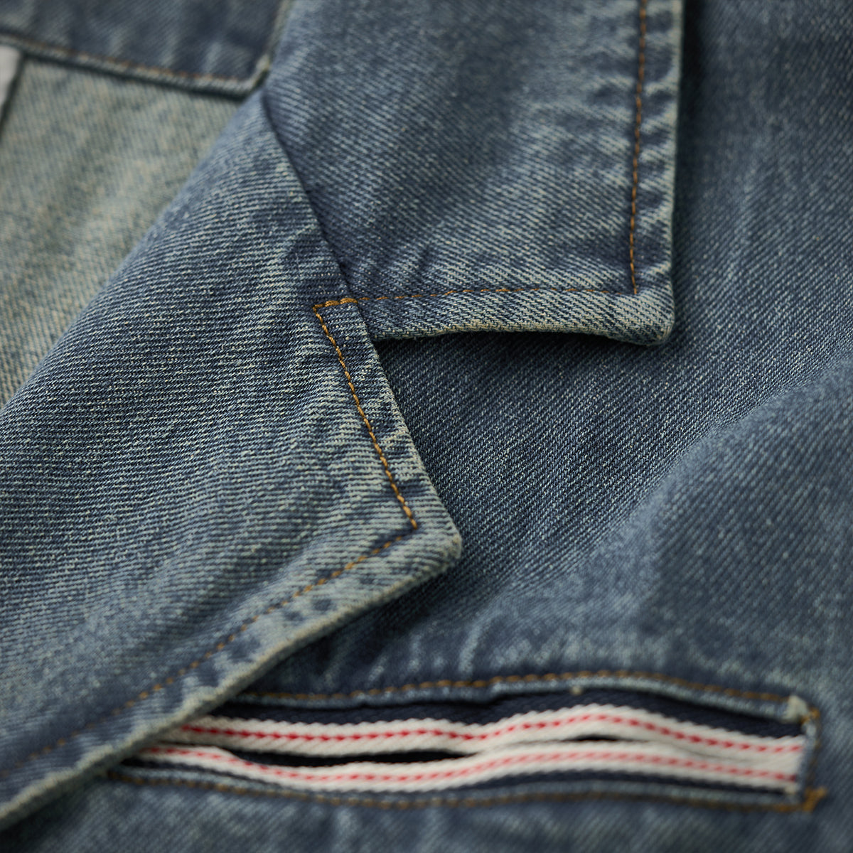 앞면 버튼과 포켓 디테일, 포켓 스티치로 실용성과 디자인을 모두 갖춘 데님 테일러드 자켓입니다.