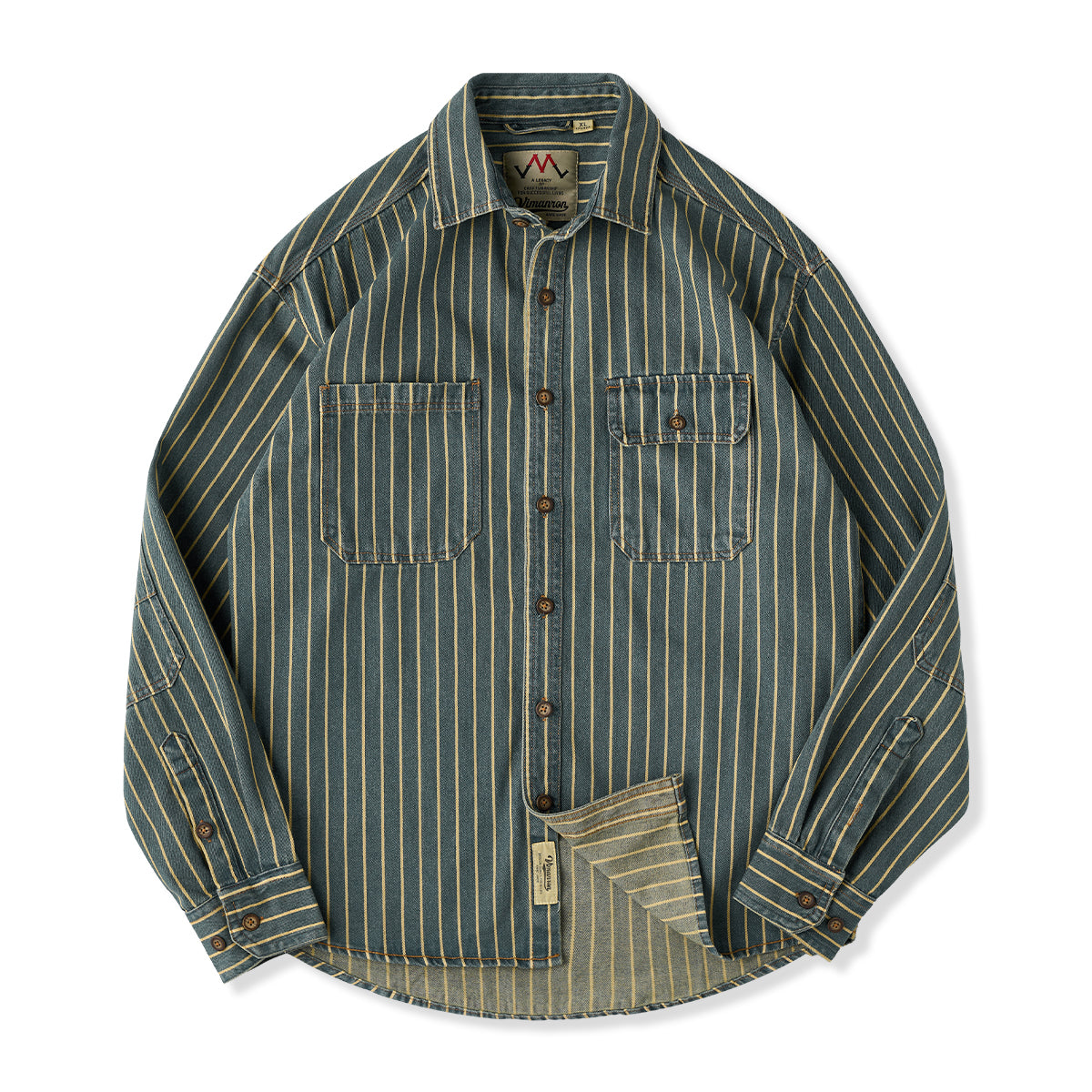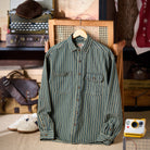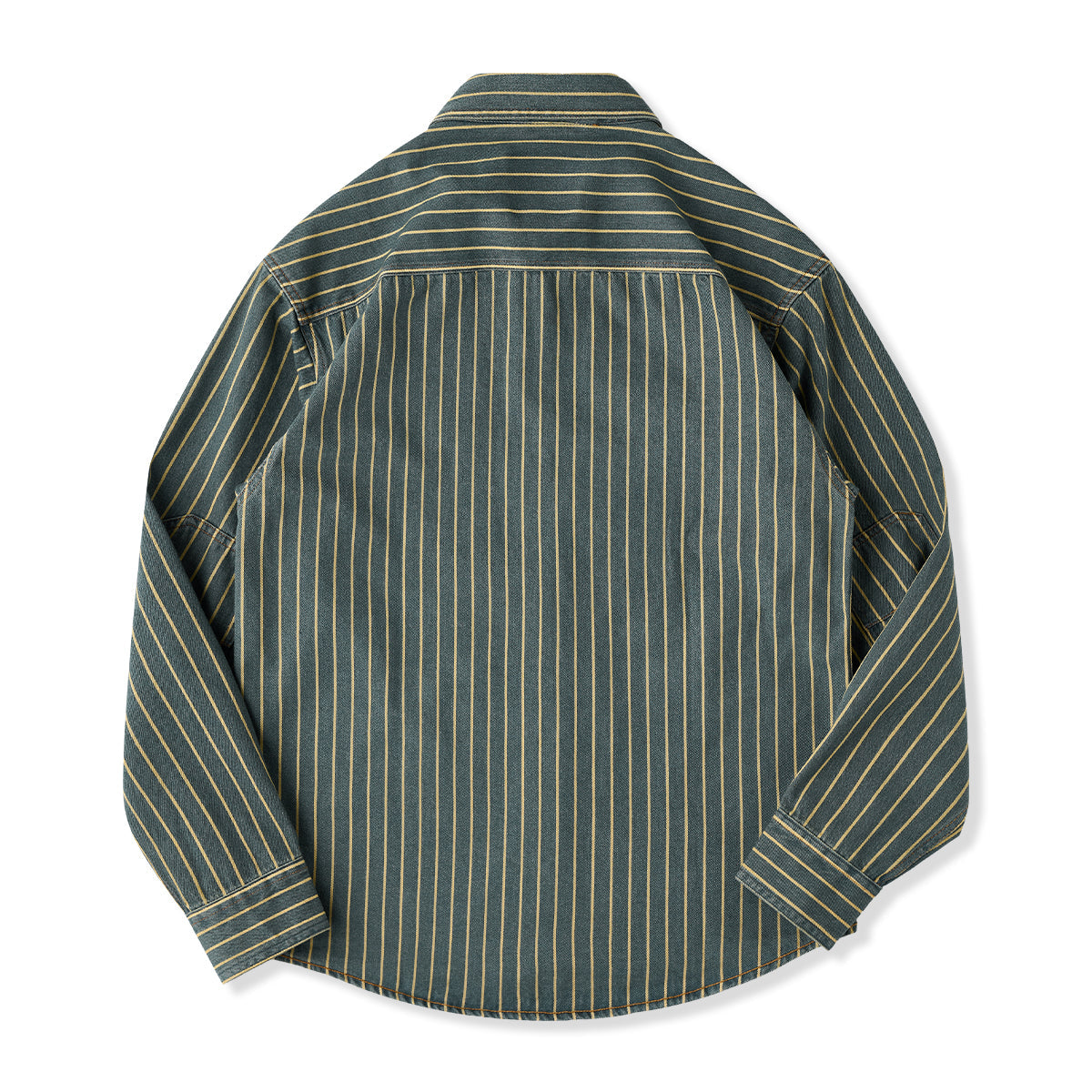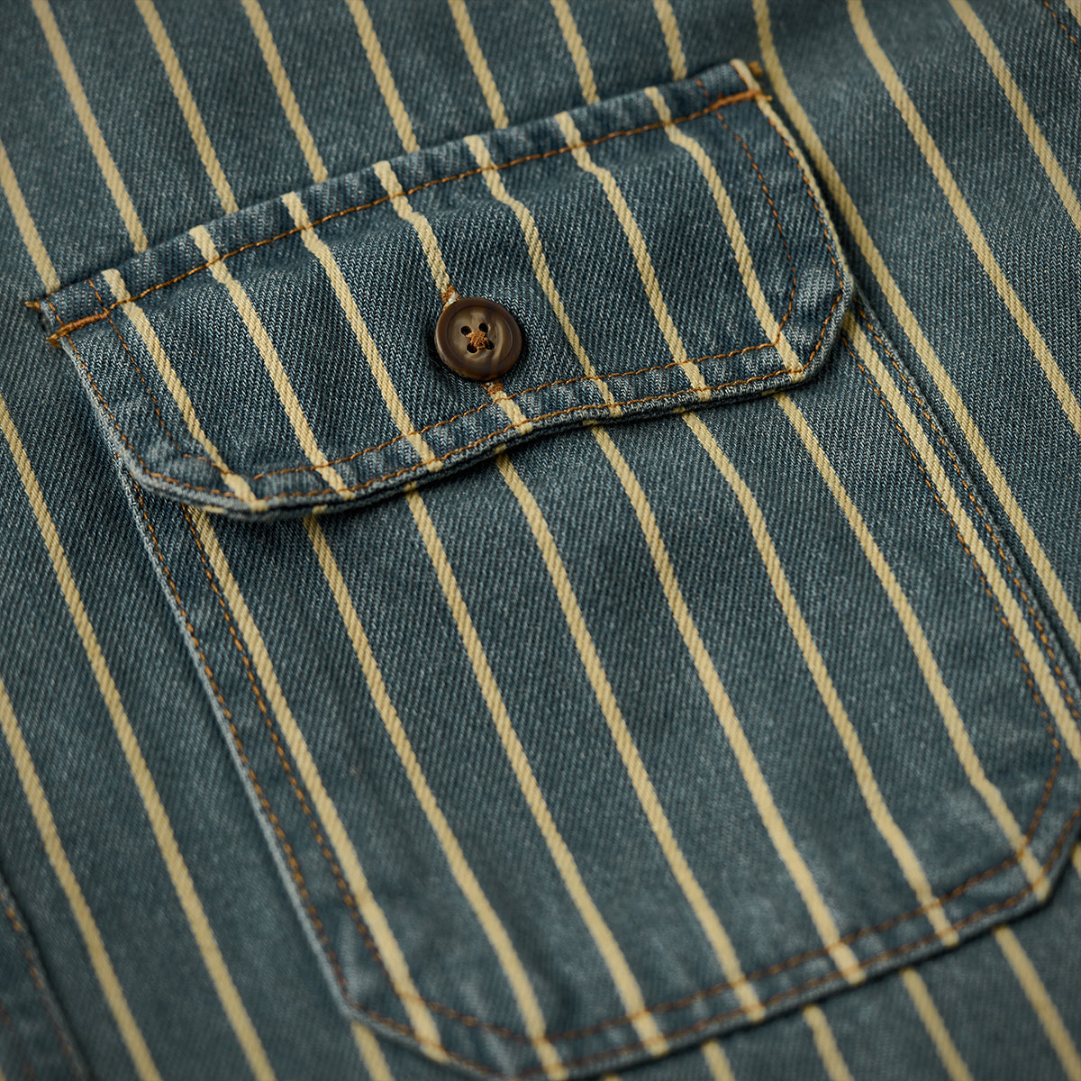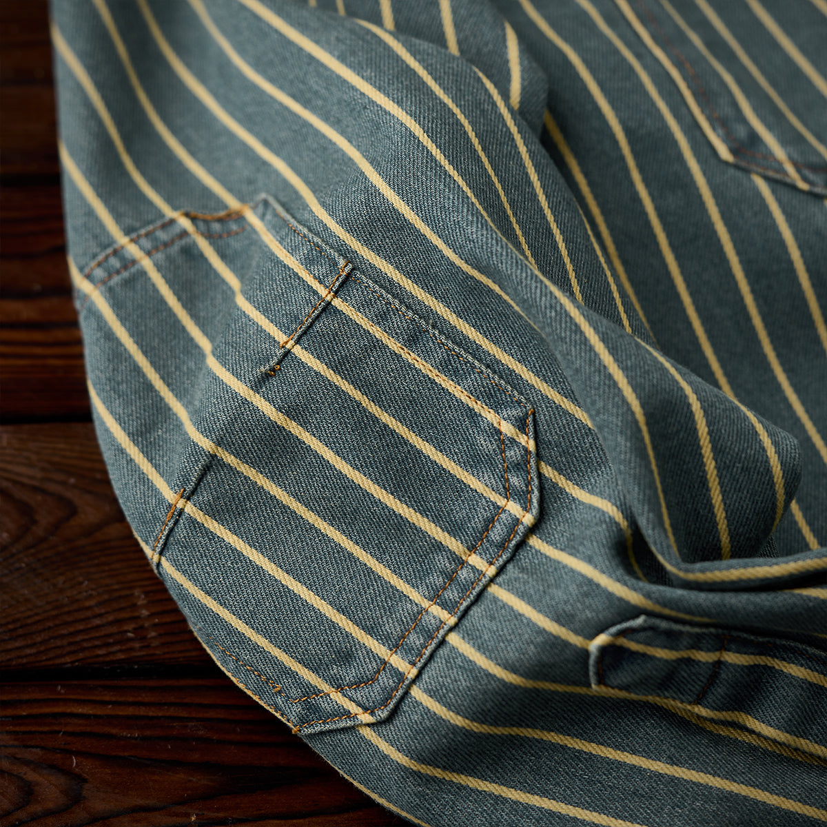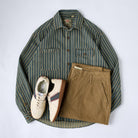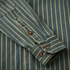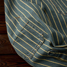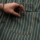 좌우 비대칭 포켓 스트라이프 패턴 워시드 데님 워크 셔츠