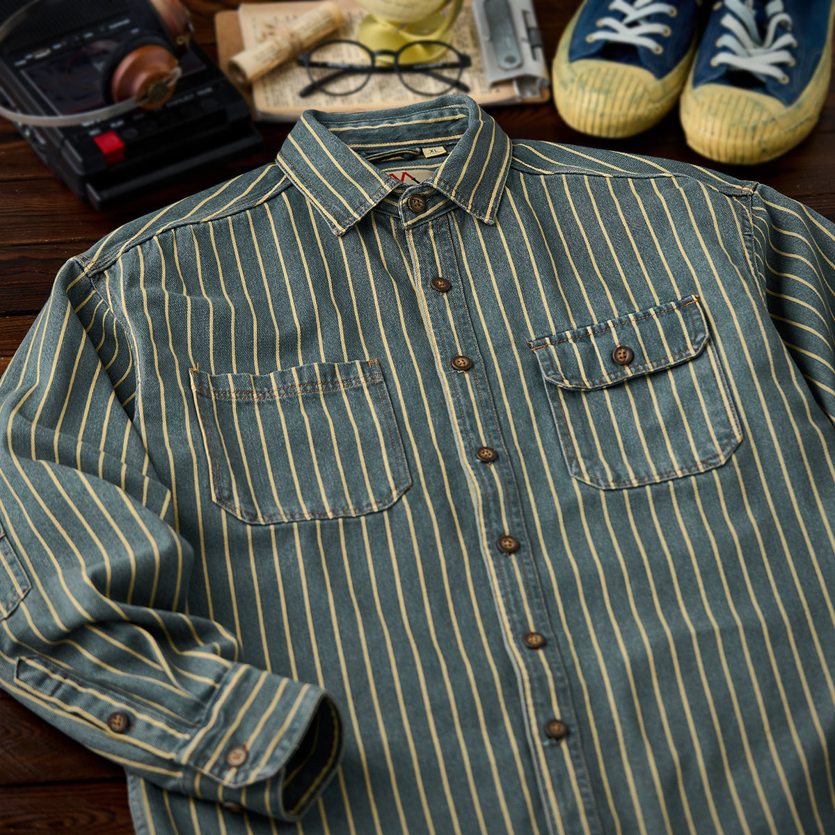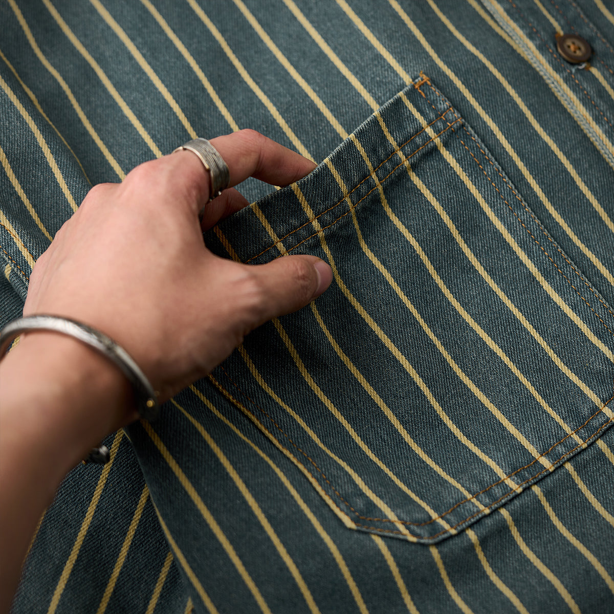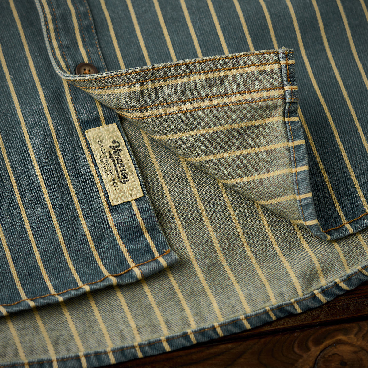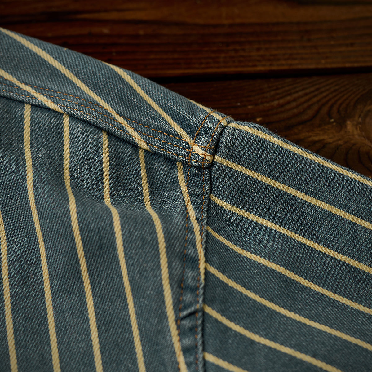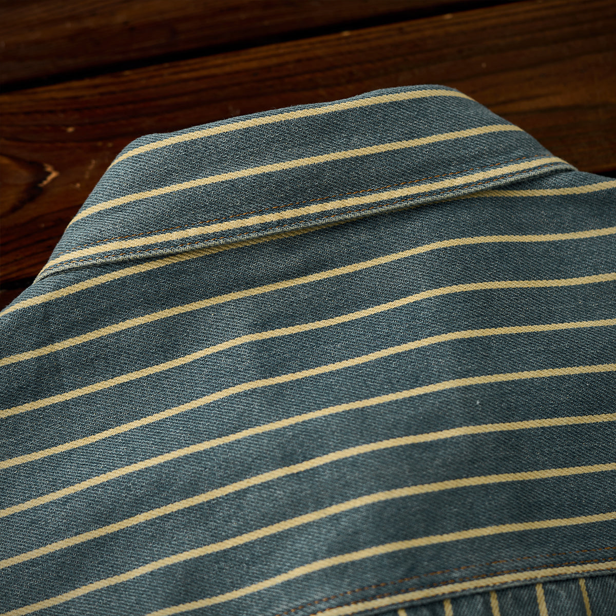좌우 비대칭 포켓 스트라이프 패턴 워시드 데님 워크 셔츠
