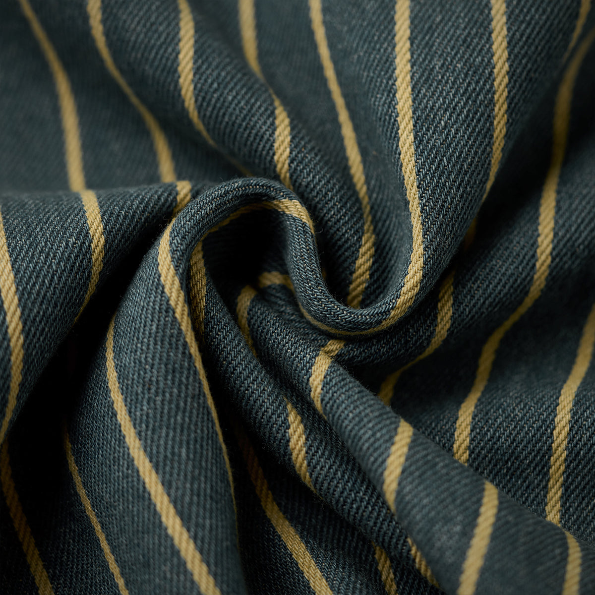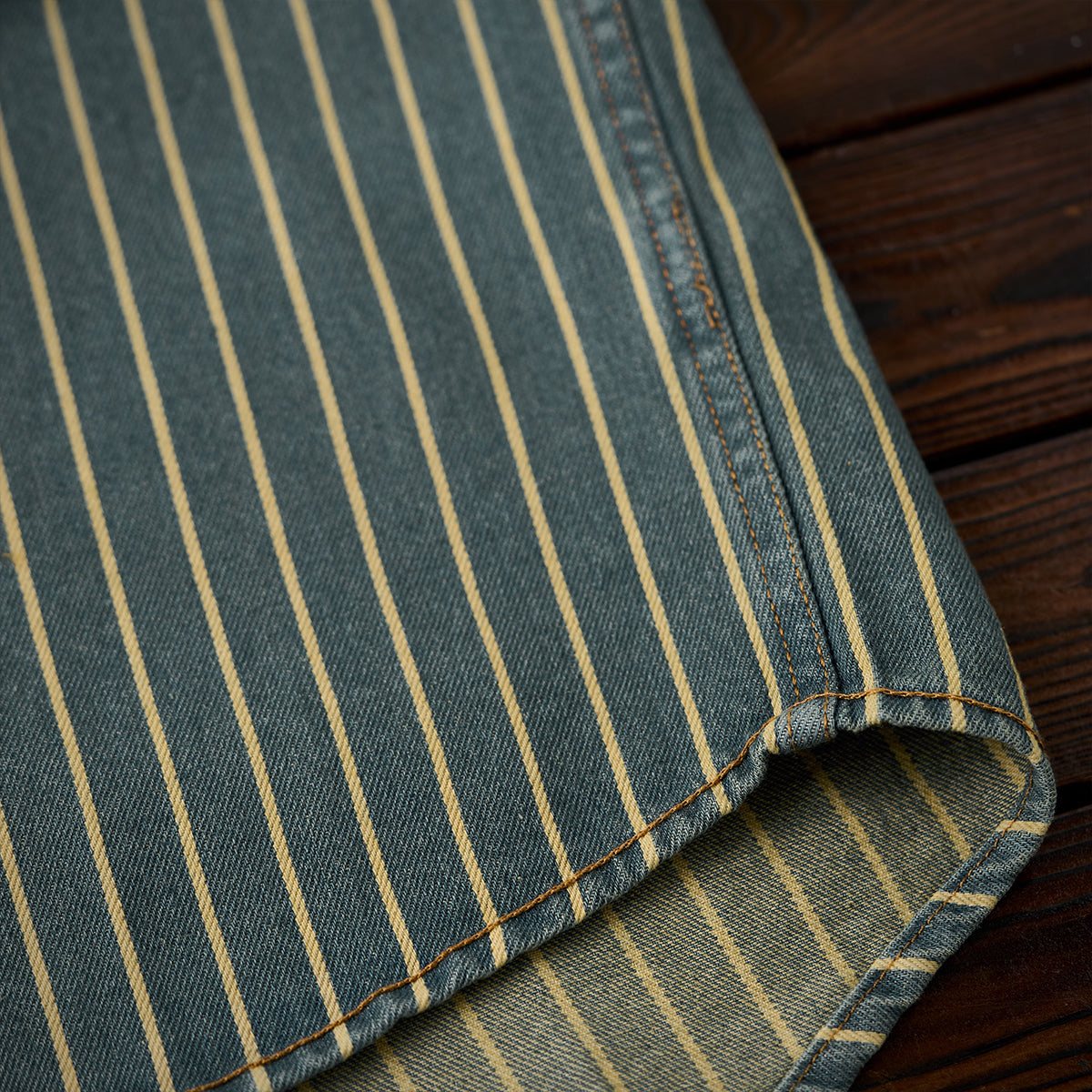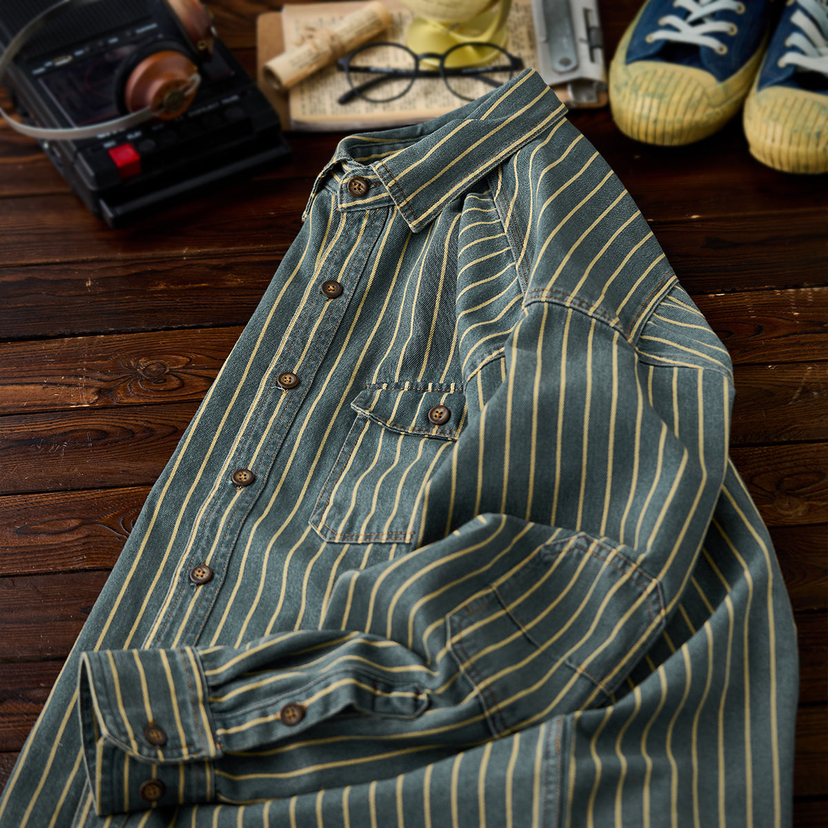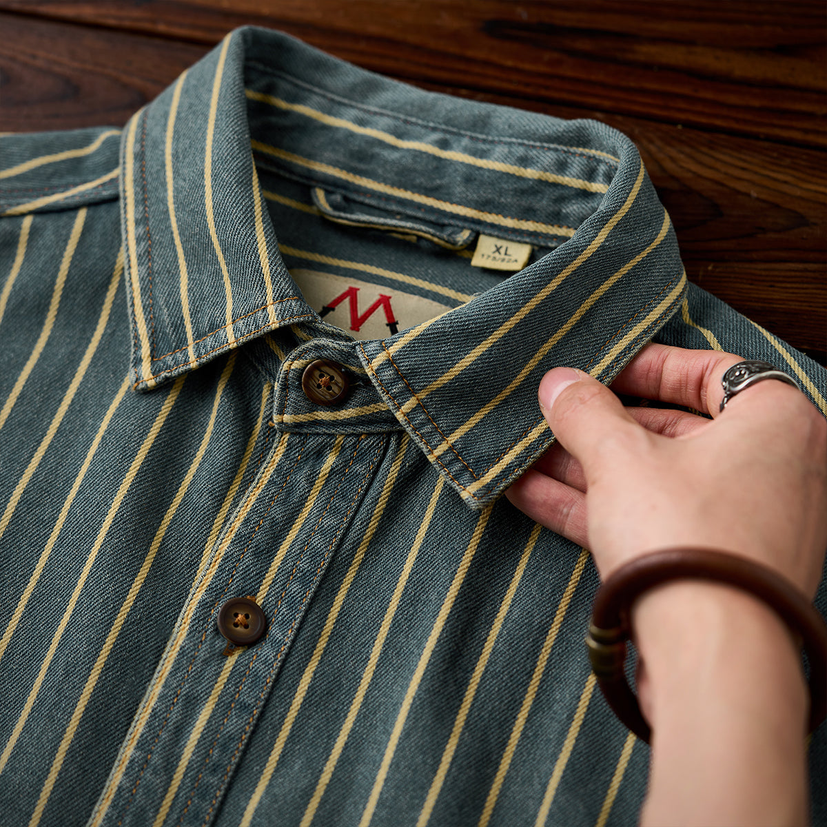 좌우 비대칭 포켓 스트라이프 패턴 워시드 데님 워크 셔츠