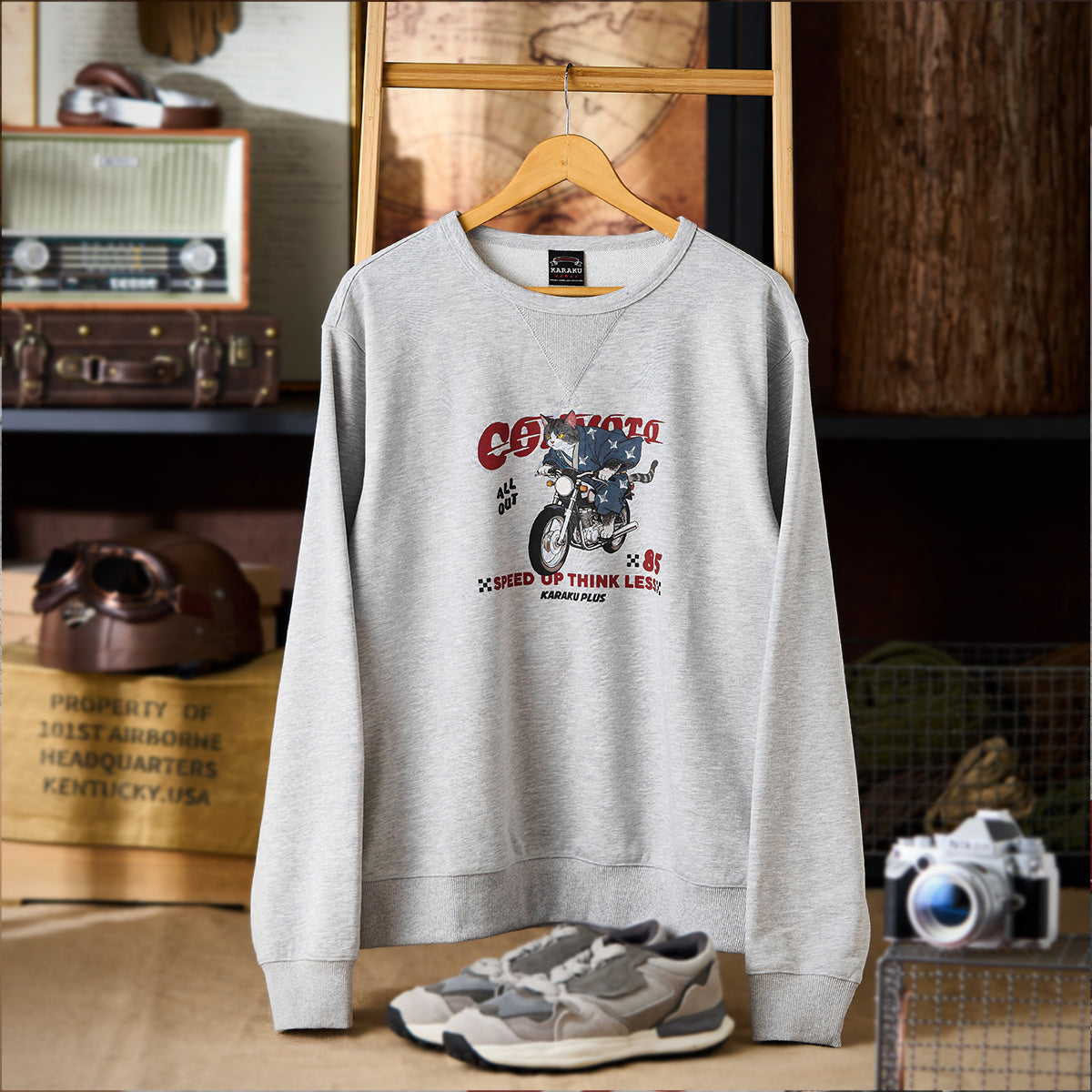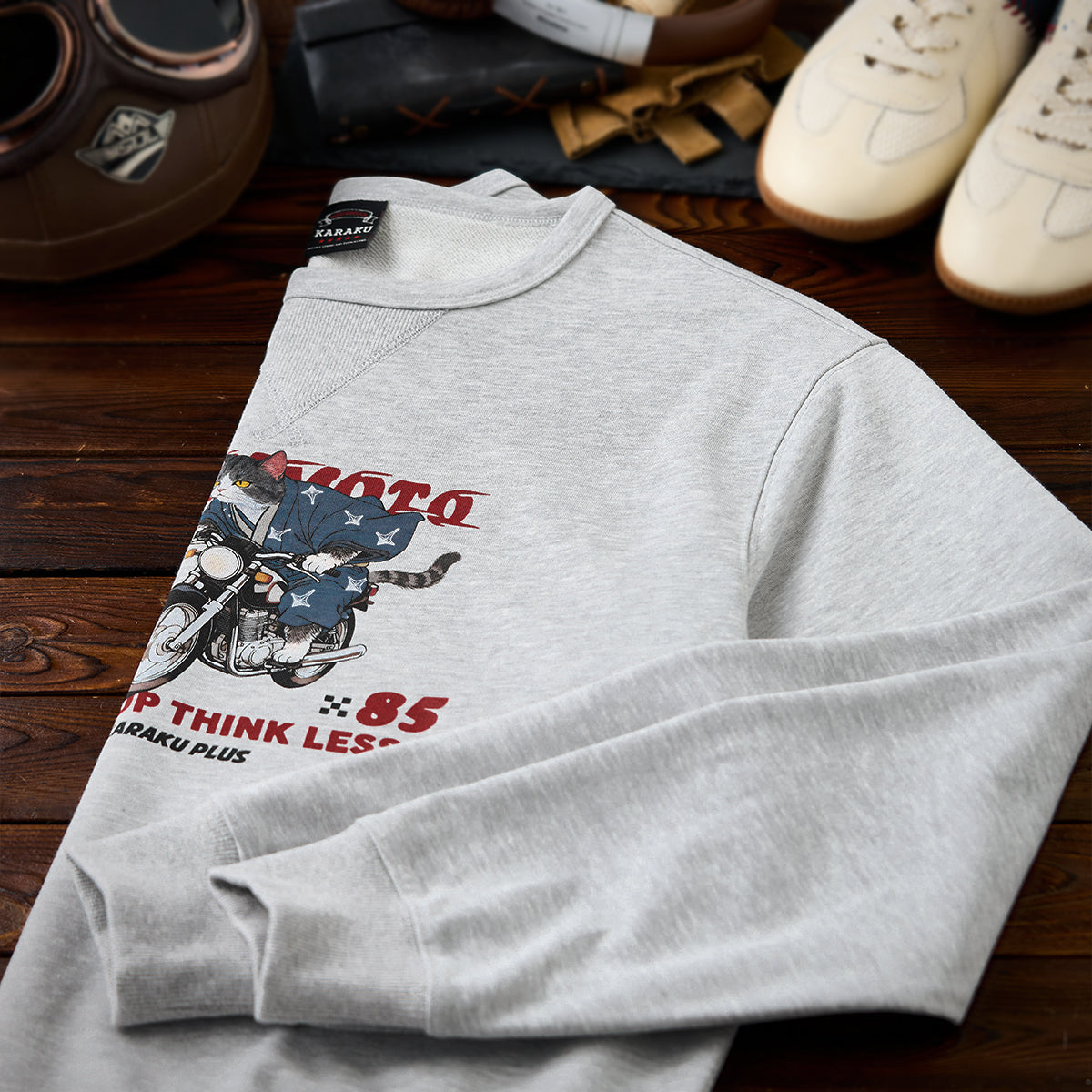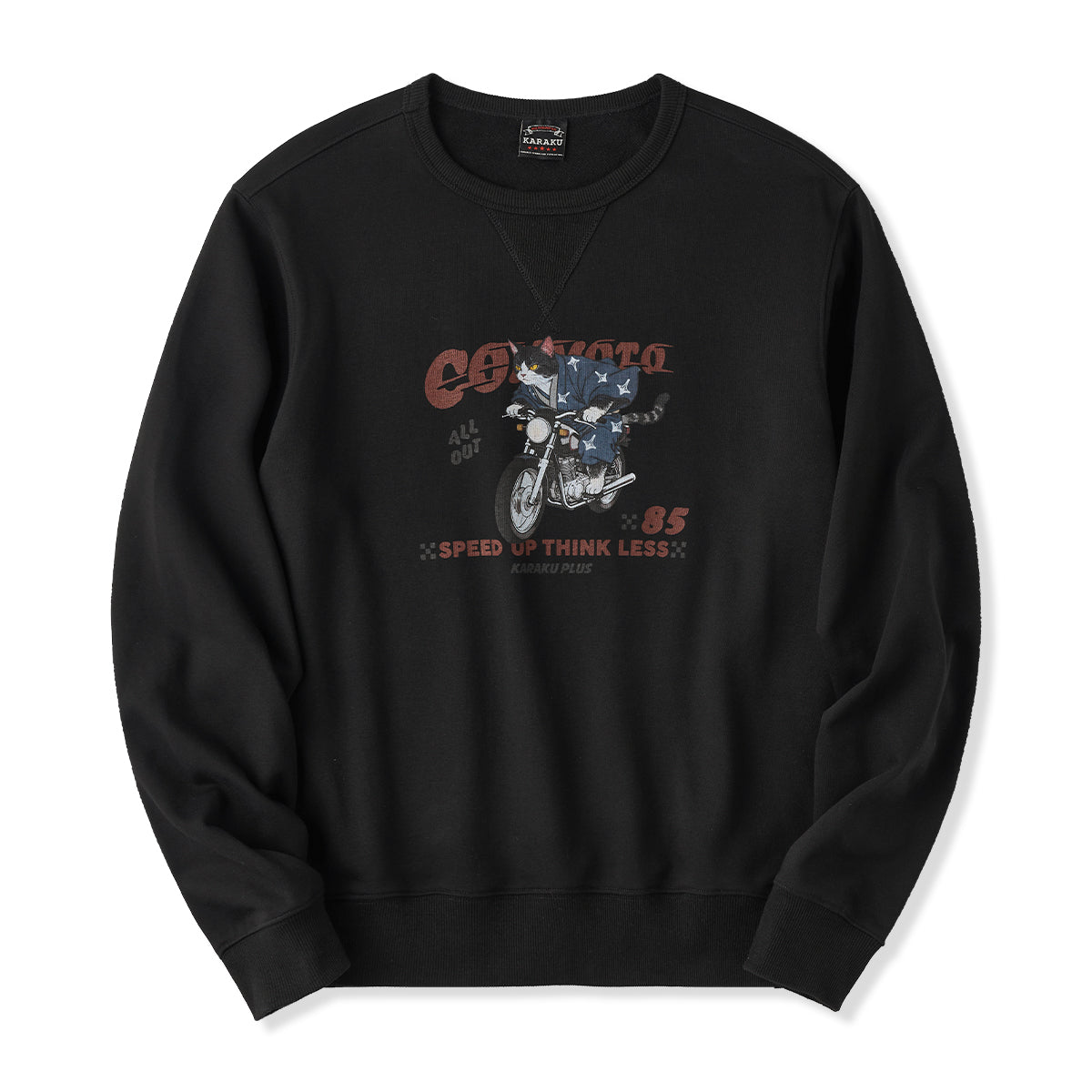 일본풍 감성과 스트리트 무드를 더한 고양이 라이더 스웨트셔츠. 유니크한 모티프이지만 부담 없이 데일리 캐주얼룩으로 즐길 수 있습니다.
