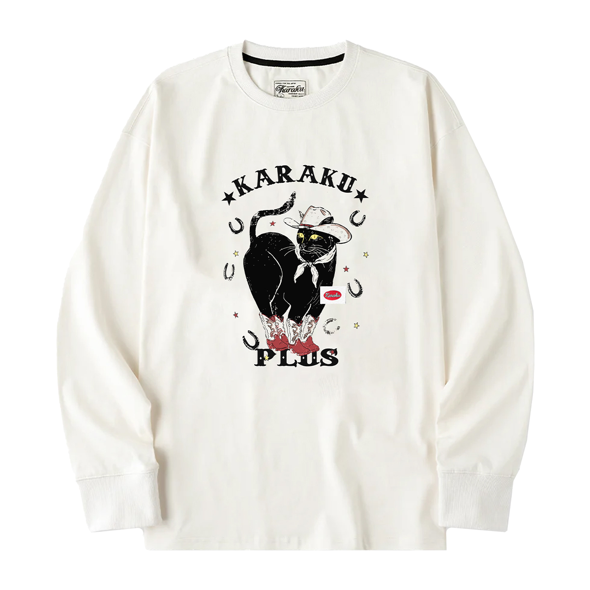 유머러스한 카우보이 고양이 그래픽이 돋보이는 화이트 컬러의 면 소재 골지 긴팔 아이템으로, 편안한 착용감과 함께 데일리 코디에 활용하기 좋은 제품입니다.