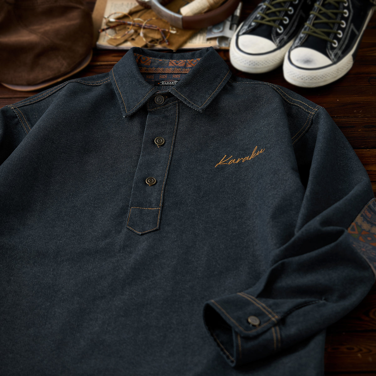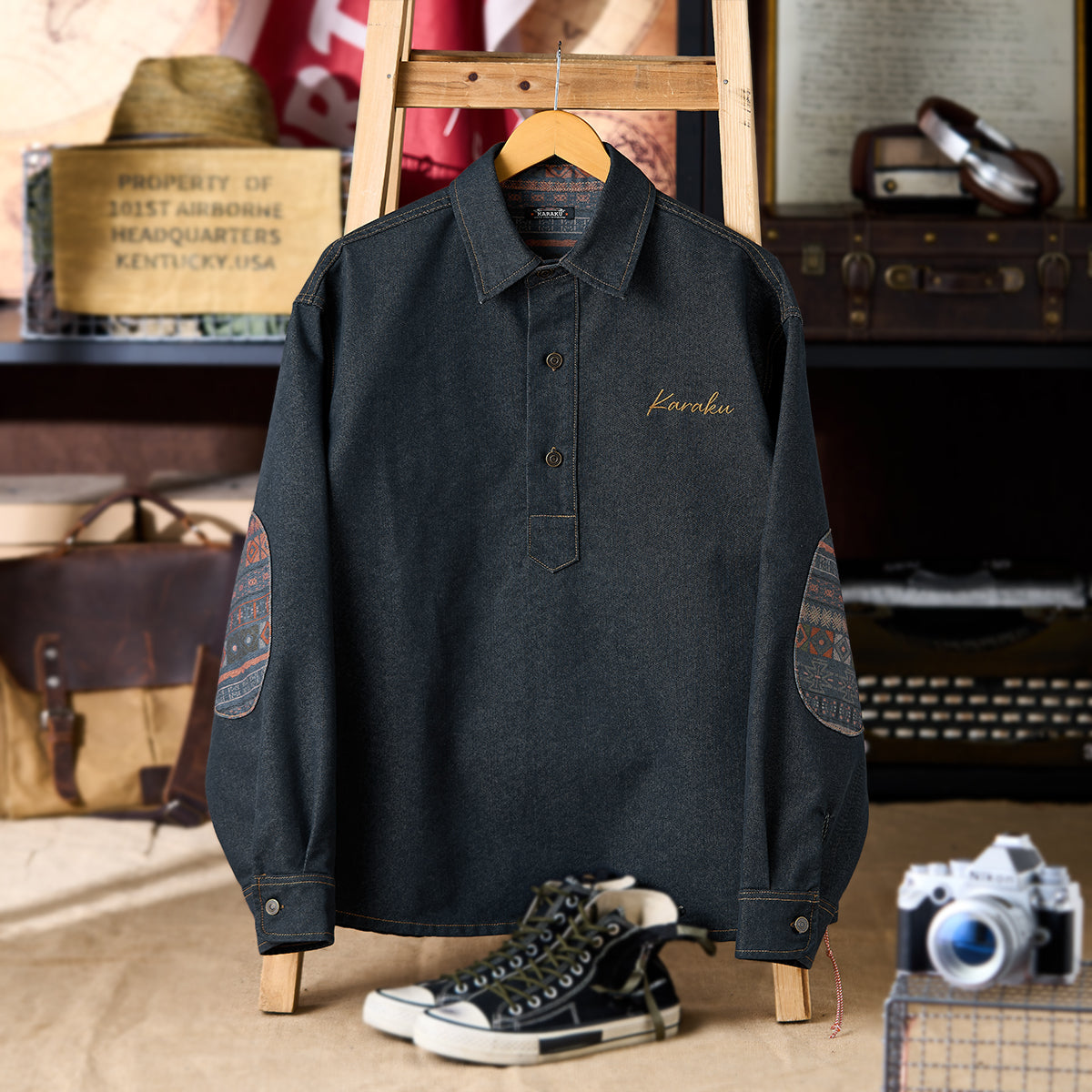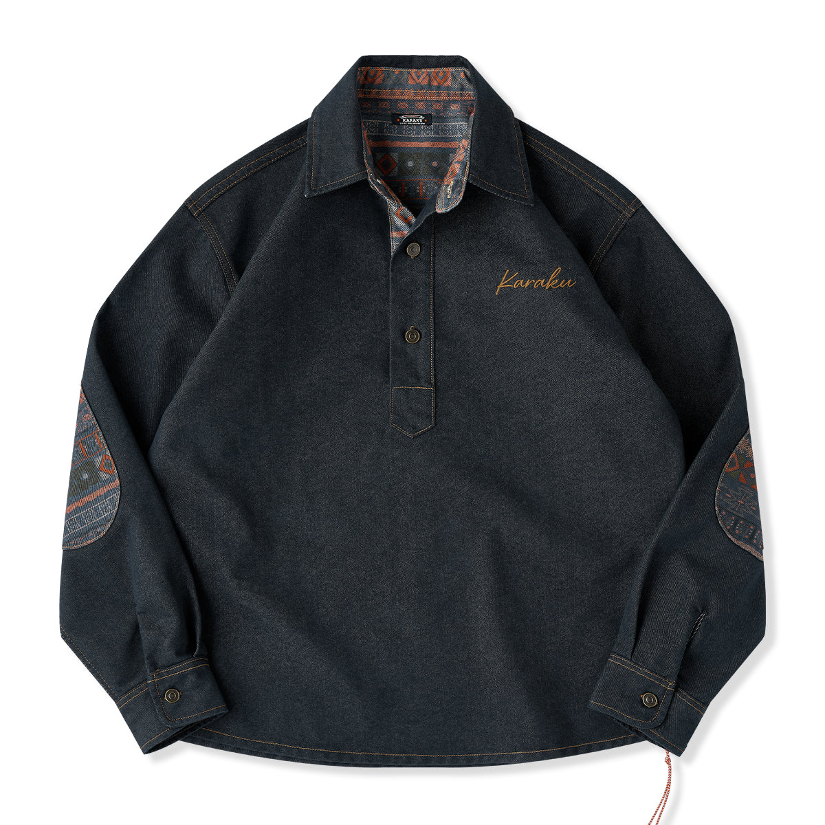 【사전예약】「KaraKu」로고 자수 나바호 패턴 팔꿈치 패치 하프 지퍼 데님 스웨트셔츠