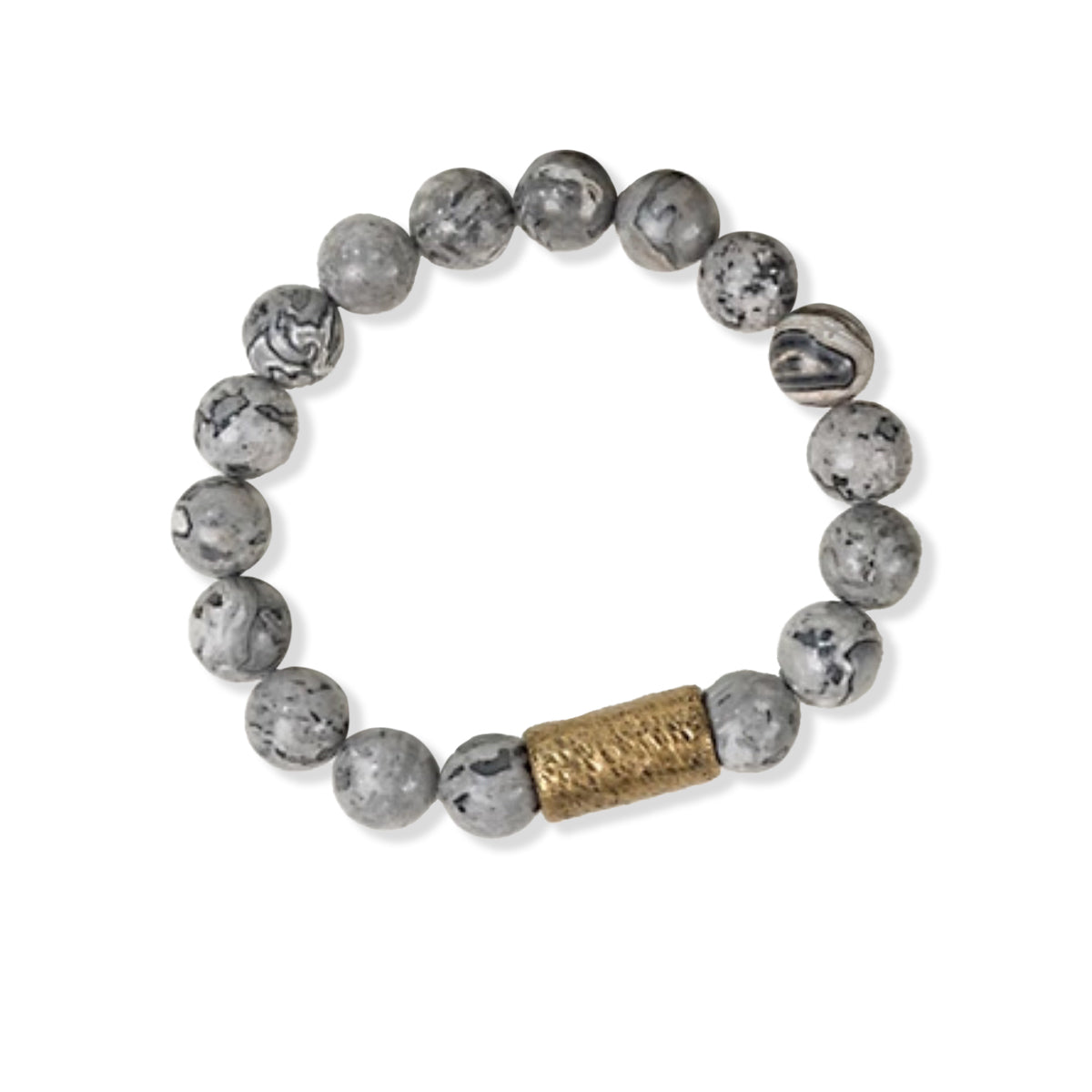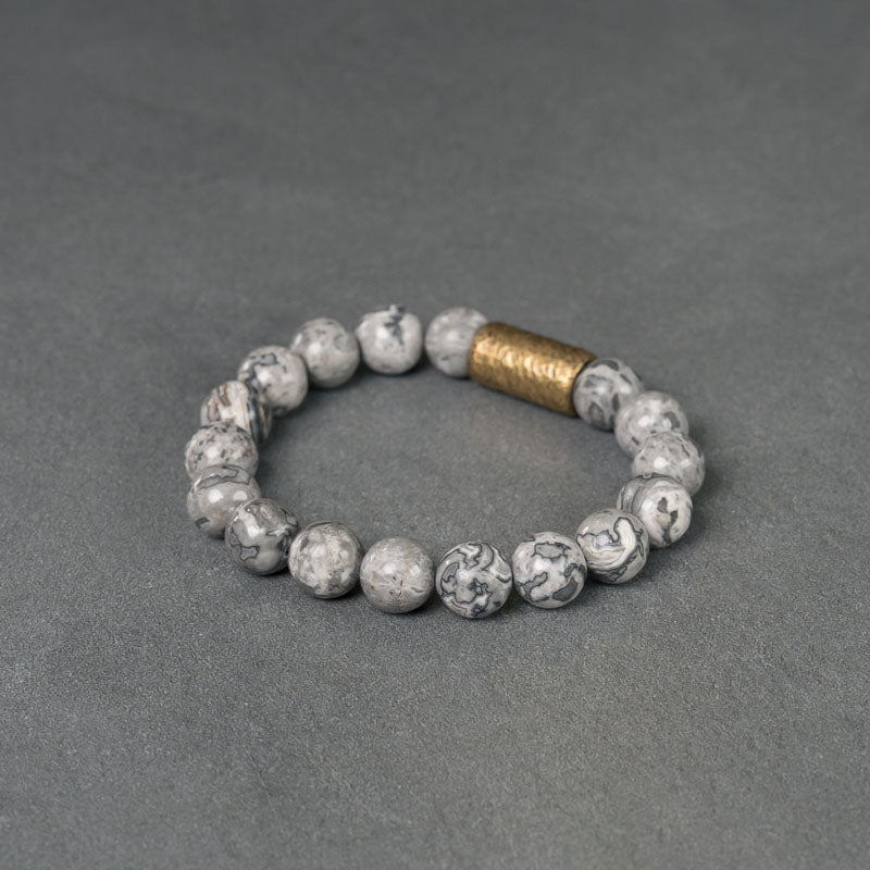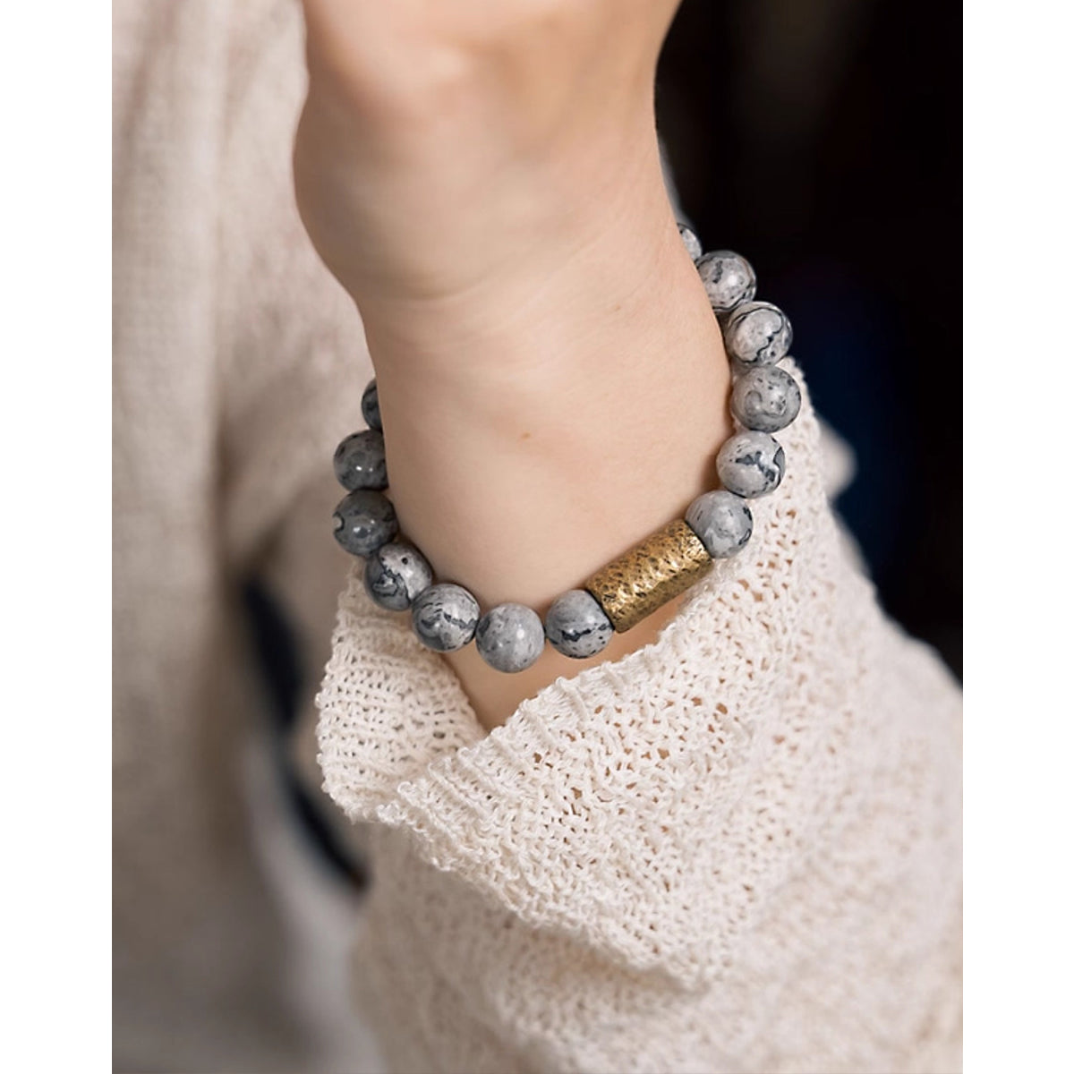 심플한 원통형 황동 파츠와 10mm의 작고 세련된 그레이 재스퍼가 부드러운 인상을 줍니다. 미니멀한 구성으로 깔끔한 스타일을 선호하는 분께 적합하며, 차분한 무드가 느껴집니다. 부담 없이 매일 착용하기 좋은 디자인입니다. (흑요석 없음)