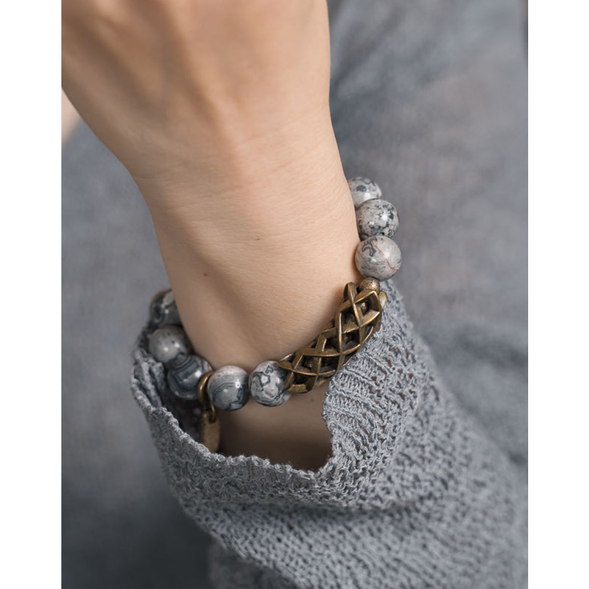 황동 파츠에 정교한 꼬임 패턴을 더해 입체감과 생동감을 살렸습니다. 12mm 크기의 큼직한 그레이 재스퍼 천연석이 강한 존재감을 발휘하며, 에스닉하면서도 힘 있는 분위기를 완성합니다. 꼬임 장식이 다른 소재와 대비되어 독특한 포인트가 됩니다.