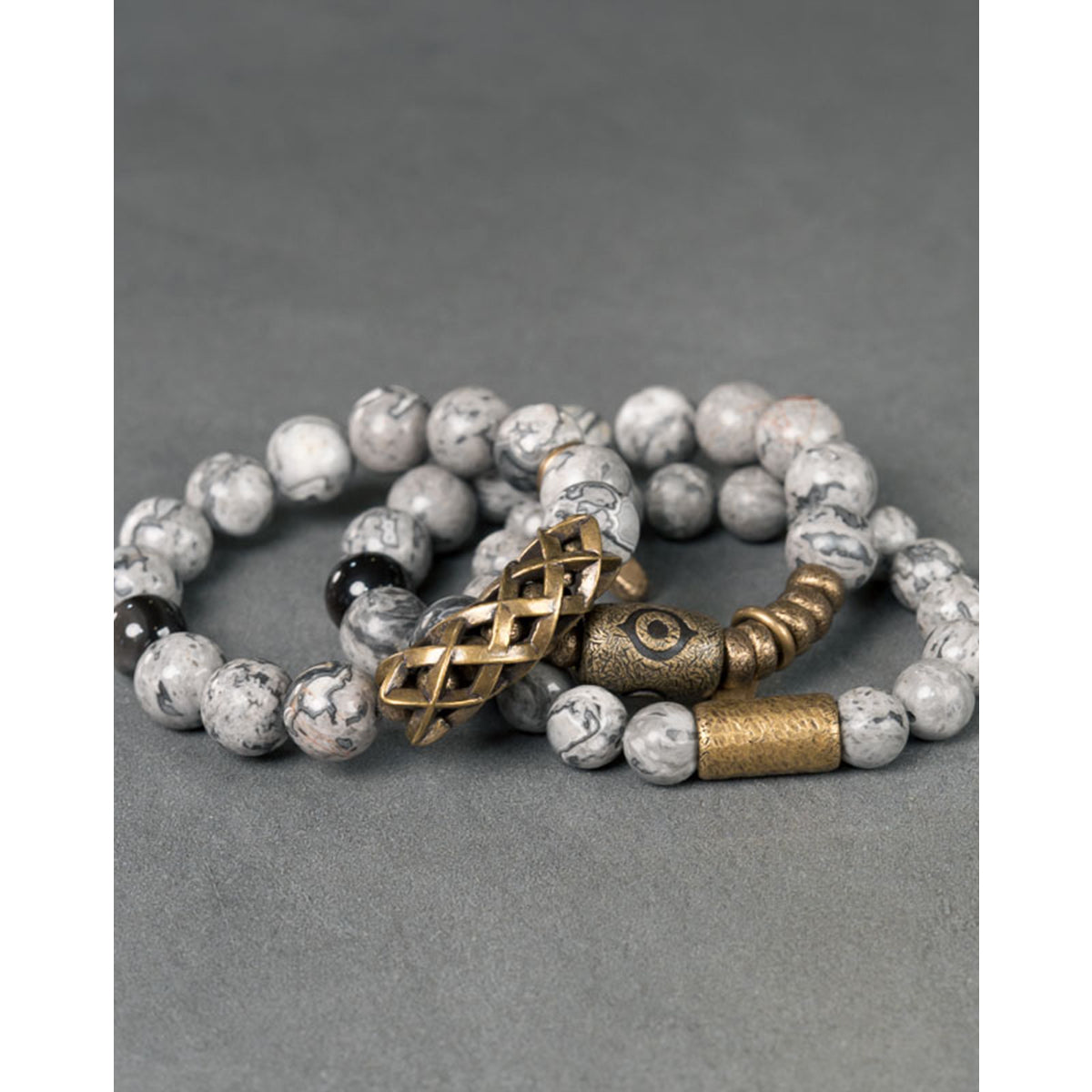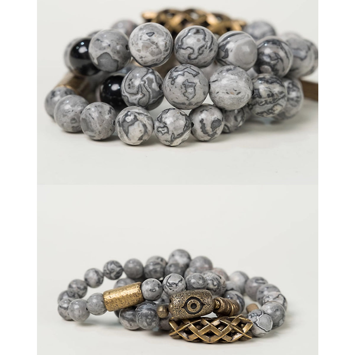 황동 파츠와 흑요석, 그레이 재스퍼(Grey Jasper) 조합의 3가지 천연석 팔찌으로, 눈에 띄는 A, 개성 있는 B, 자연스러운 C로 각각 다른 매력을 선사합니다.
