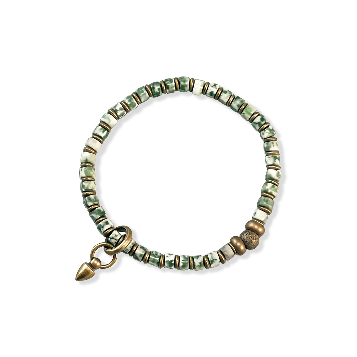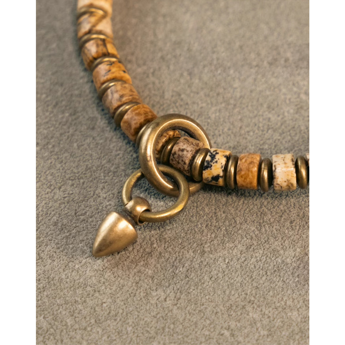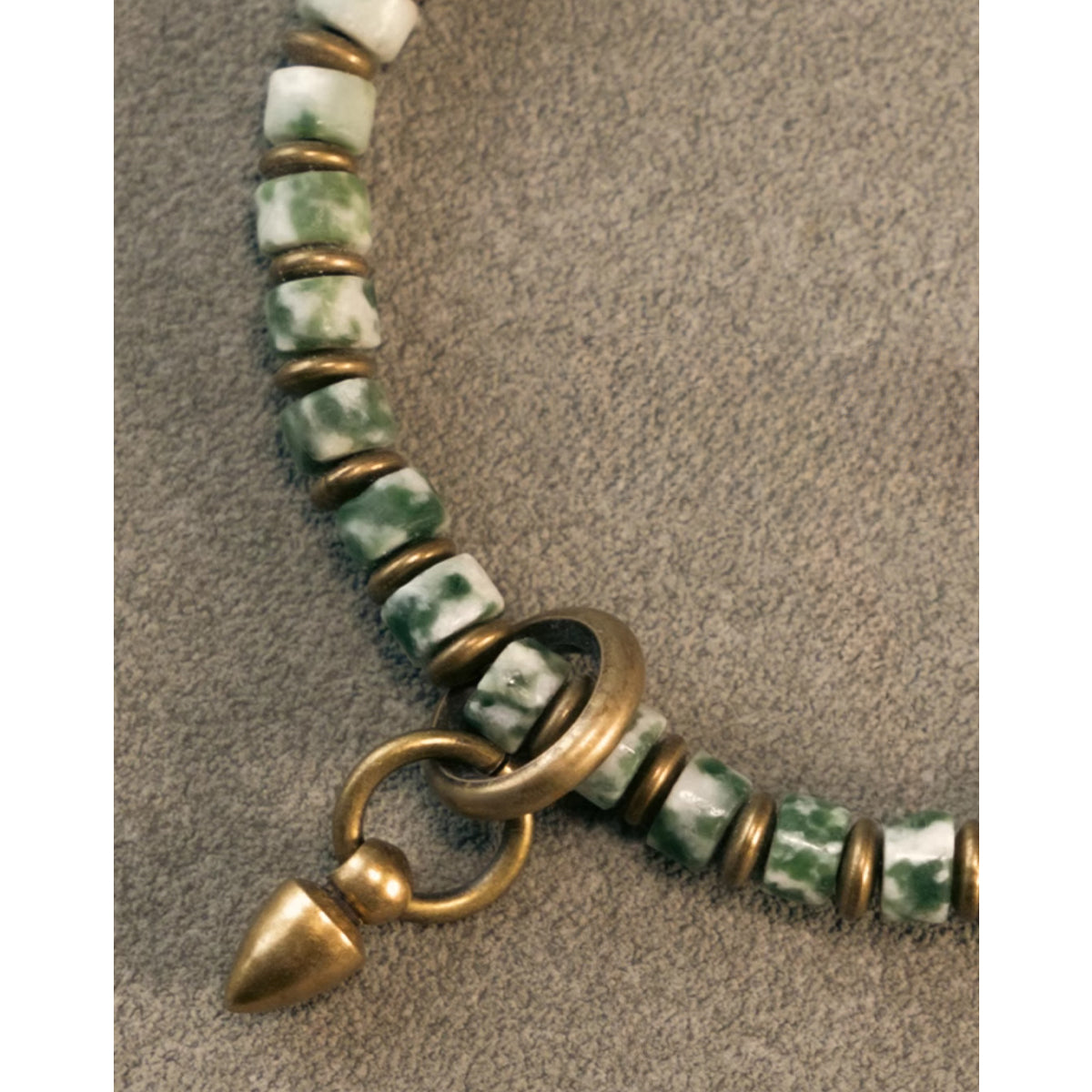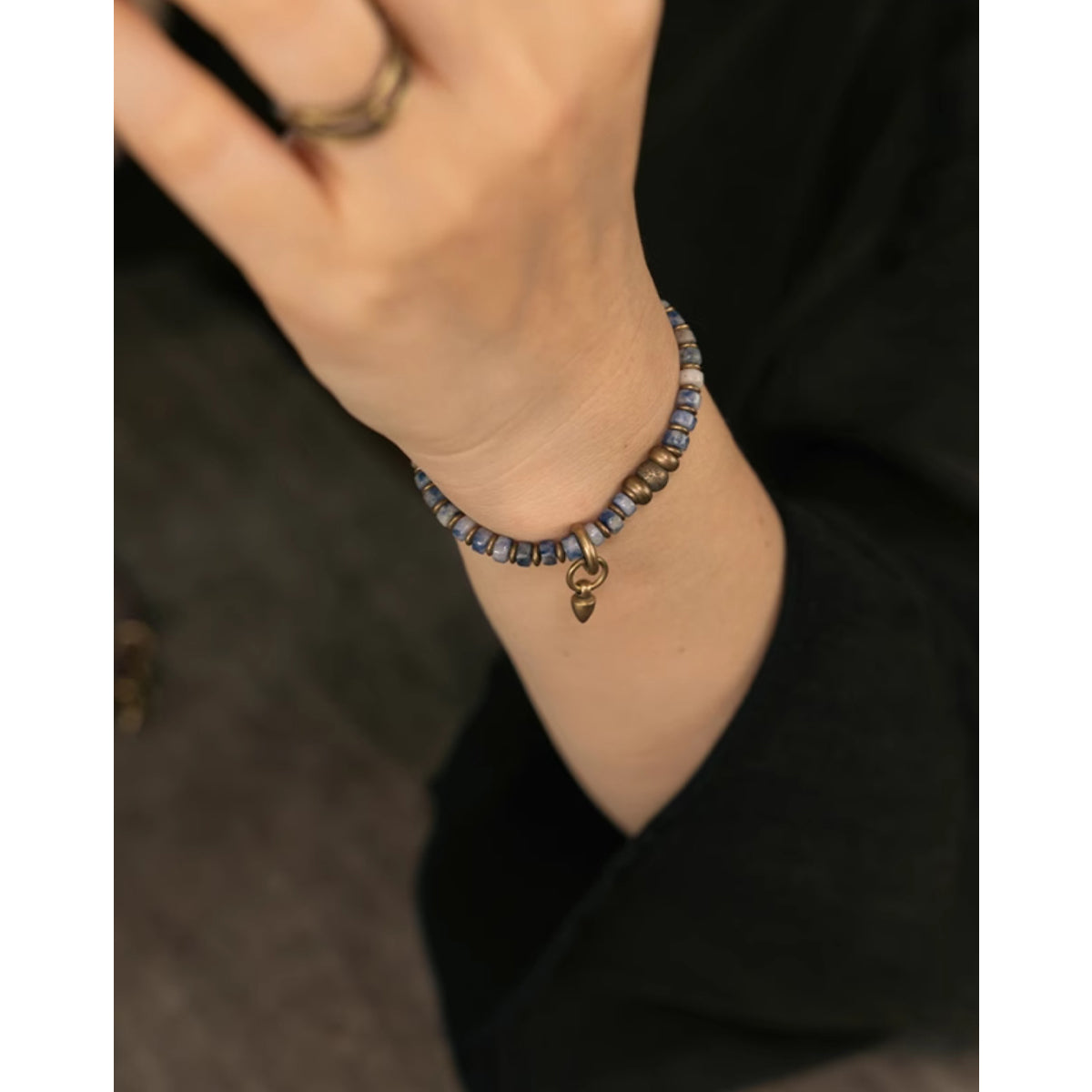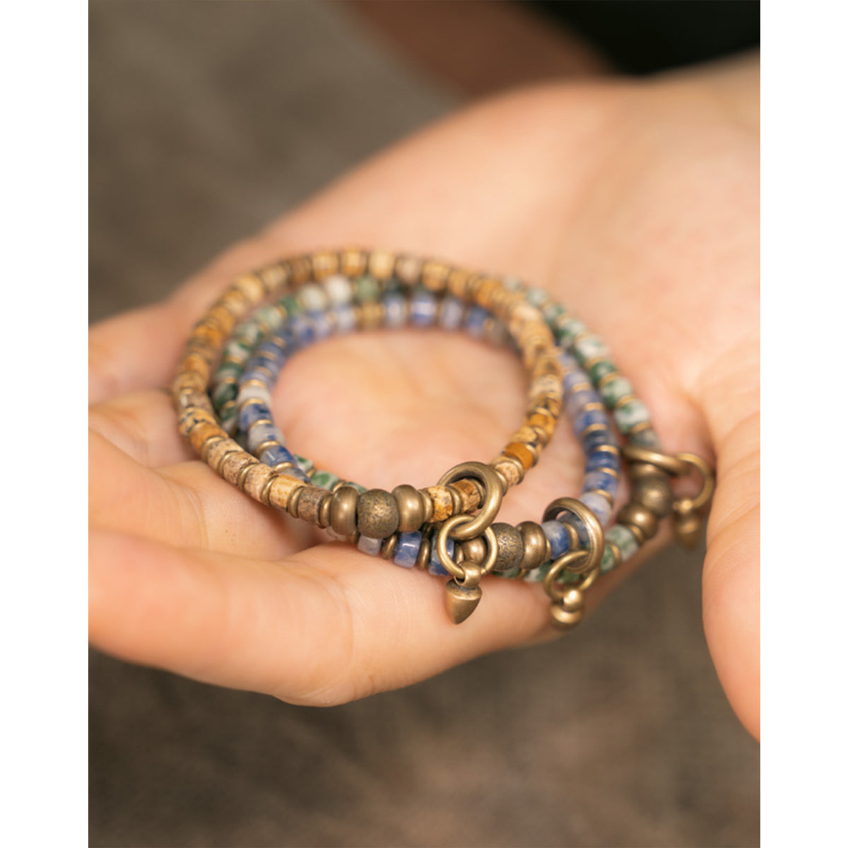깊이 있는 무늬가 매력적인 ‘블루 스팟 스톤’, 강렬한 빛을 발하는 ‘피터사이트’, 독특한 반점 패턴이 인상적인 ‘그린 스팟 스톤’ 서로 다른 개성을 지닌 천연석을 사용했습니다. 스톤 사이에는 황동 스페이서 비즈를, 포인트로는 황동 펜던트를 더해 리듬감과 깊이를 살렸습니다.