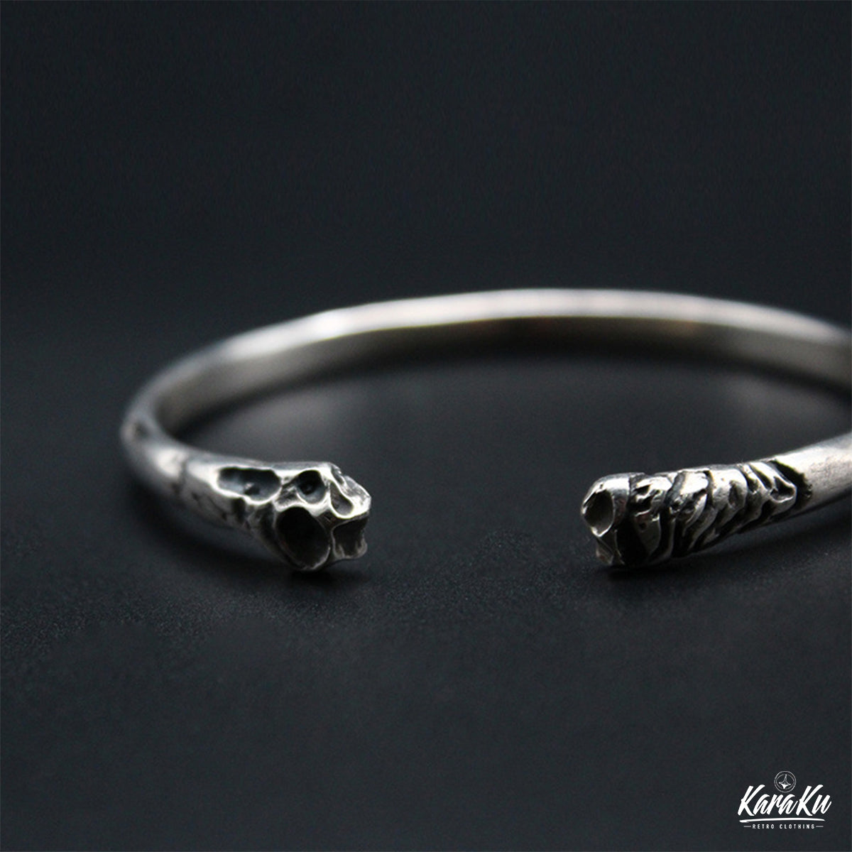 925 실버로 제작된 리브 케이지 디자인의 오픈 뱅글로, 세련되고 조절 가능한 액세서리입니다.