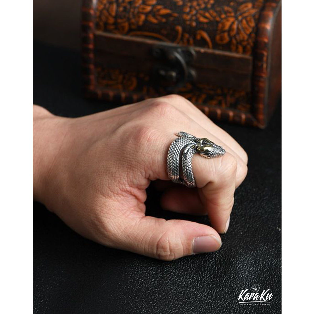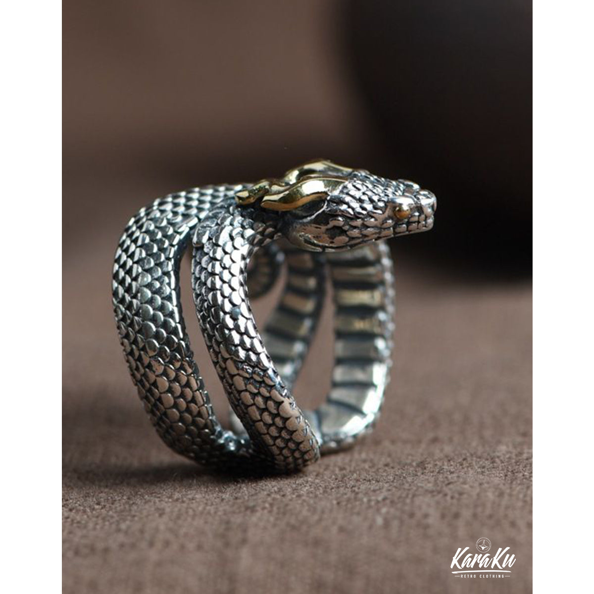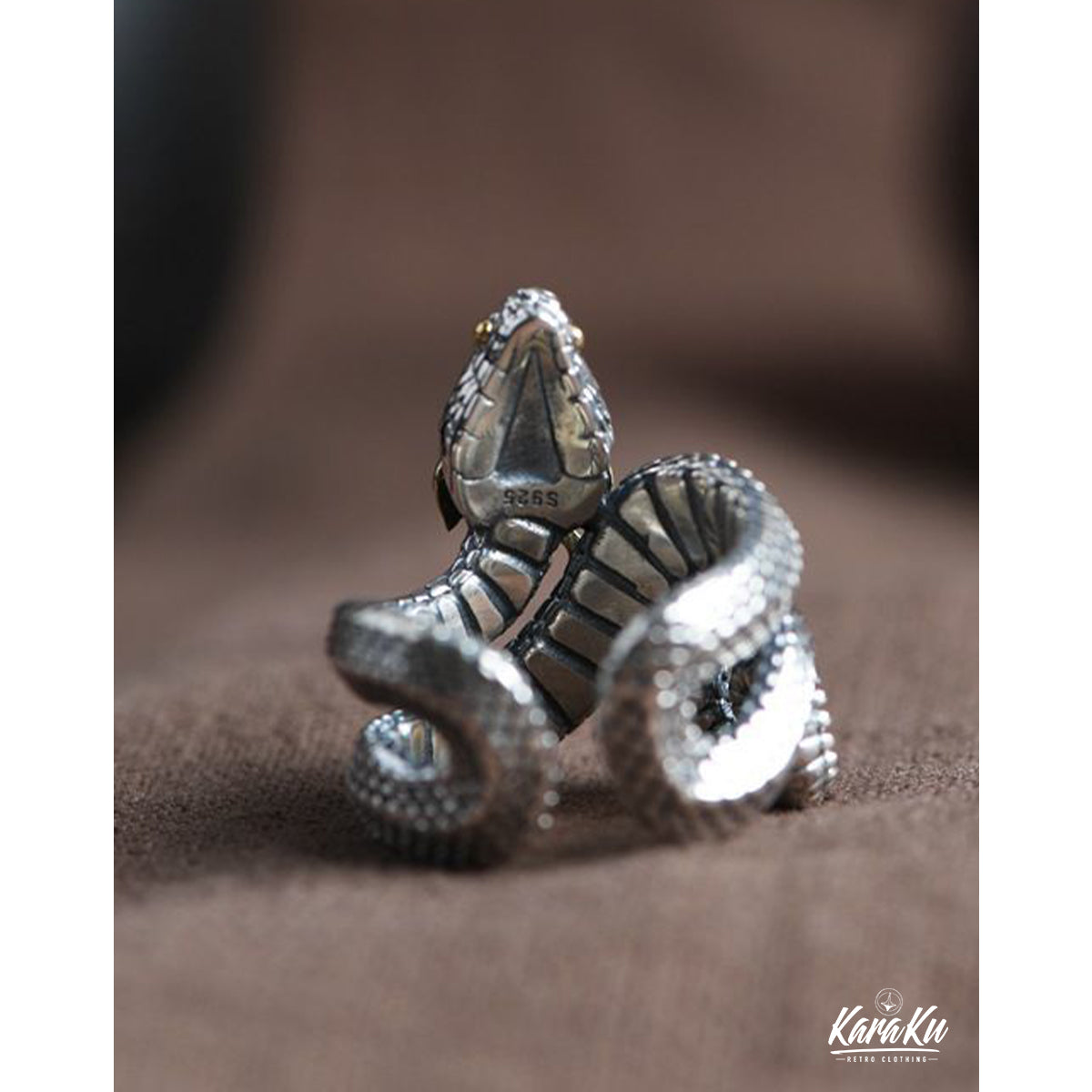 고급스럽고 강한 존재감을 주며, 표면에는 텍스처 가공이 되어 뱀의 비늘 질감을 사실감 있게 표현합니다. 매트한 질감과 광택 있는 부분이 조화를 이루어 깊이 있는 디자인을 완성합니다.