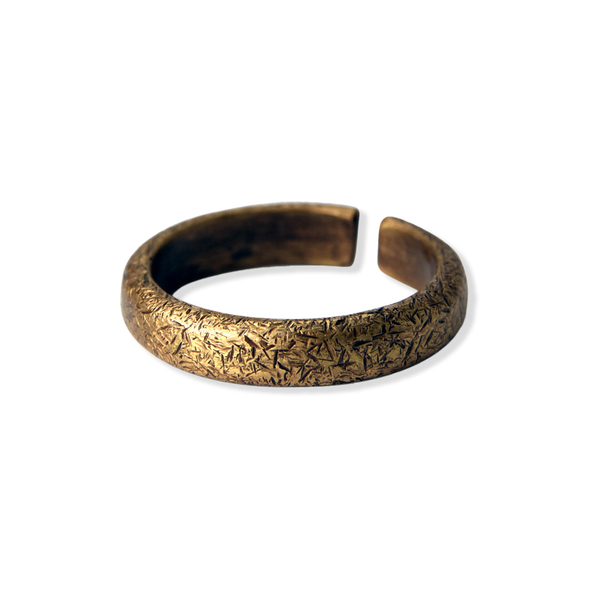 황동 소재 오픈 링으로, 불규칙 텍스처와 따뜻한 골드 톤이 돋보이는 유니섹스 디자인입니다.