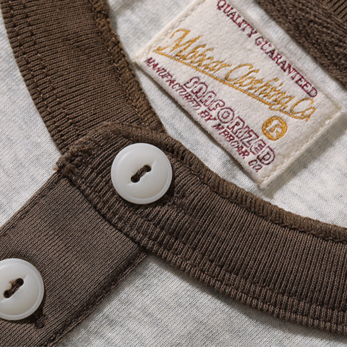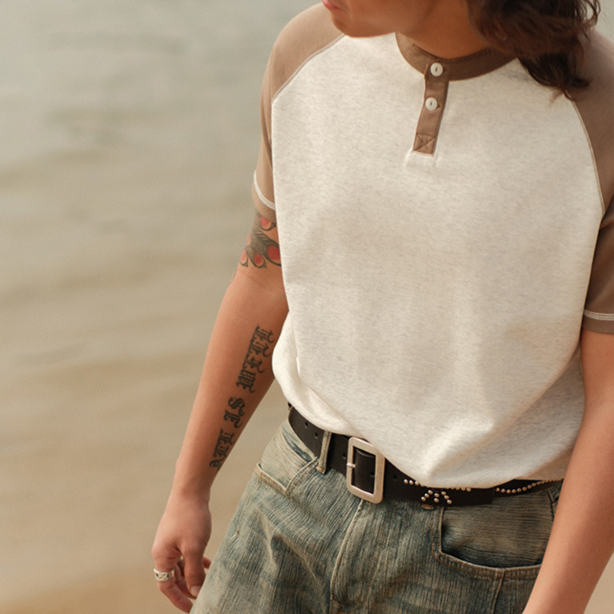 두 개의 버튼이 달린 헨리넥 스타일로 캐주얼하면서도 단정한 인상을 주며, 버튼이 시각적 포인트 역할을 합니다.