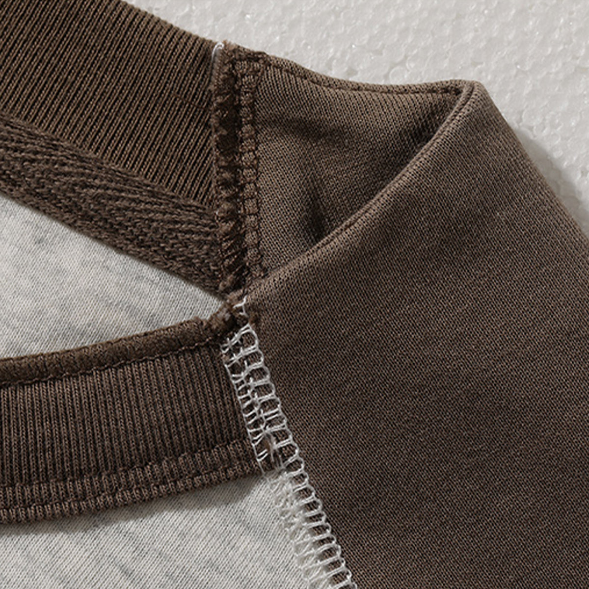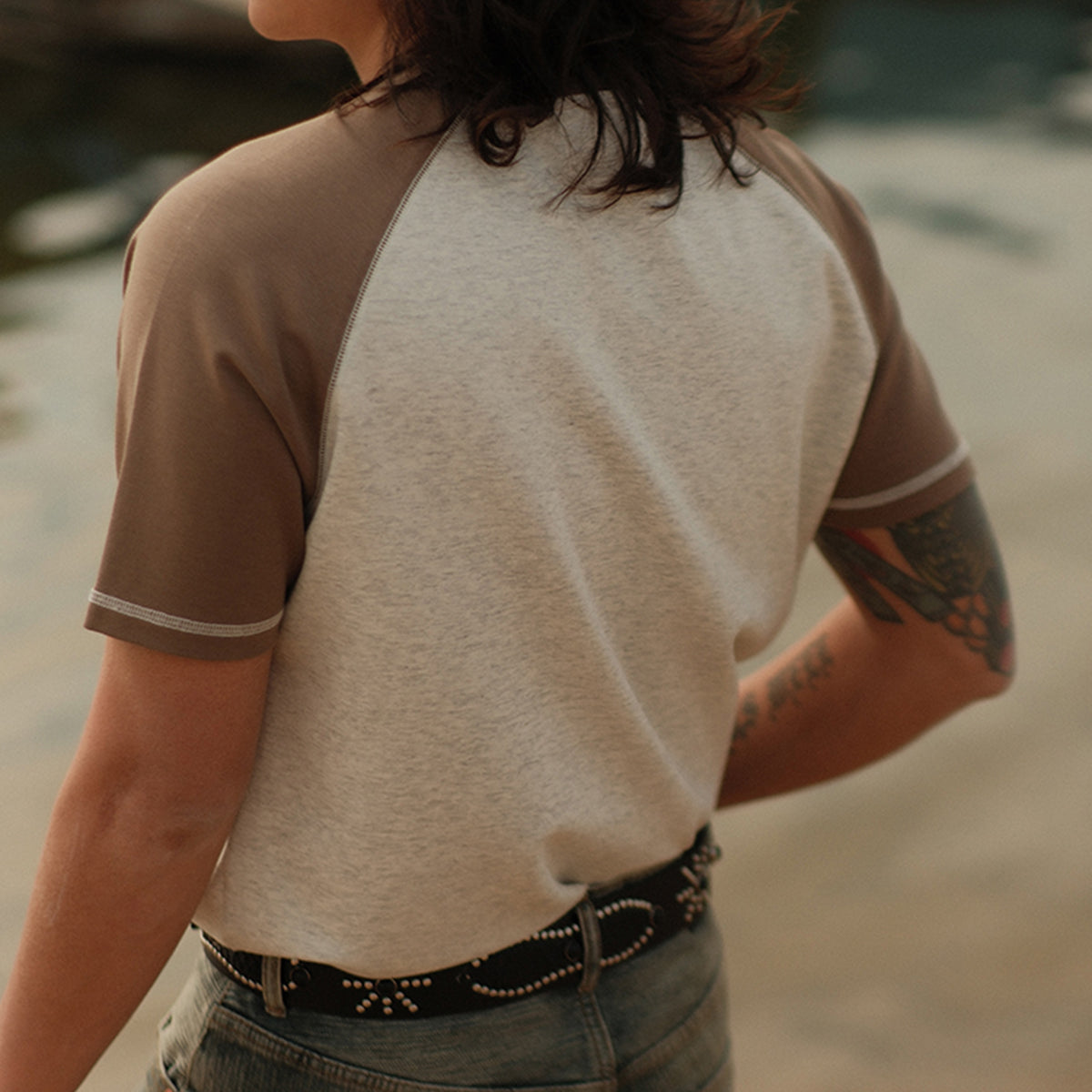 소매와 몸통의 컬러를 다르게 구성해 콘트라스트를 살렸으며, 어깨 솔기 없이 제작되어 스포티하고 활동적인 느낌을 줍니다.