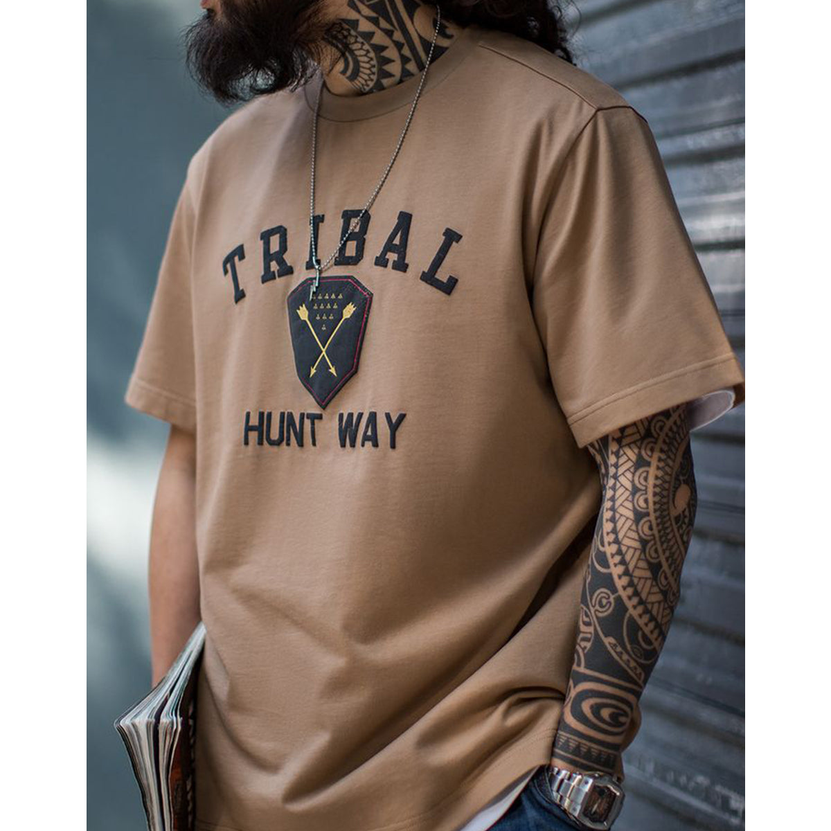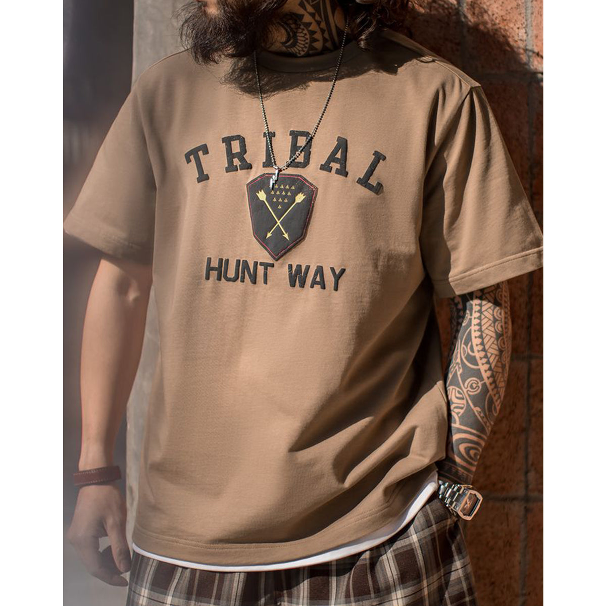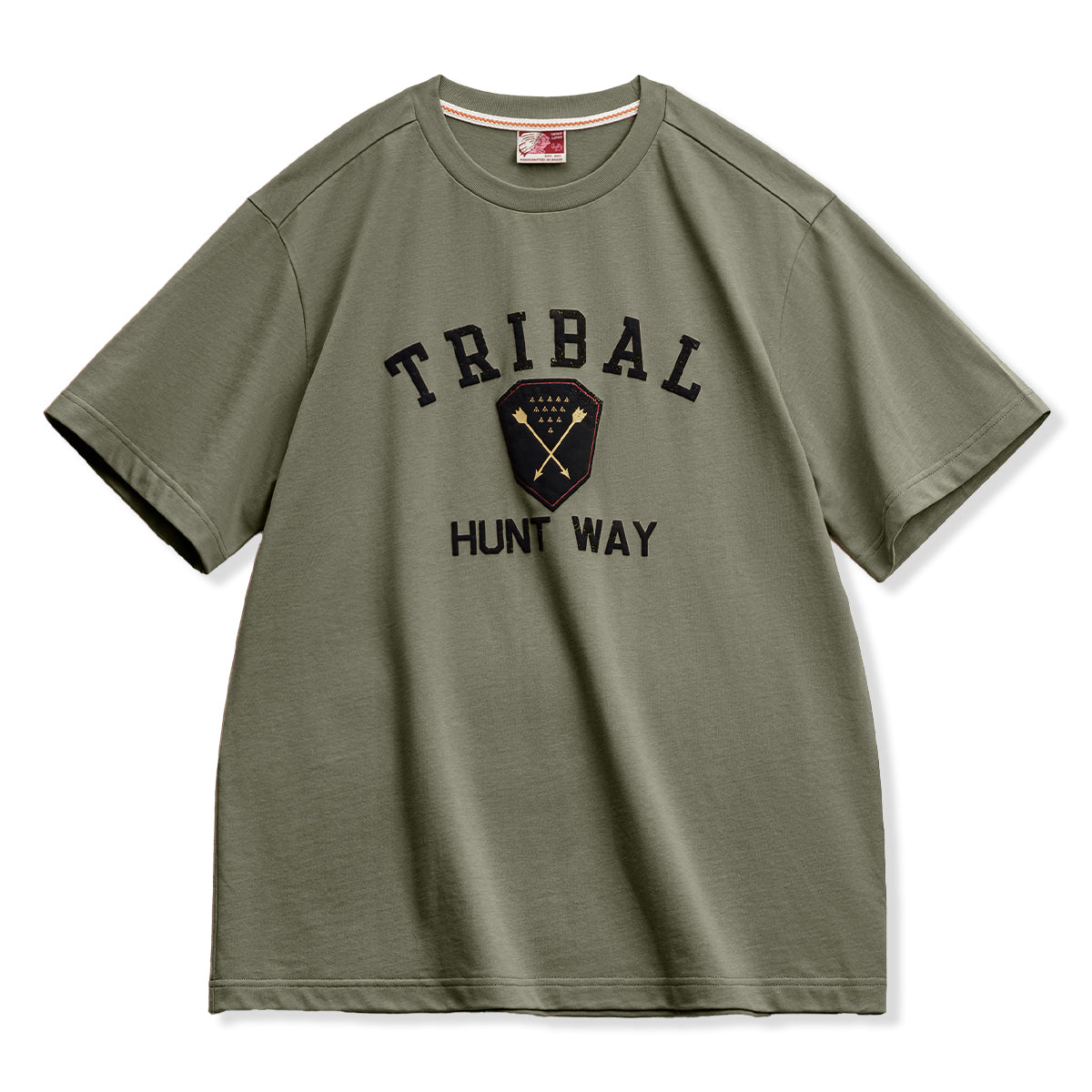 사냥 문화를 모티브로 한 입체 프린트 티셔츠로, 내추럴한 컬러감이 아웃도어 코디에 잘 어울립니다.