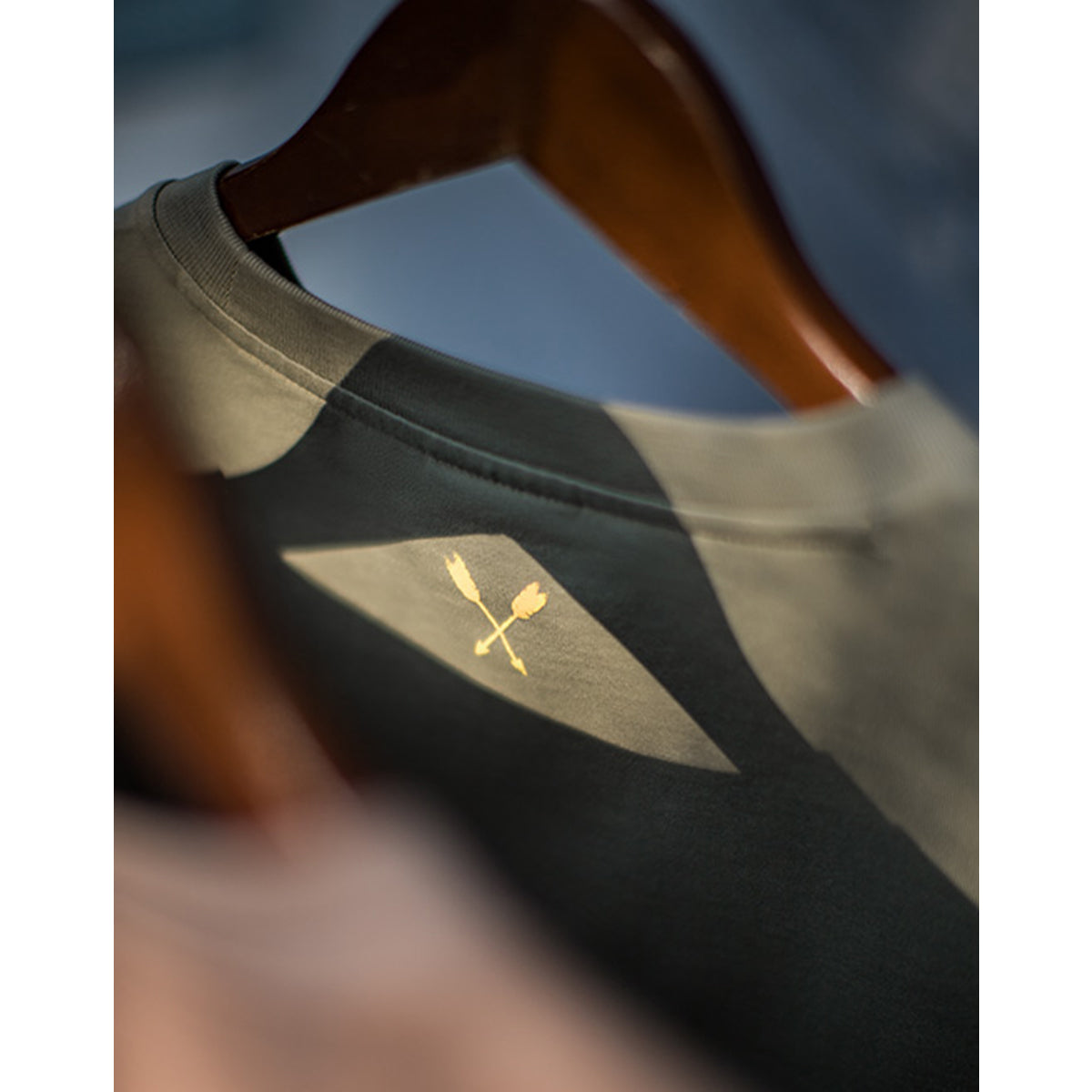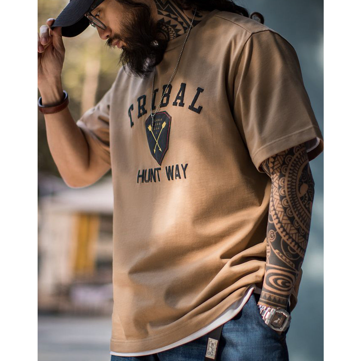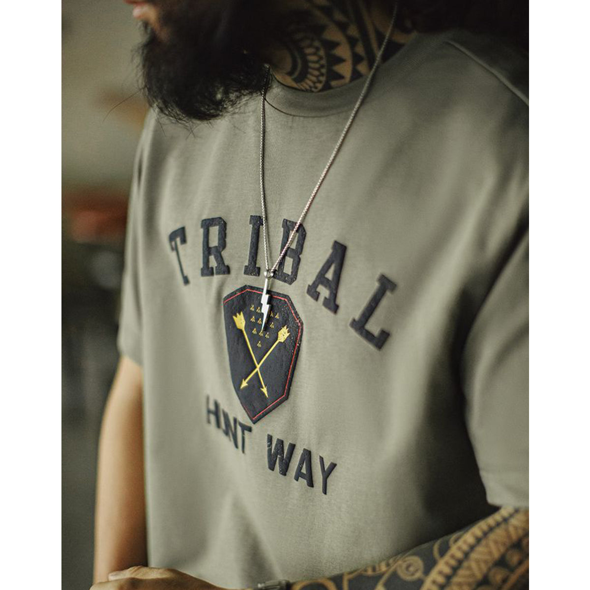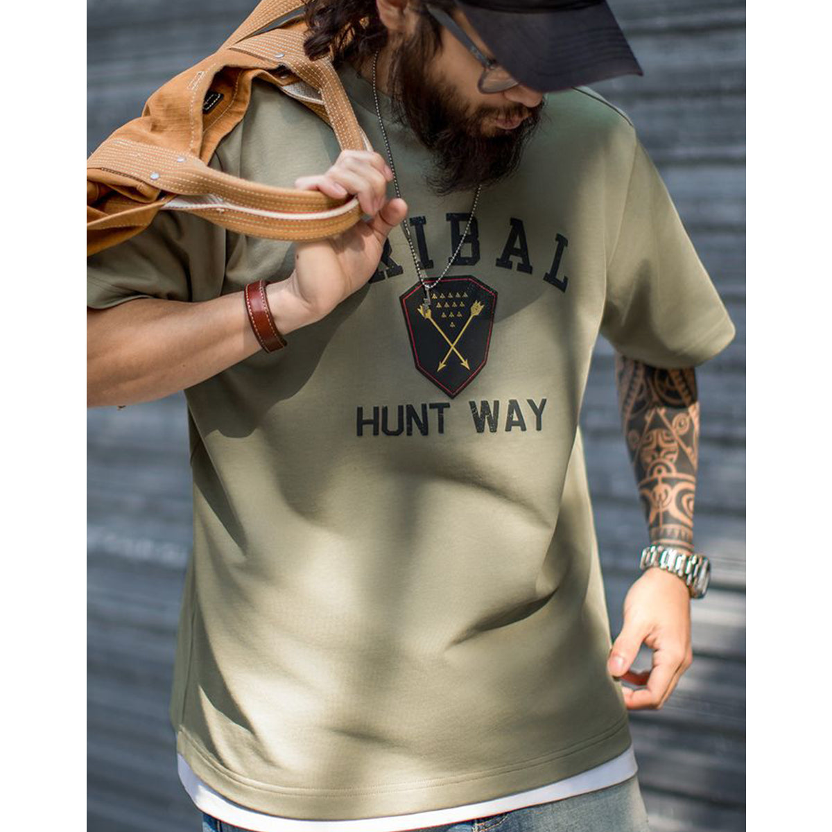 사냥 문화를 모티브로 한 입체 프린트 티셔츠로, 내추럴한 컬러감이 아웃도어 코디에 잘 어울립니다.