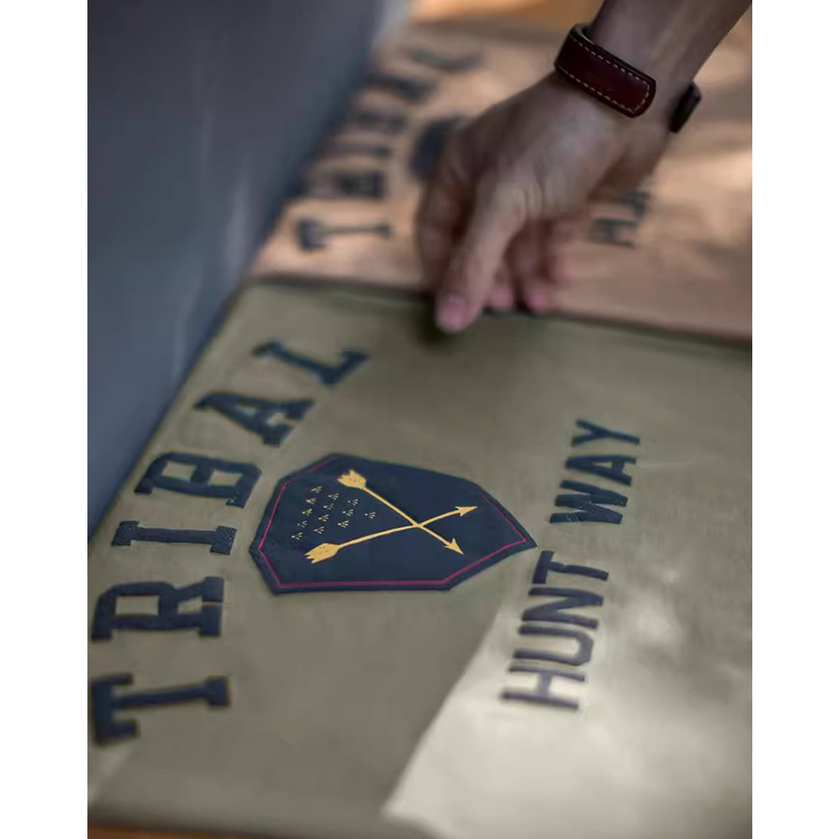 '트리볼 헌트 웨이' 문구와 화살표, 전통 문양이 어우러져 사냥 문화를 모티브로 한 독특한 그래픽이 돋보입니다.