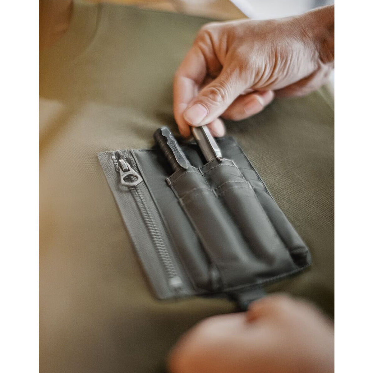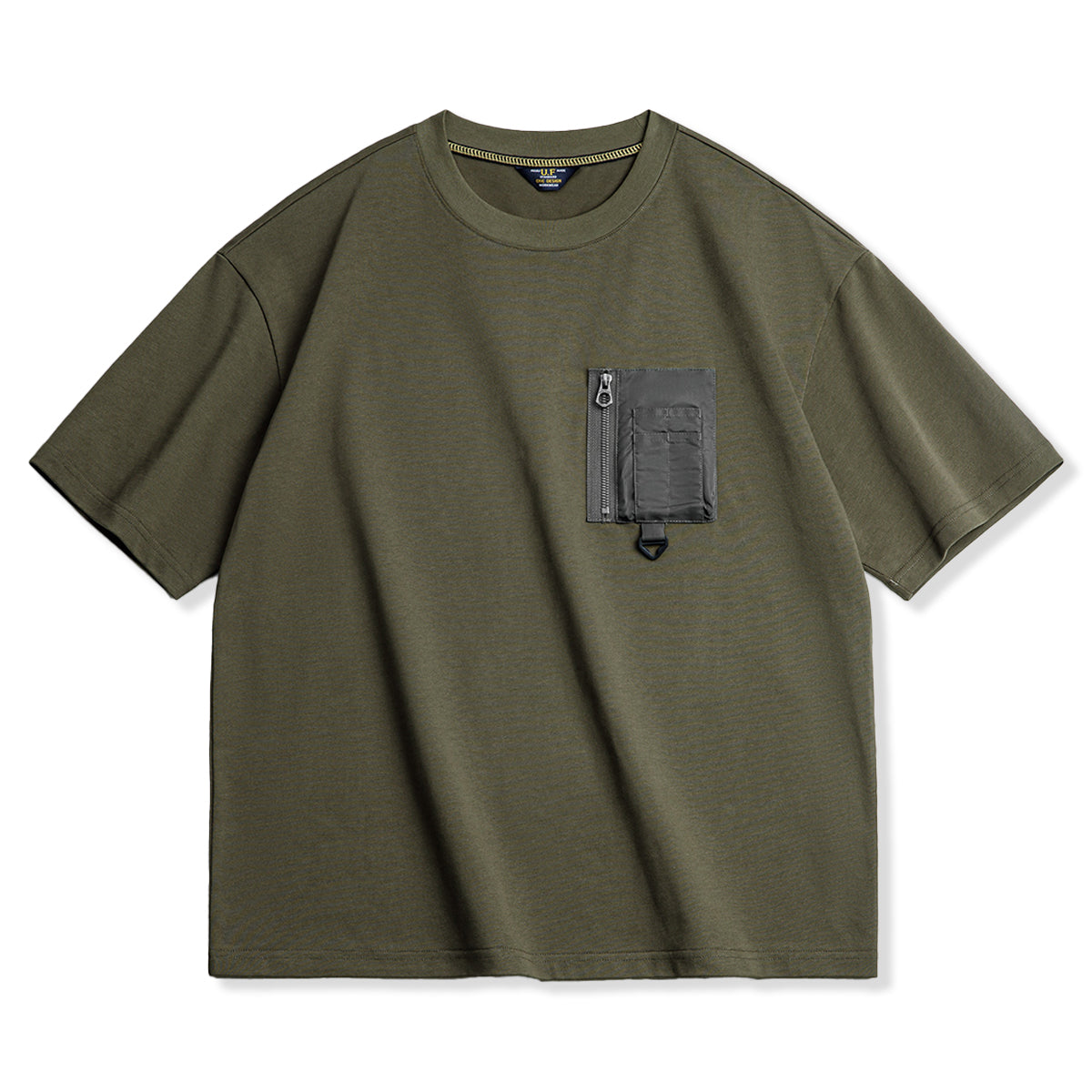 가슴 부분에 배치된 입체 구조의 지퍼 포켓은 밀리터리 웨어를 연상시키는 디자인 요소로 시각적인 포인트가 되며, 펜홀더와 D 캔 설치용 루프가 포함되어 있어 실용성을 더했습니다.
