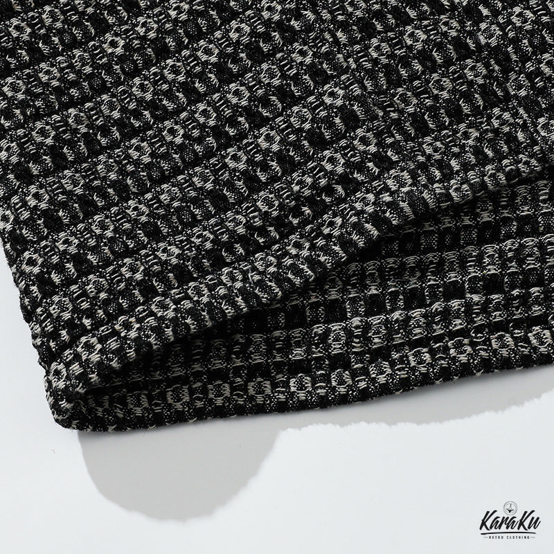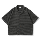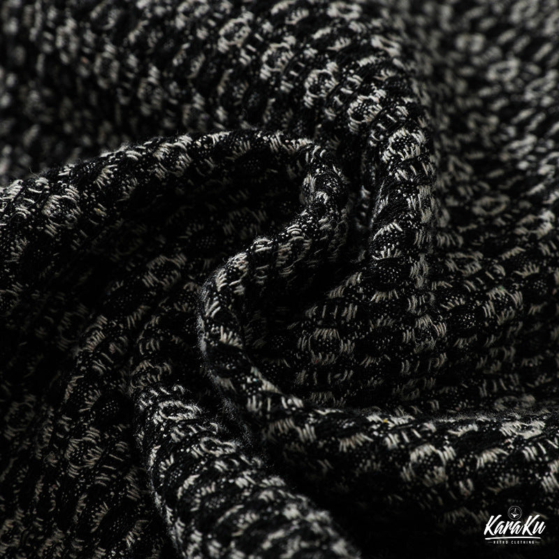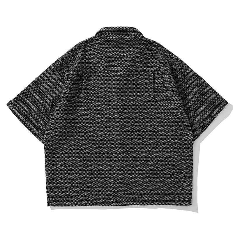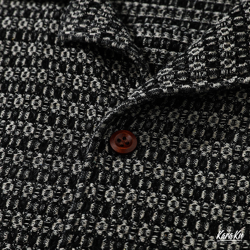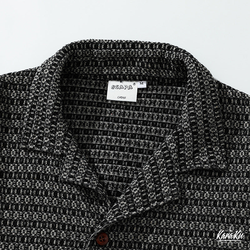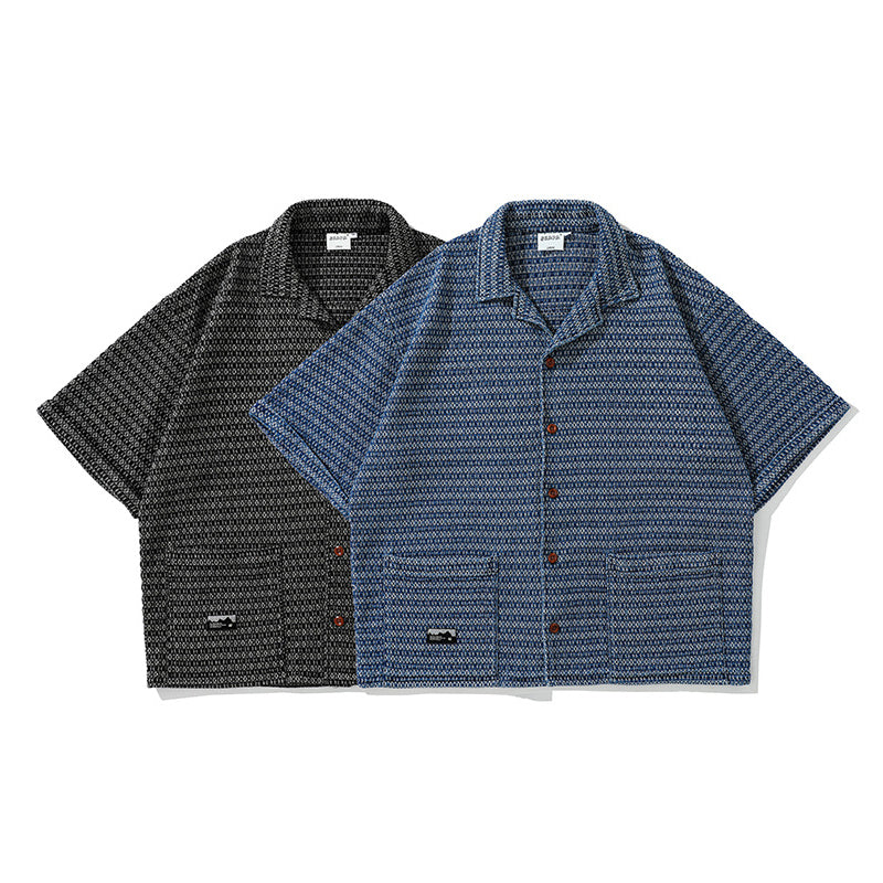 민족풍 무늬와 빈티지한 텍스처가 돋보이는 고급스러운 오픈카라 셔츠입니다.