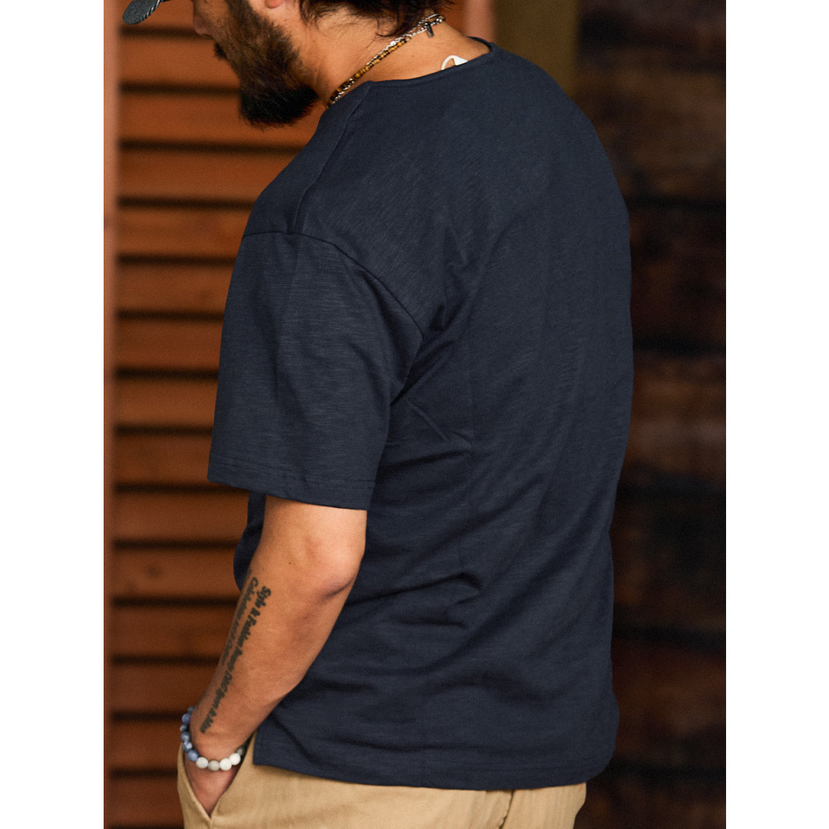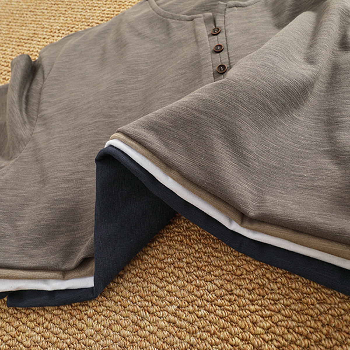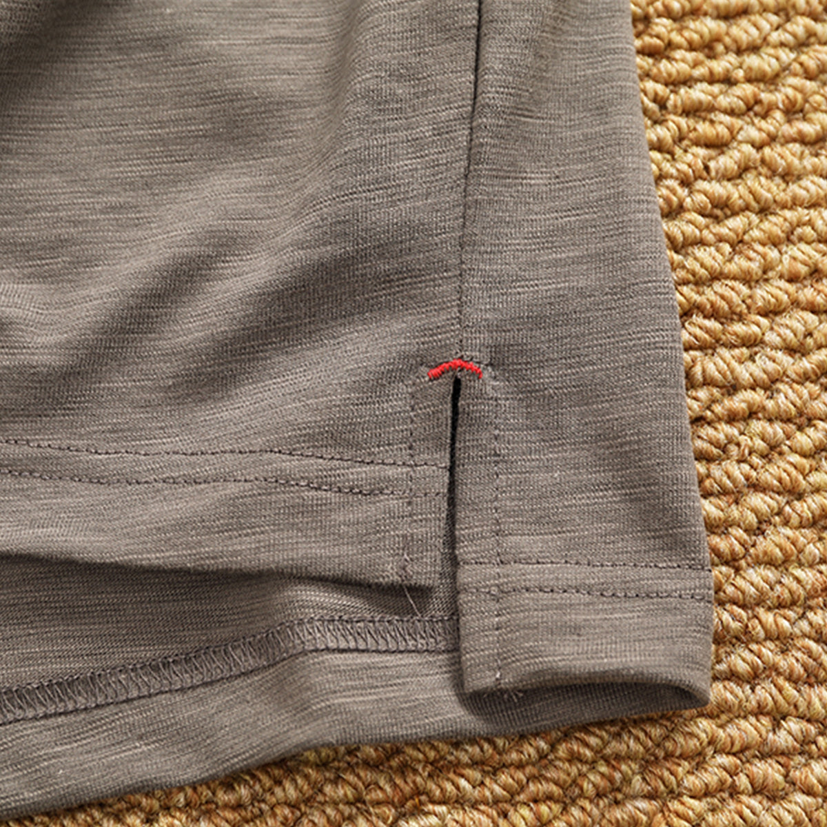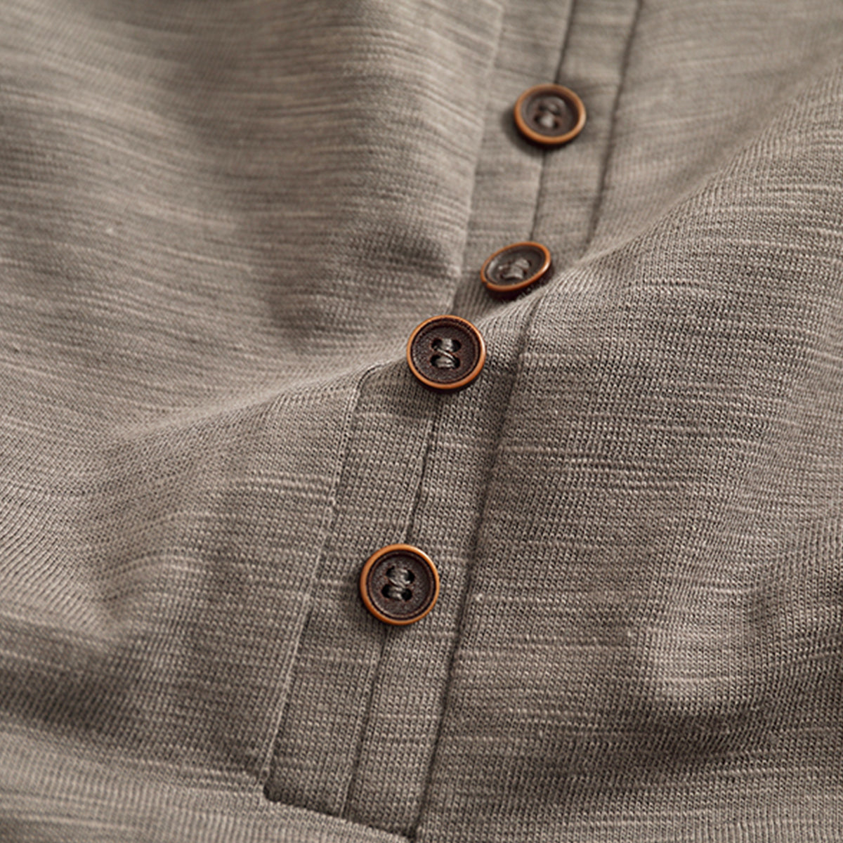 빈티지한 감성과 현대적인 스타일이 조화를 이루는 고급스러운 헨리넥 티셔츠입니다.