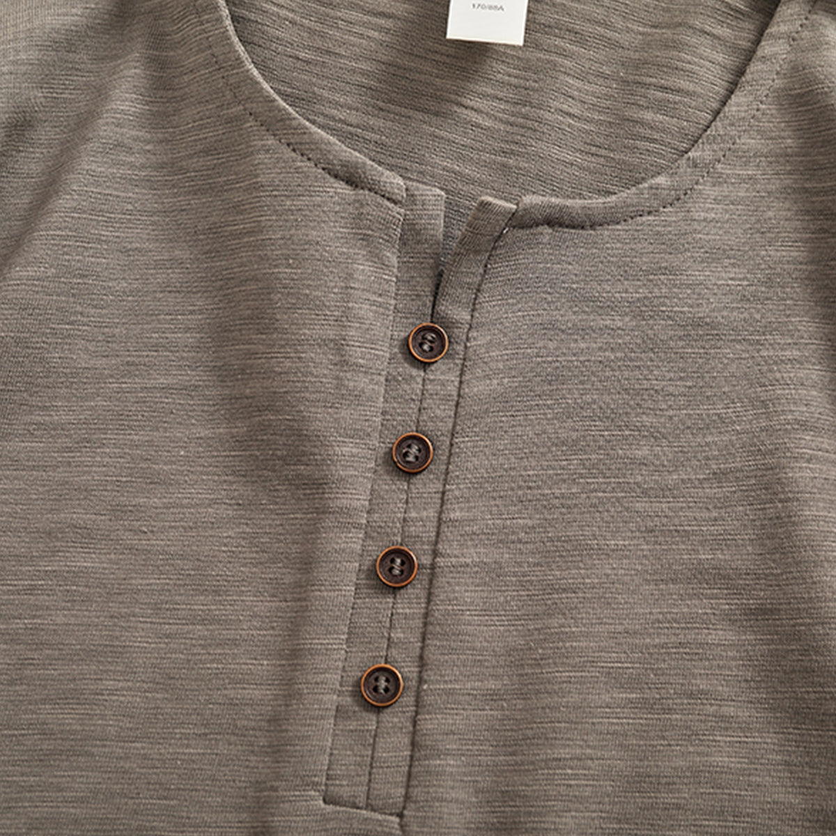 단추 4개의 헨리넥은 개방감 있고 편안한 착용감을 제공하며, 캐주얼하면서도 고급스러움을 더해줍니다.