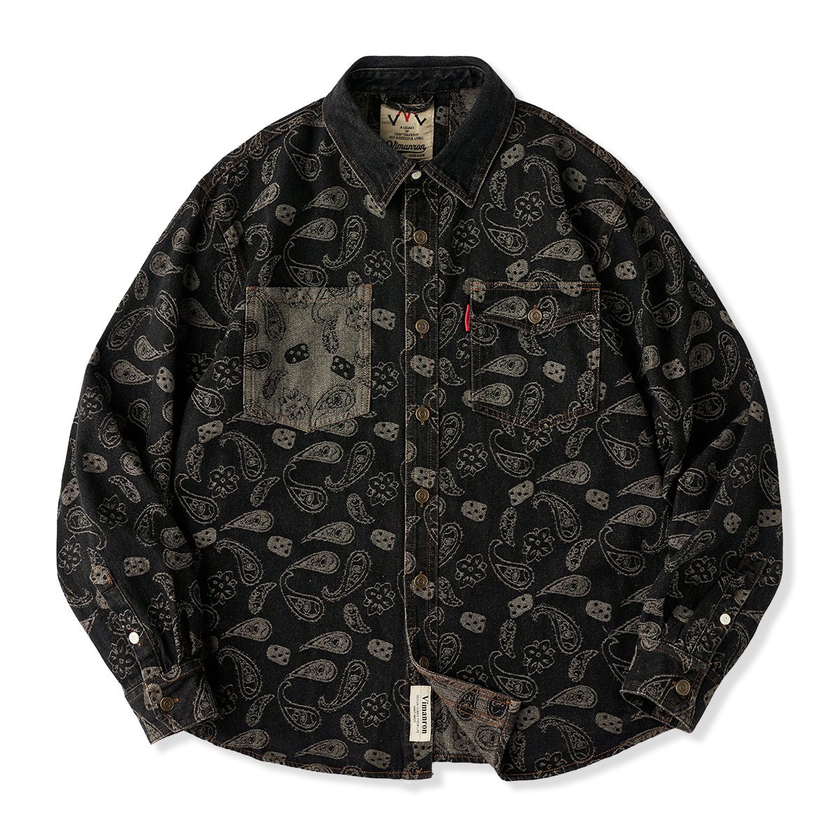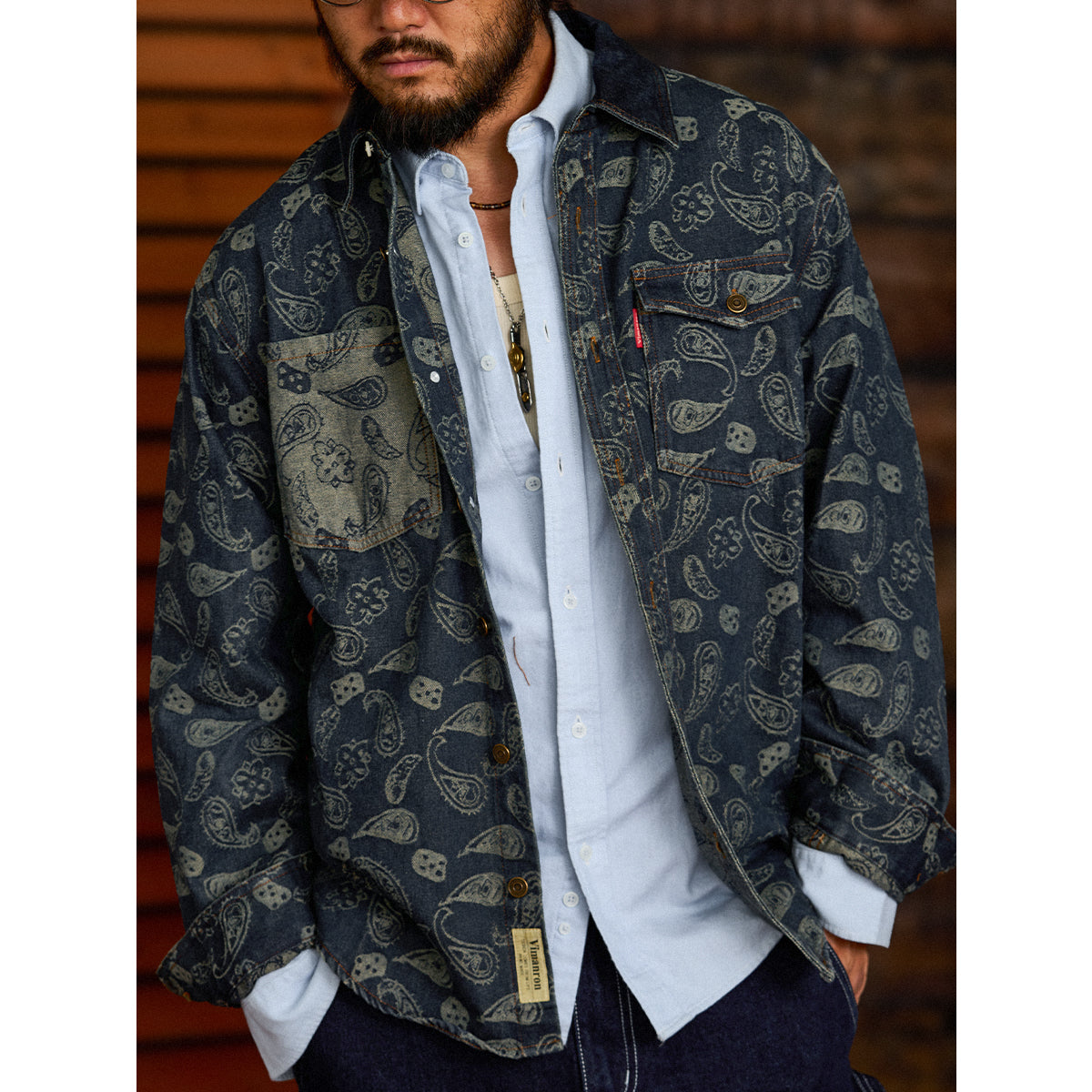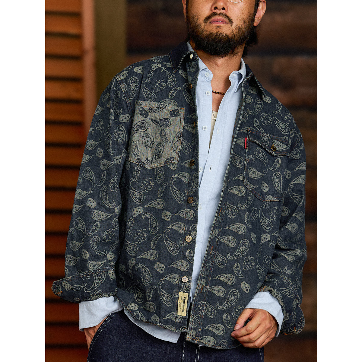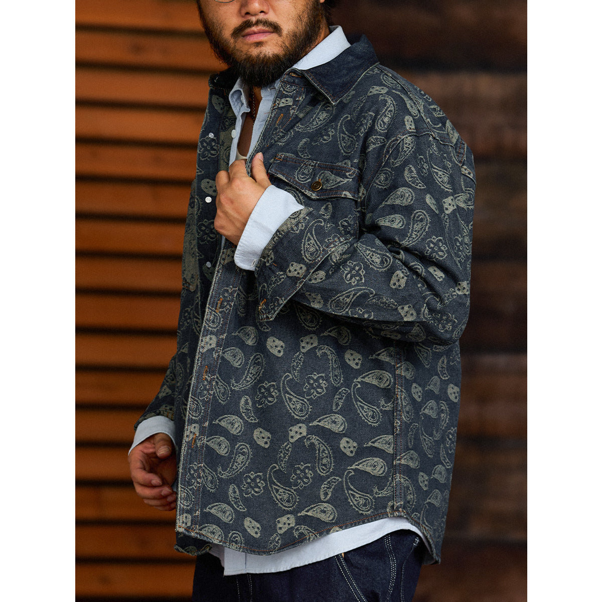 자카드 페이즐리와 헤비웨이트 데님이 조화를 이룬 감각적인 오버 셔츠입니다.