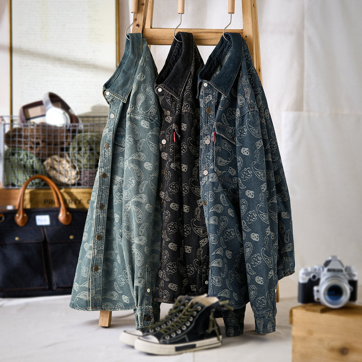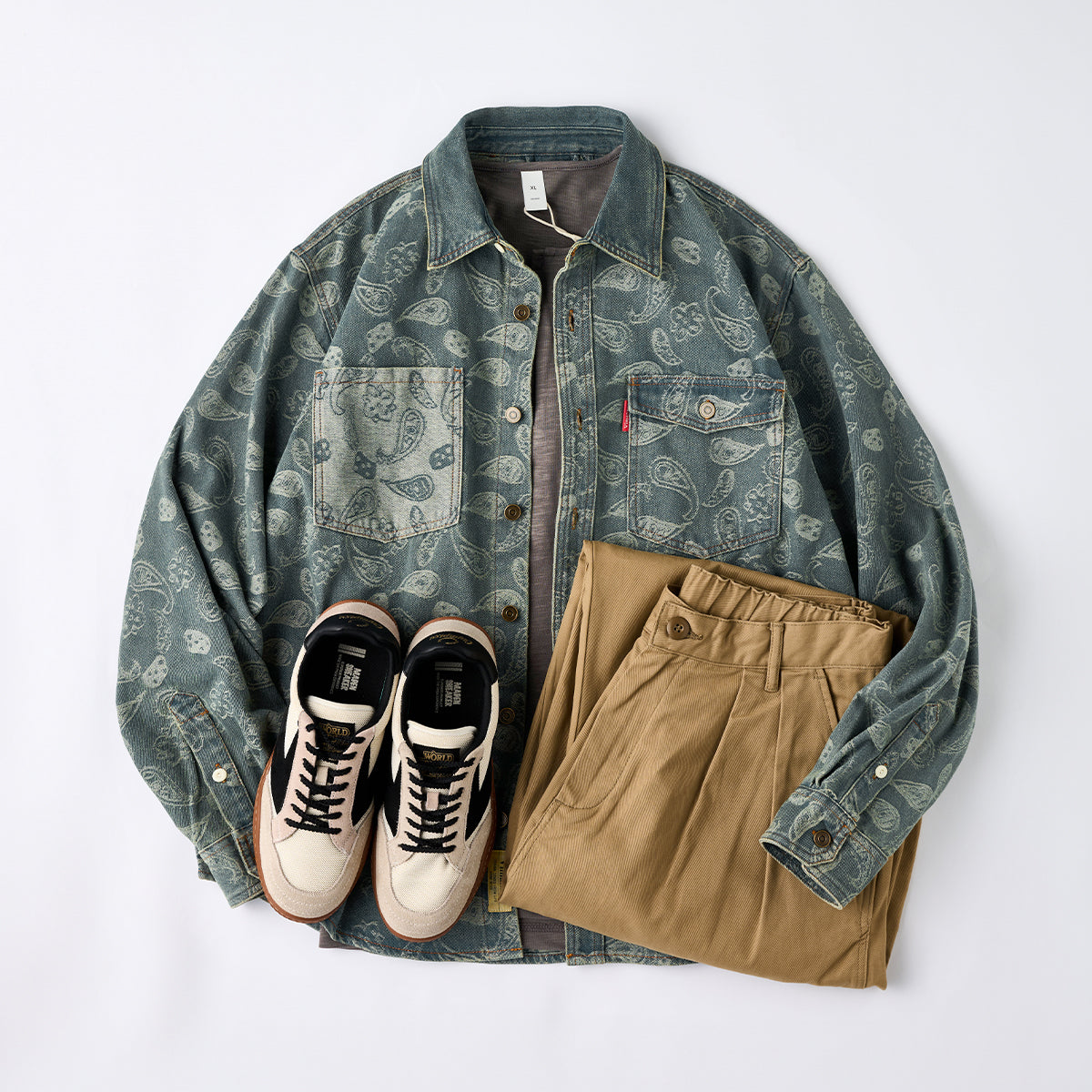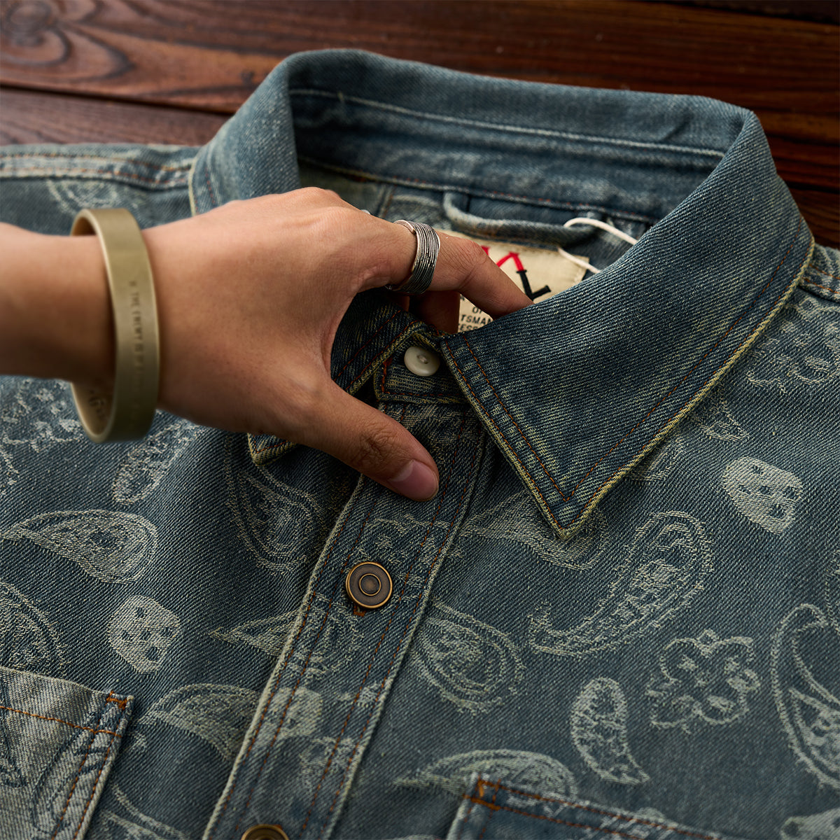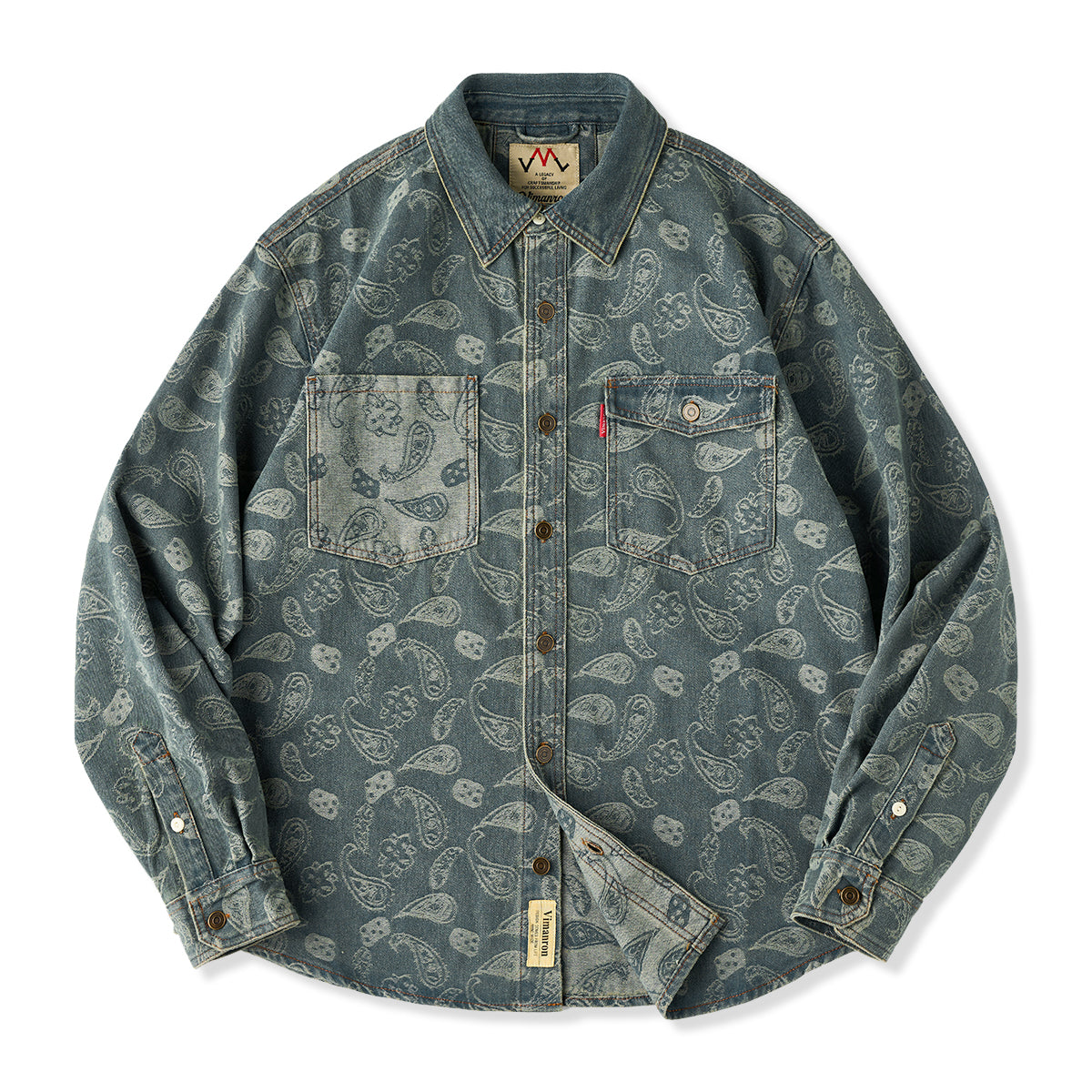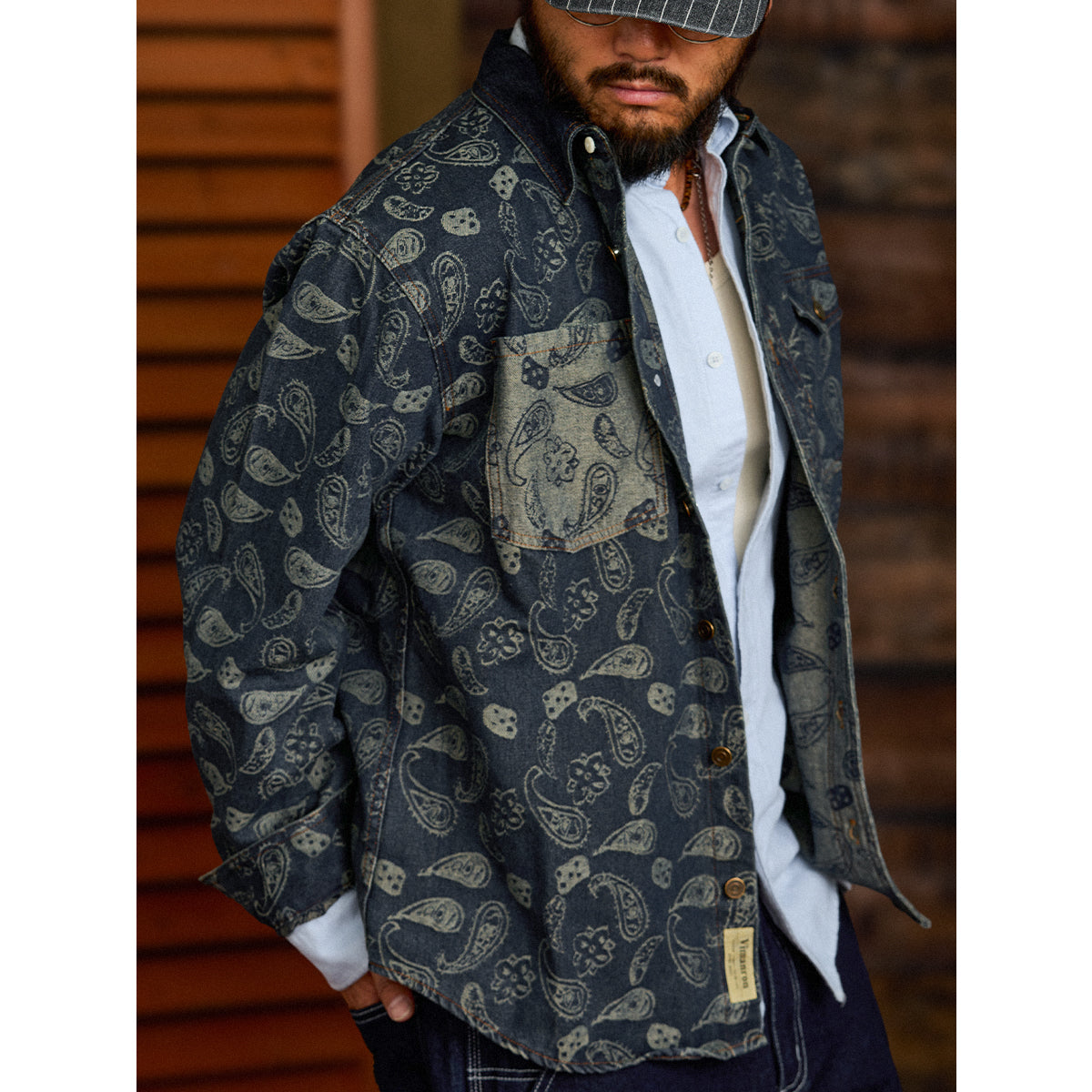 자카드 페이즐리와 헤비웨이트 데님이 조화를 이룬 감각적인 오버 셔츠입니다.