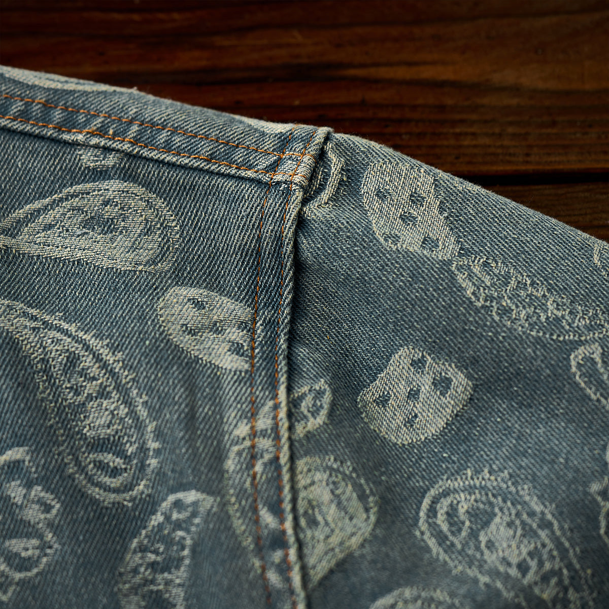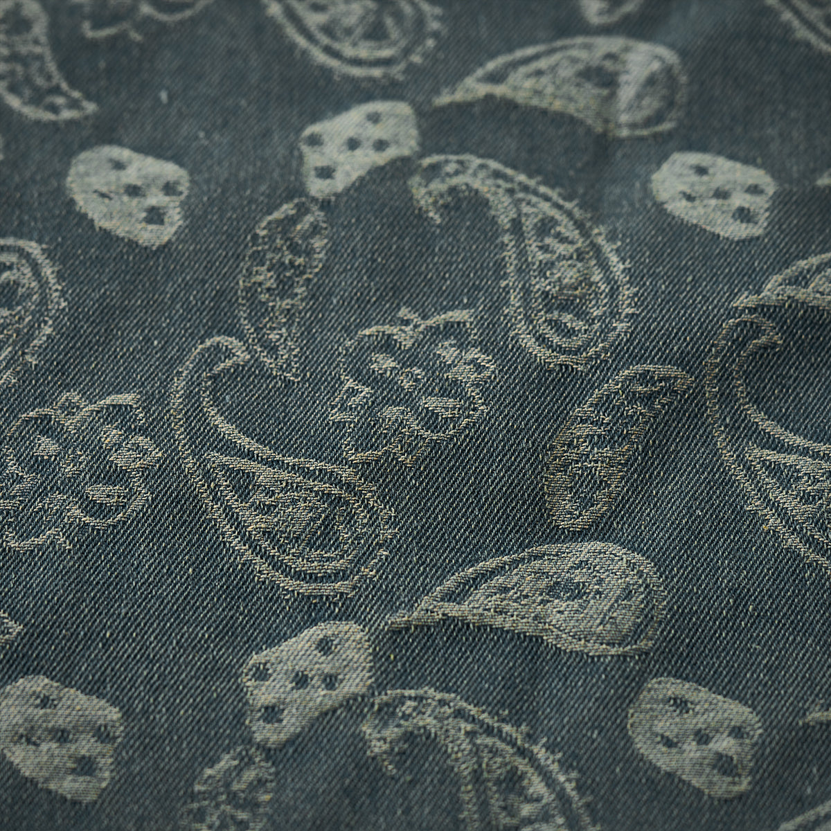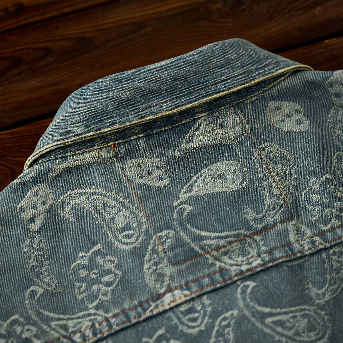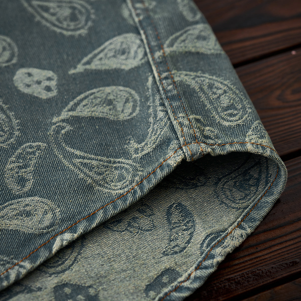 자카드 직조으로 표현한 페이즐리 패턴이 데님의 투박함과 조화를 이루며 감각적인 스타일을 완성합니다.