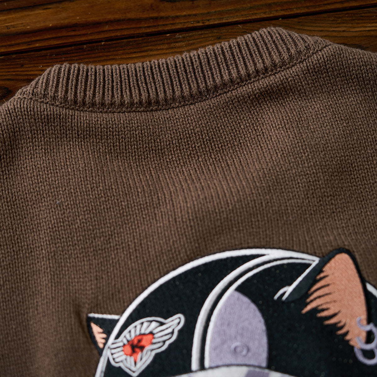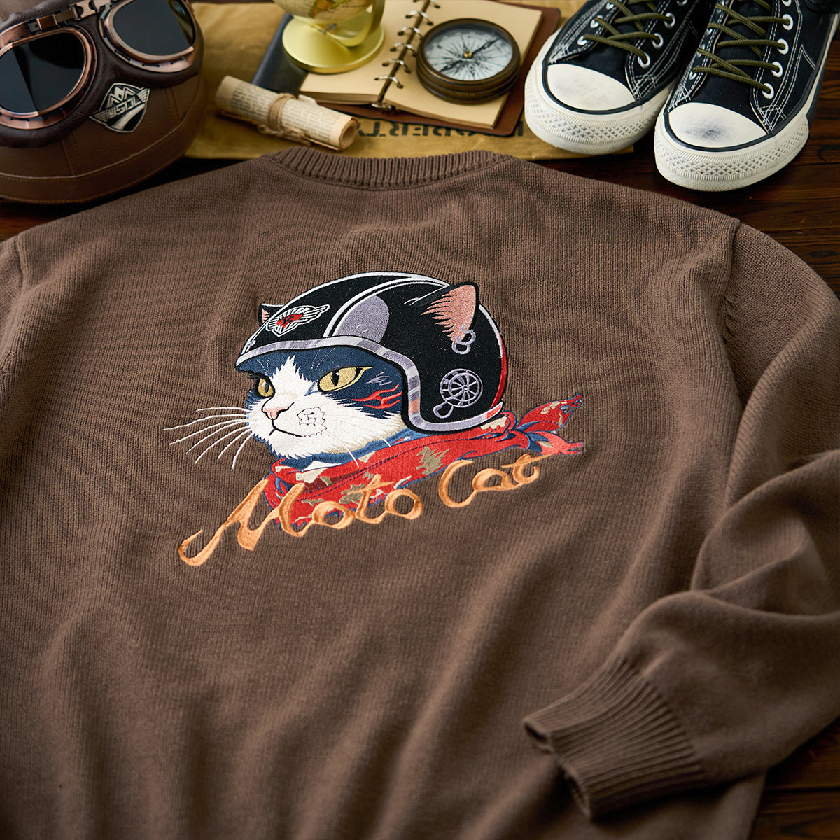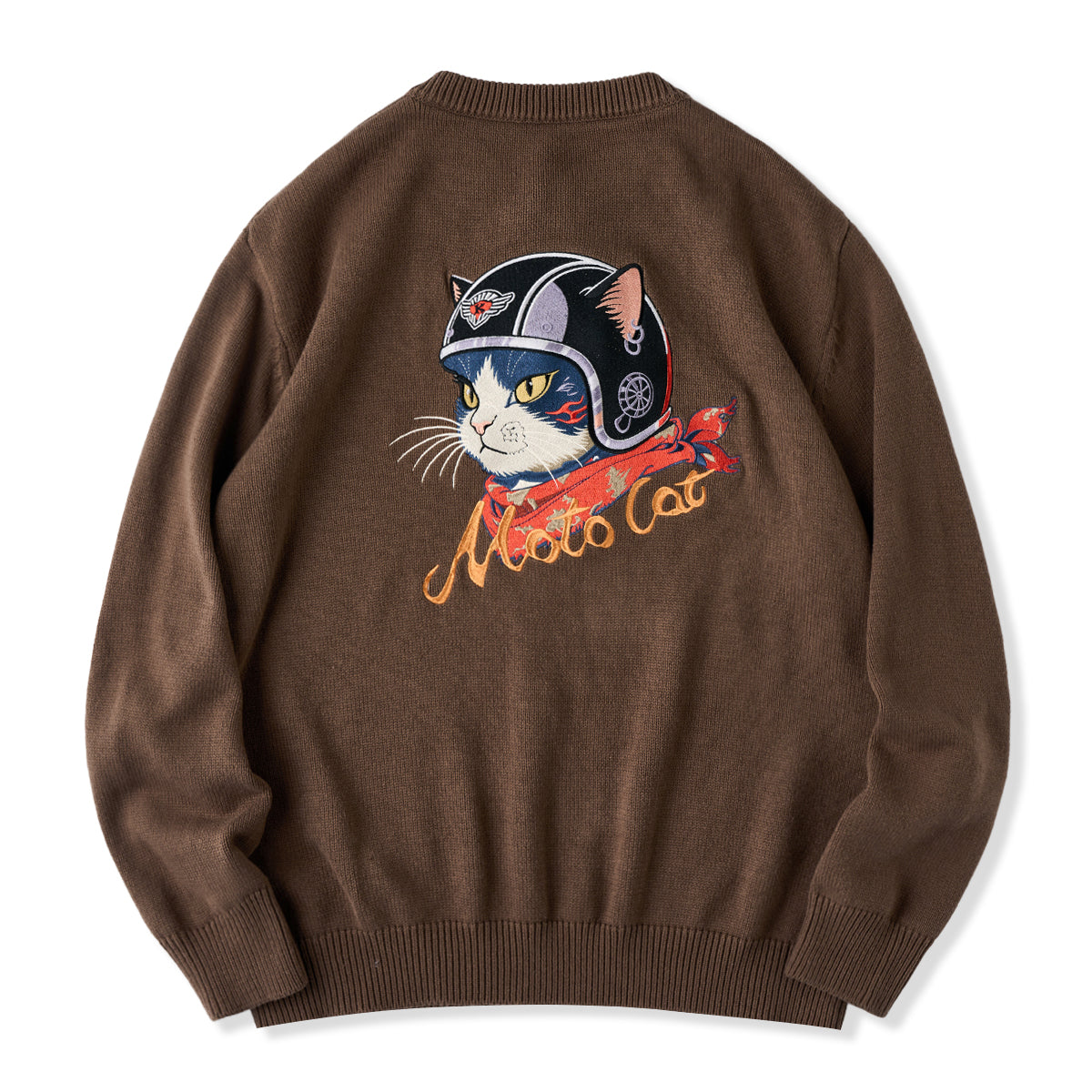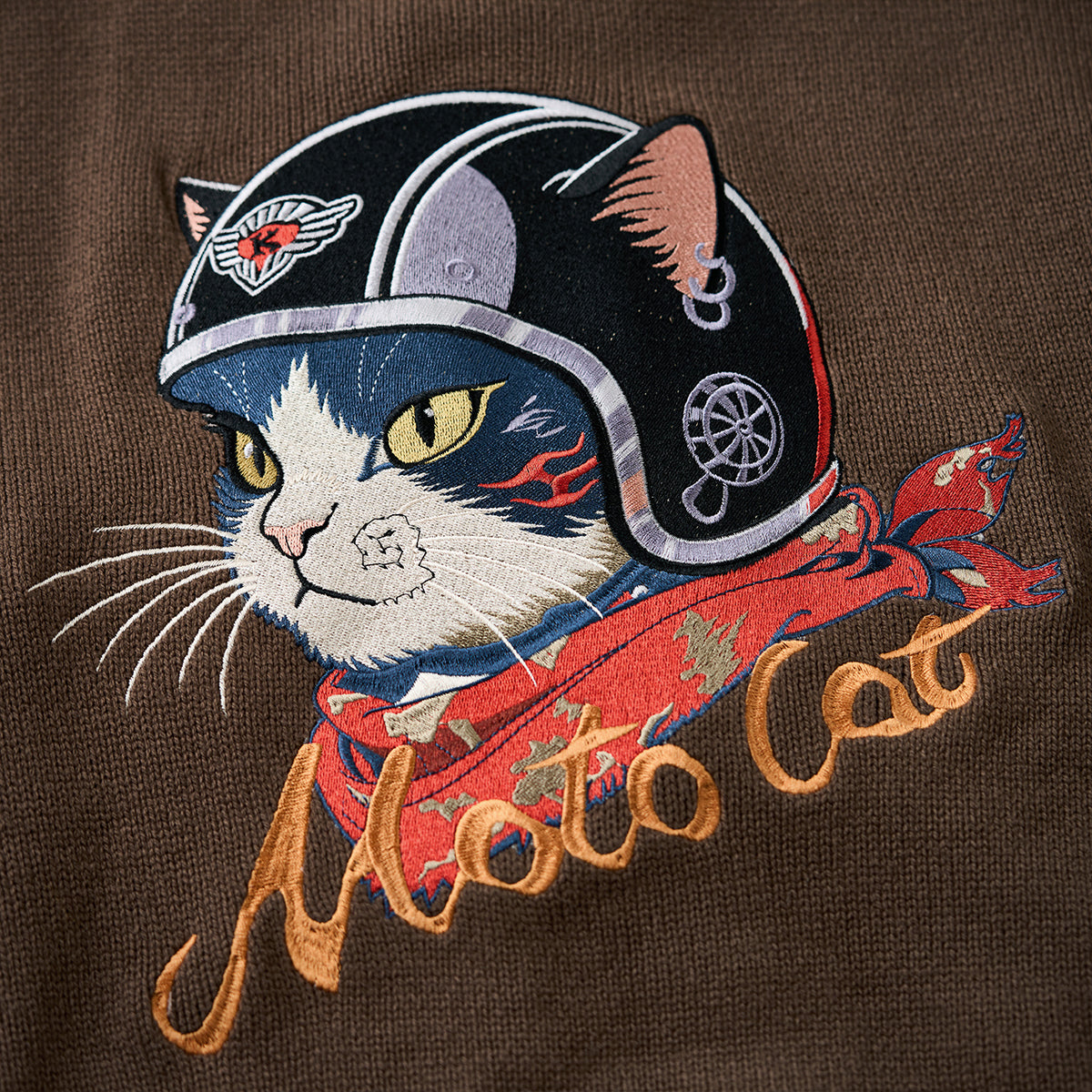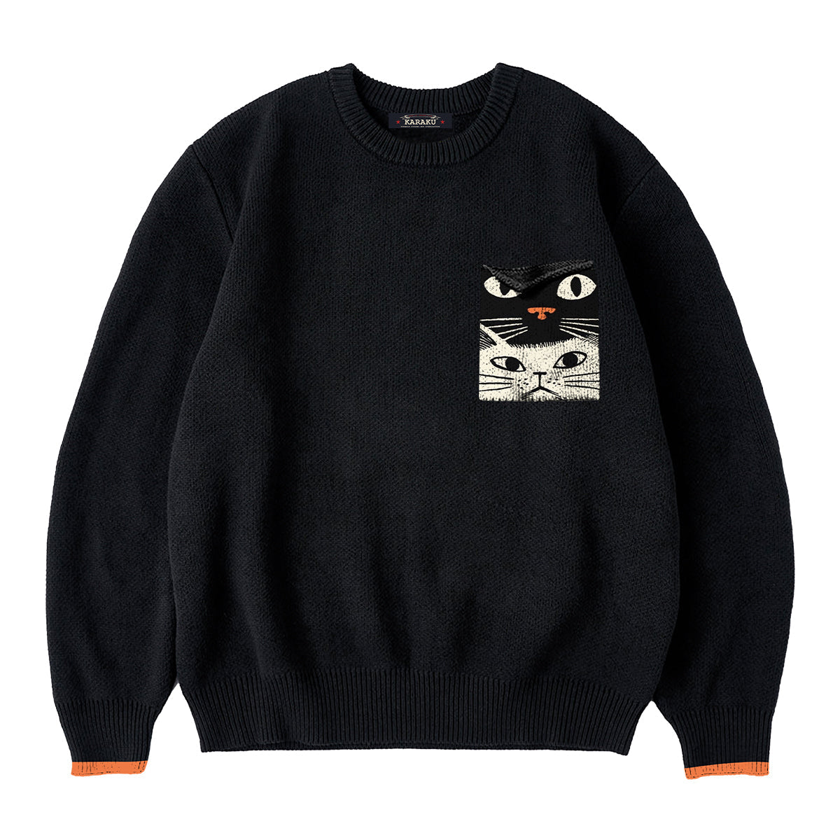 「헬멧 쓴 고양이」자수 & KARAKU 로고 자수 헨리넥 니트 스웨터