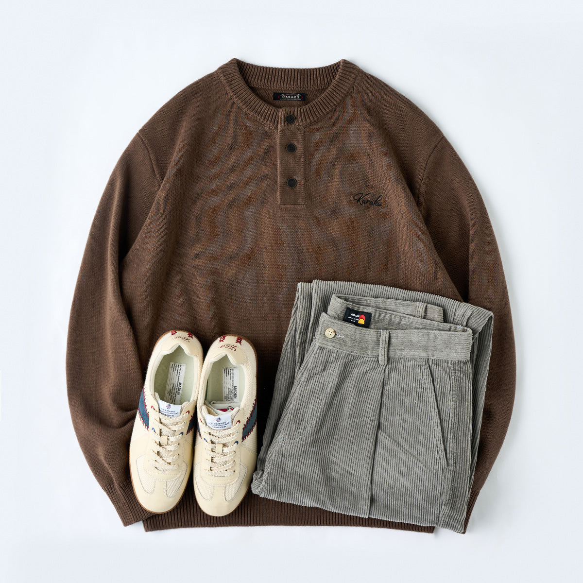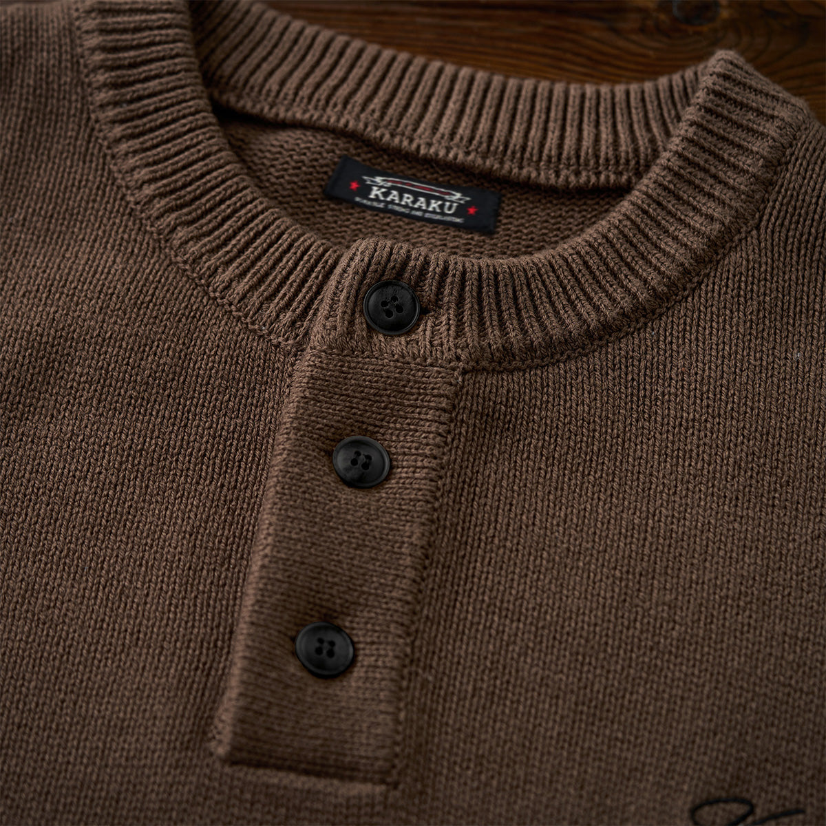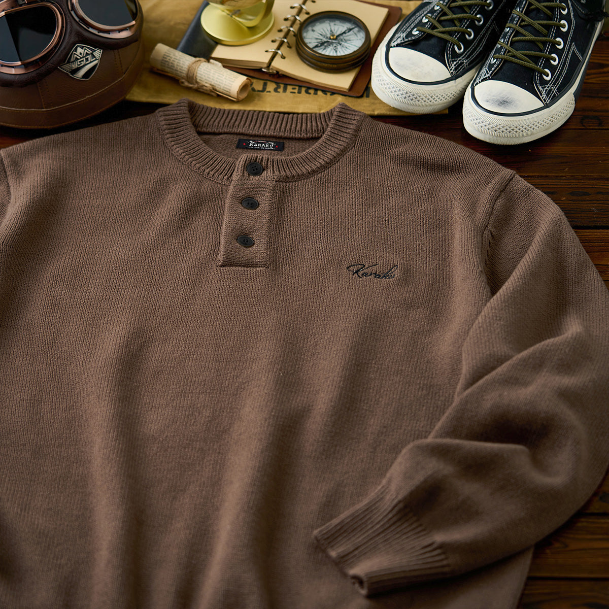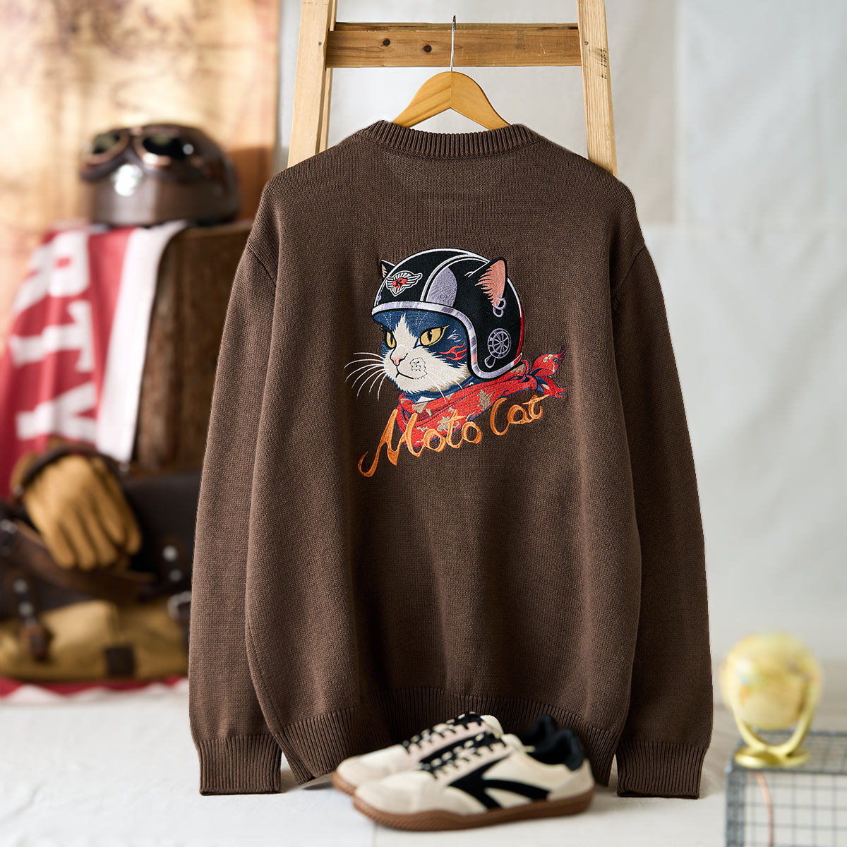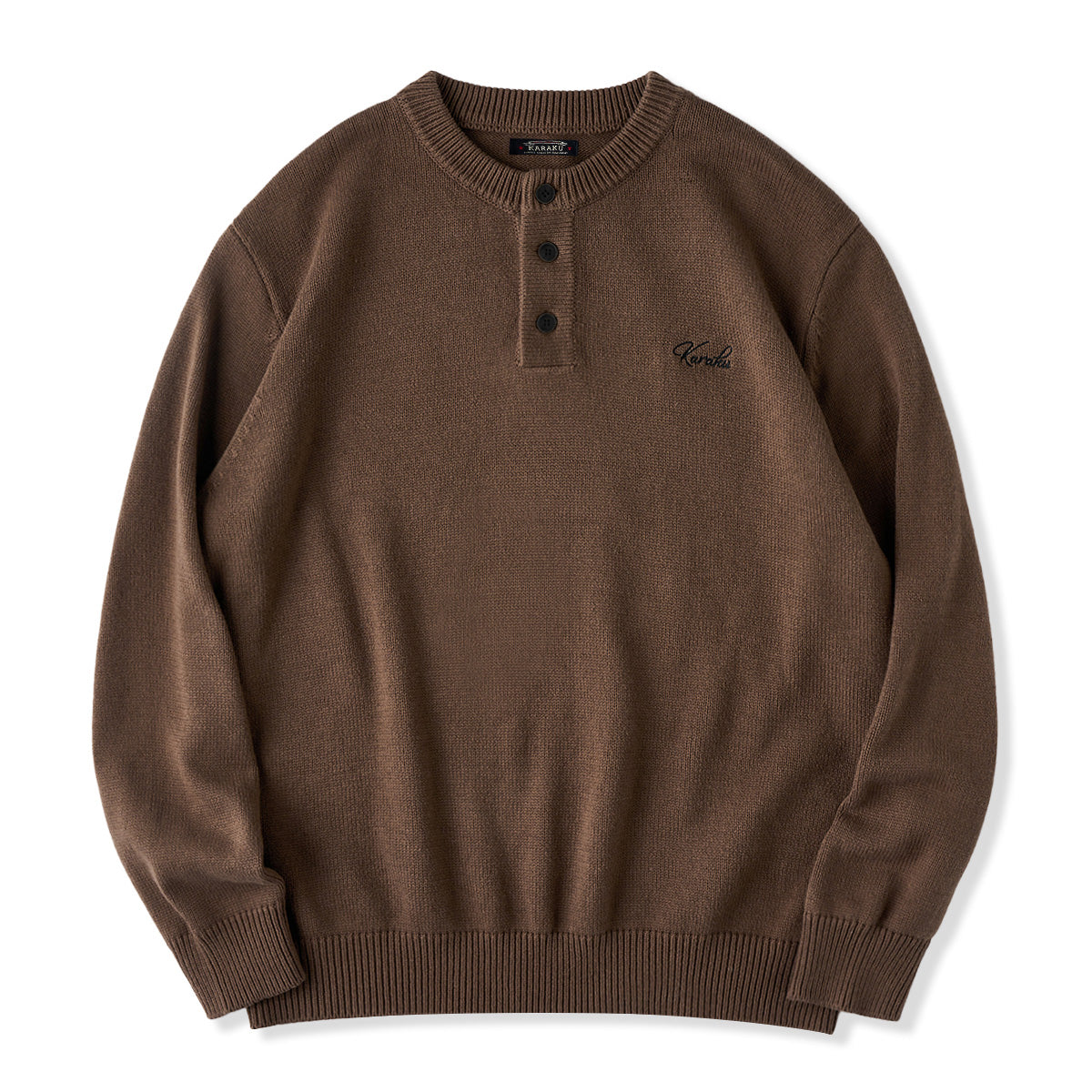 「헬멧 쓴 고양이」자수 & KARAKU 로고 자수 헨리넥 니트 스웨터